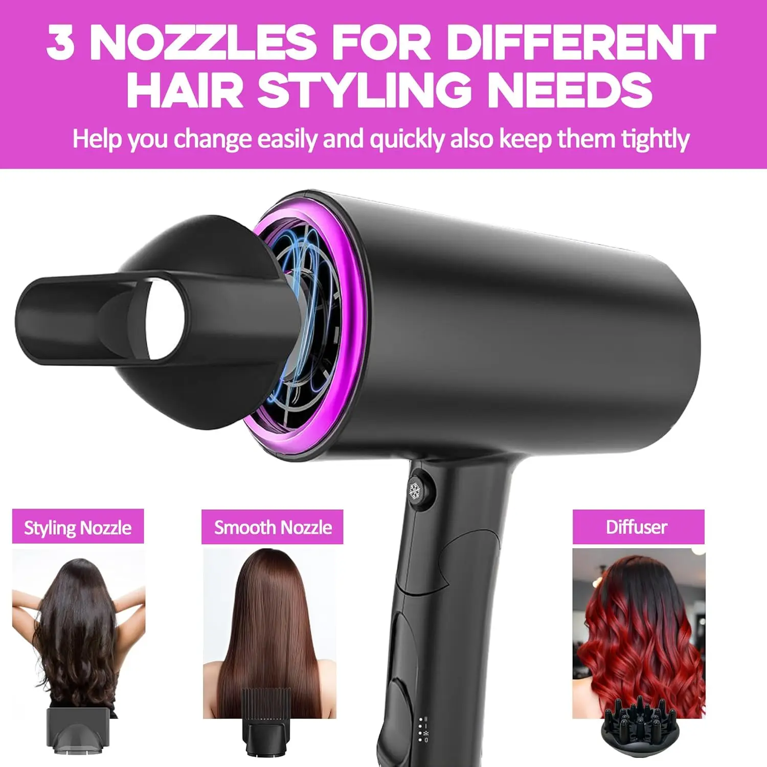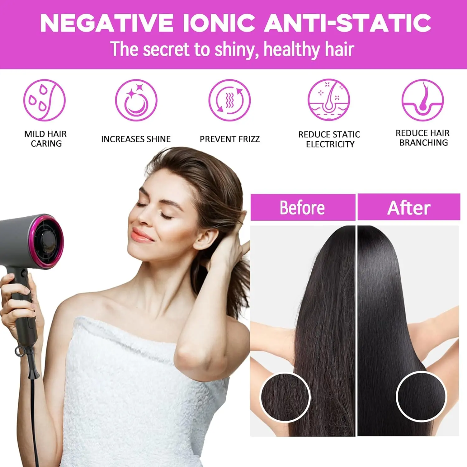 Experience salon-quality results at home with our 1800W Ionic Hair Dryer. This powerful blow dryer is engineered for fast and efficient drying, while prioritizing the health and shine of your hair. Featuring advanced air collection technology and a wide air duct structure, it distributes heat evenly, maintaining a constant temperature to prevent damage and frizz. Say goodbye to brittle, dry hair and hello to soft, glossy locks. Our professional-level hair care technology repairs hair scales and deeply nourishes each strand, promoting long-term health and radiance.