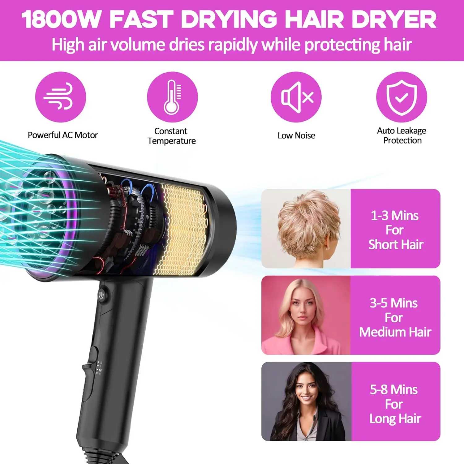 This 1800W ionic hair dryer delivers fast drying with constant temperature control and negative ion technology for healthy, frizz-free hair. Includes attachments and a foldable design.