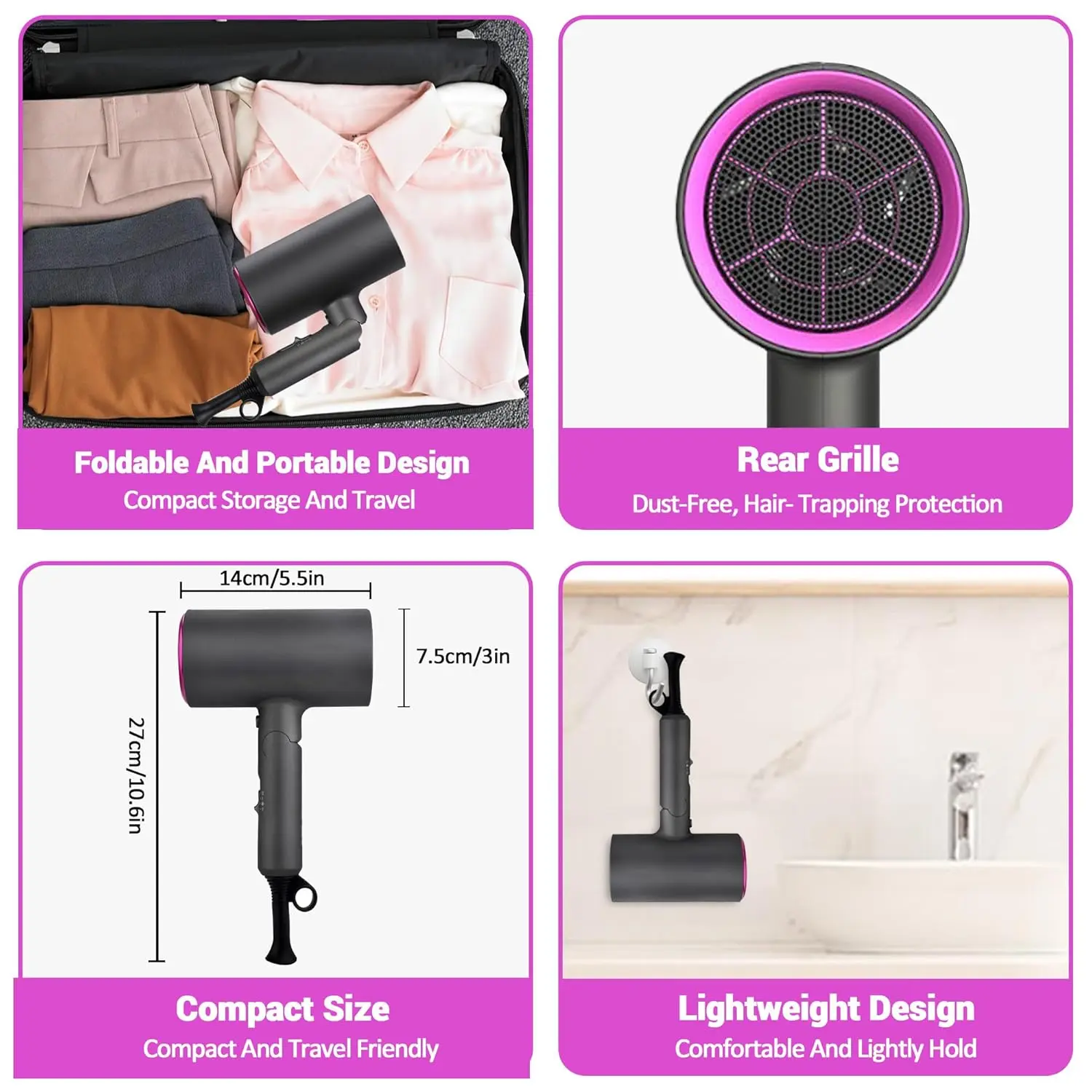 We understand that every hair type is unique. That’s why our foldable hair dryer comes with a comprehensive set of accessories, including 2 concentrators for focused styling, 1 diffuser for enhancing natural curls, a pair of combs for detangling and smoothing, and a storage bag for convenient organization. The fine mesh air inlet on the back of the dryer prevents hair and dust from entering the machine, extending its lifespan. The filter is also easily removable and cleanable. Its foldable design and hook, perfect for storage