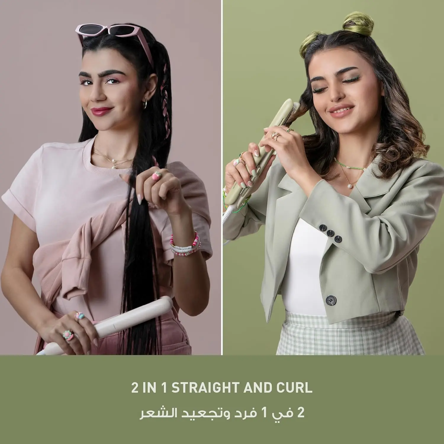 Effortlessly switch between sleek, straight styles and bouncy, beautiful curls with this innovative 2-in-1 Hair Straightener and Curler. Designed for ultimate versatility, this styling tool allows you to create a multitude of looks with just one device, making it perfect for any occasion. Say goodbye to cluttered vanities and hello to streamlined styling! Achieve smooth, shiny, and healthy-looking hair with our advanced ion technology. This hair iron features dual ion emitters that release high-frequency ions, working in tandem with a consistent temperature to enhance smoothness and shine. The even heat distribution, facilitated by our 3D water-based ceramic coated floating plates, ensures one-stroke styling without snagging, leaving your hair looking flawless every time. Choose from stylish Matcha Green or Sakura Pink colors to brighten your daily hair routine. The sophisticated, sleek design also makes it a perfect gift. With 6 temperature settings, including 5 manual controls and a quick-access button for reaching 185 ˚C in seconds, you have complete control over your styling experience. The heating plates maintain a consistent temperature, ensuring even heat distribution for optimal results. Experience the convenience and quality of a professional styling tool in the comfort of your own home.
