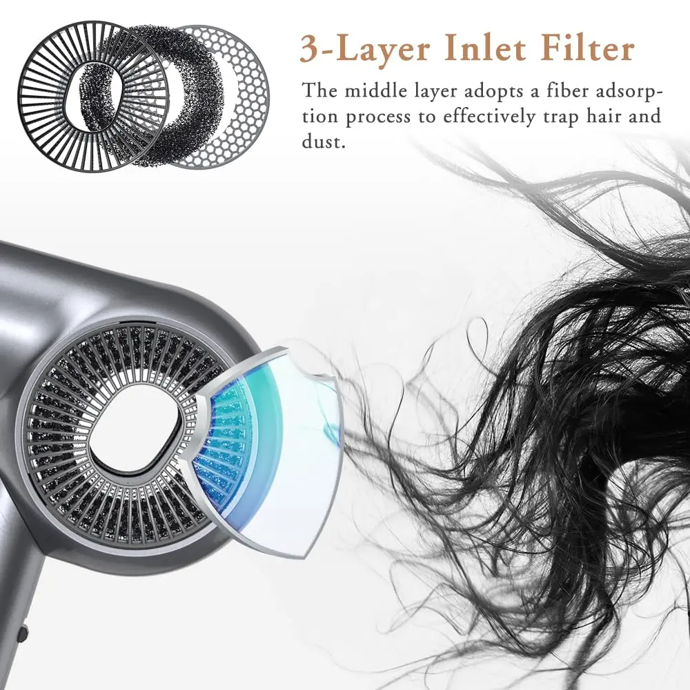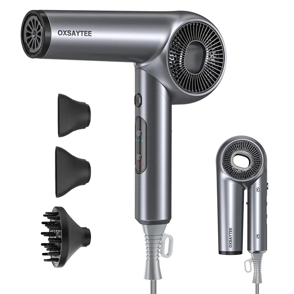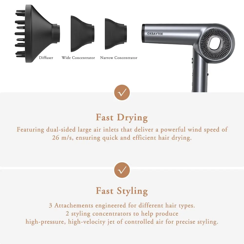 Experience salon-quality hair drying in the comfort of your own home with our 2000W Fast Drying Ionic Hair Dryer. This upgraded version features a powerful 2000W HTDC motor that delivers a high-speed airflow, significantly reducing drying time compared to traditional hair dryers. Save valuable time and enjoy faster, more efficient styling. Our ergonomic handle design ensures a comfortable grip, minimizing arm fatigue during use. Say goodbye to frizz and hello to healthy, lustrous hair. Our advanced air collection technology and wide air duct structure distribute heat evenly, maintaining a constant temperature to prevent heat damage. This ensures that your hair remains smooth and frizz-free after each use. Enjoy professional-level hair care as the dryer deeply nourishes your hair, repairs hair scales, and promotes long-term softness and shine. Negative ion technology effectively eliminates static electricity and frizz, preserving the natural moisture of your hair and reducing protein damage. This results in hair that is soft, smooth, and manageable. Customize your styling experience with 3 precise speed settings (Low/Med/High) and 4 heat levels (Cool/Low/Med/High). Easily control the temperature and airflow to match your specific hair type and create your favorite hairstyles at home. The included accessories, consisting of 1 smooth concentrator and 2 styling nozzles, provide versatile styling options for all hair types and styles. The fine mesh air inlet on the back of the dryer effectively prevents hair and dust from entering the machine, extending its lifespan. The air filter is easily disassembled and cleaned for convenient maintenance. A hook design and holder make portability and storage simple. This hair dryer is equipped with a safety plug to protect you and your family from short circuits caused by leakage, ensuring a safe and worry-free experience. Its sleek design and functionality make it an ideal gift choice for birthdays, Mother’s Day, Christmas, or any special occasion. We offer a 12-month free return and exchange policy. If you have any questions or concerns, please don’t hesitate to contact us.