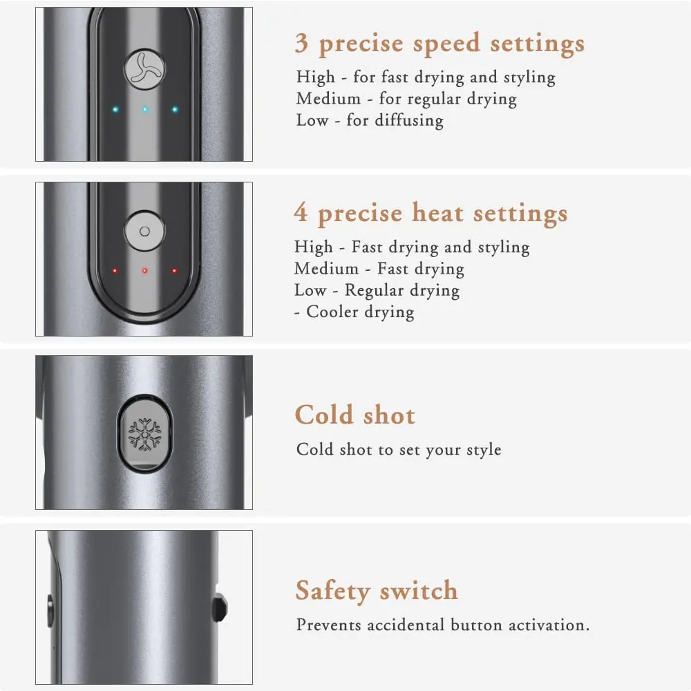 • Customizable Settings: 3 Speeds & 4 Heat Levels for all hair types.