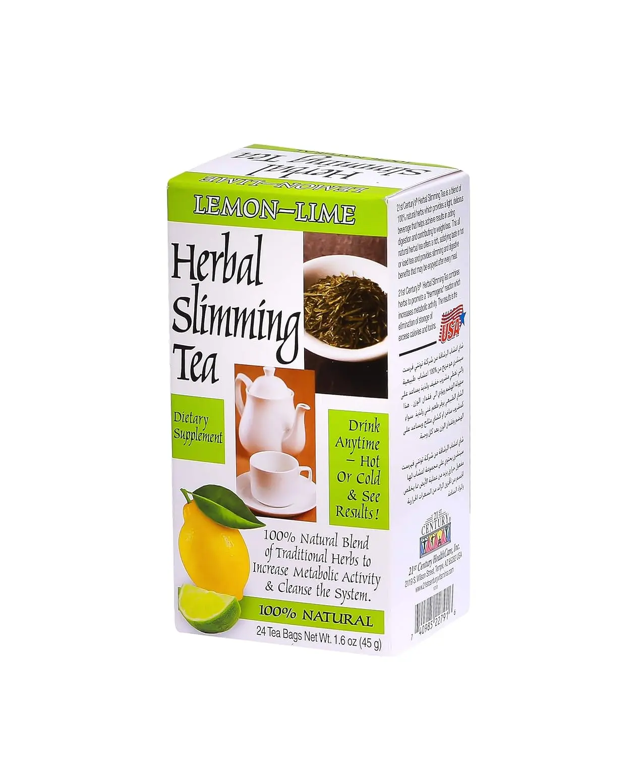 Unleash your body’s natural potential with 21st Century Slimming Tea Lemon Lime! This delicious and invigorating beverage is expertly crafted from a natural blend of traditional herbs, designed to boost your metabolic activity and support your weight loss journey. Enjoy it hot or cold, any time of day, as a refreshing and beneficial addition to your routine. Our unique formula not only aids digestion but also helps your body eliminate the storage of excess calories and unwanted toxins. Experience the power of nature working harmoniously to help you achieve your wellness goals with every sip. This carefully selected blend helps in breaking down fats and sugars to increase energy levels. It also has a detoxifying effect that eliminates toxins, which helps prevent bloating, and promotes a healthy digestive system. Make 21st Century Slimming Tea Lemon Lime your daily ritual and embark on a path to a healthier, happier you.