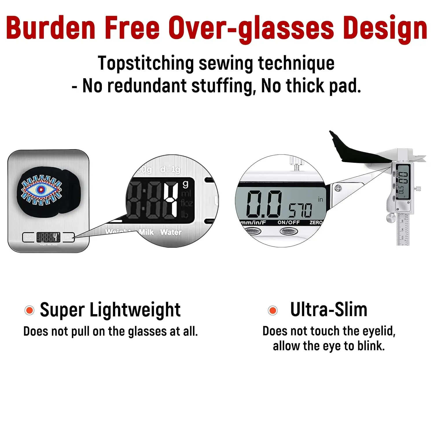 • Super Lightweight Over-glasses Design: Does not pull on glasses, no thick pad touches the eyelid.