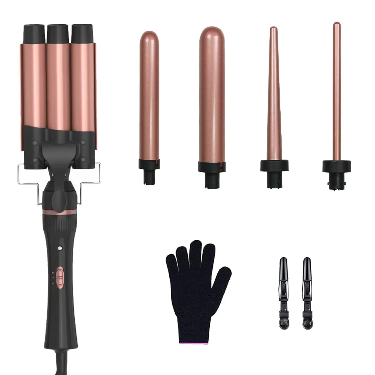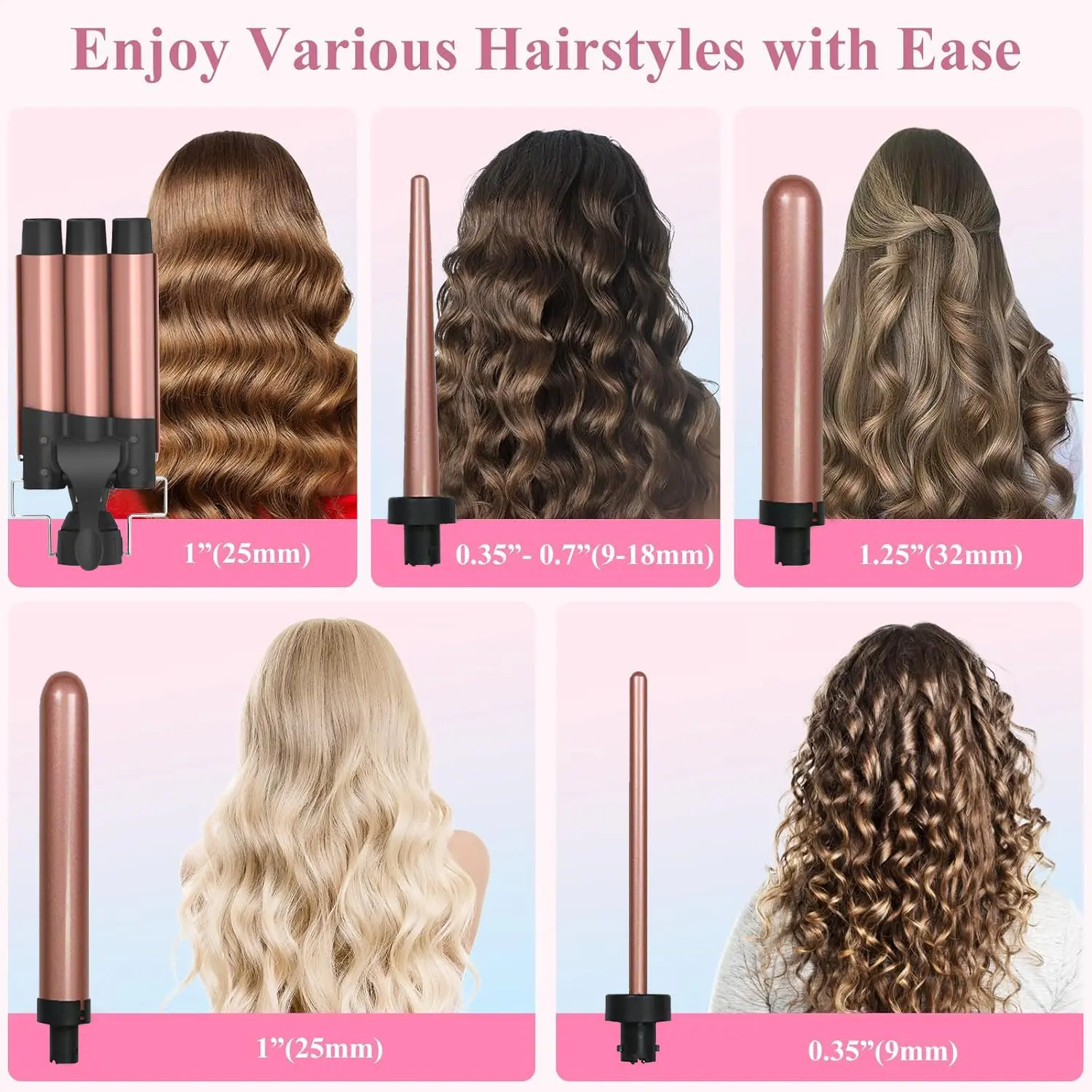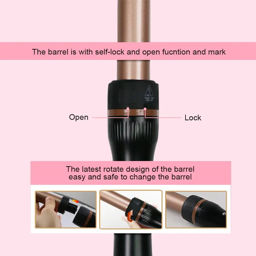 • 5 Interchangeable Barrels: Triple barrel, tapered wand, thin curler, and two classic sizes.