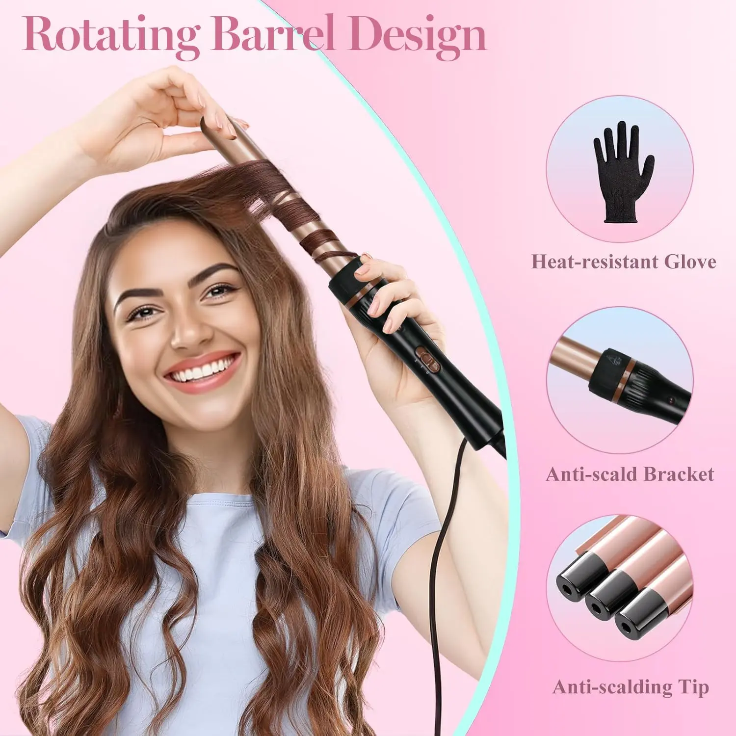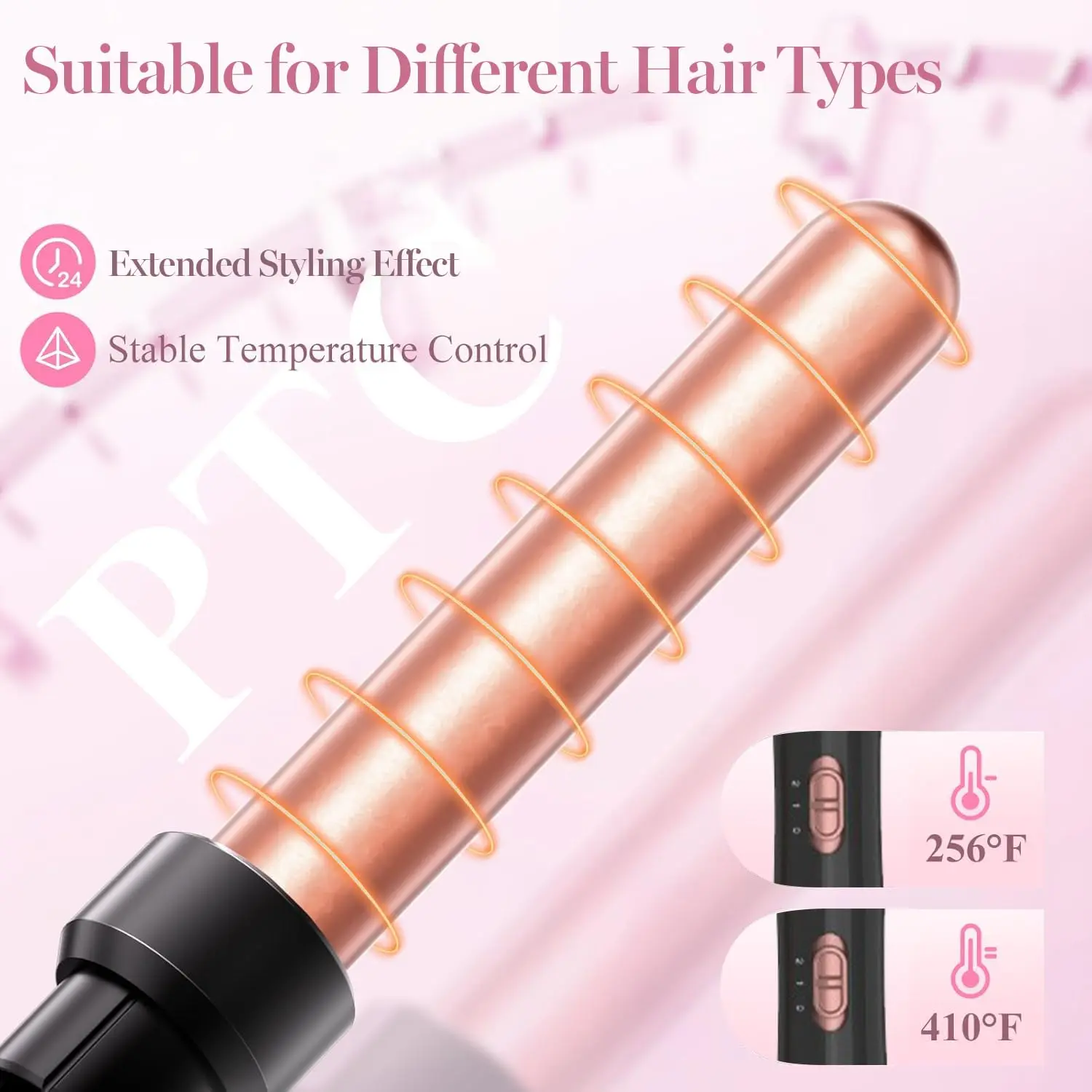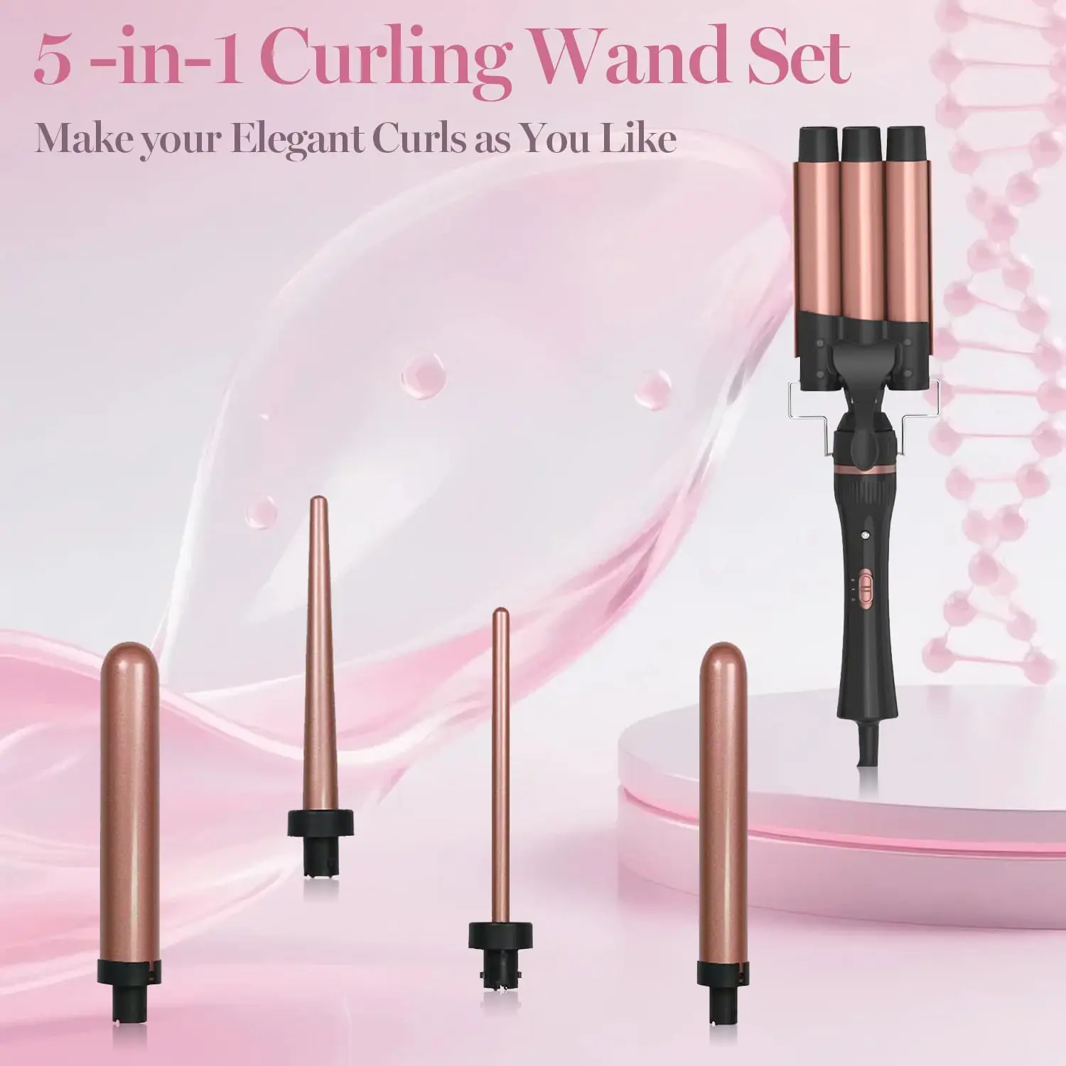 • 5 Interchangeable Barrels: Triple barrel, tapered wand, thin curler, and two classic sizes.