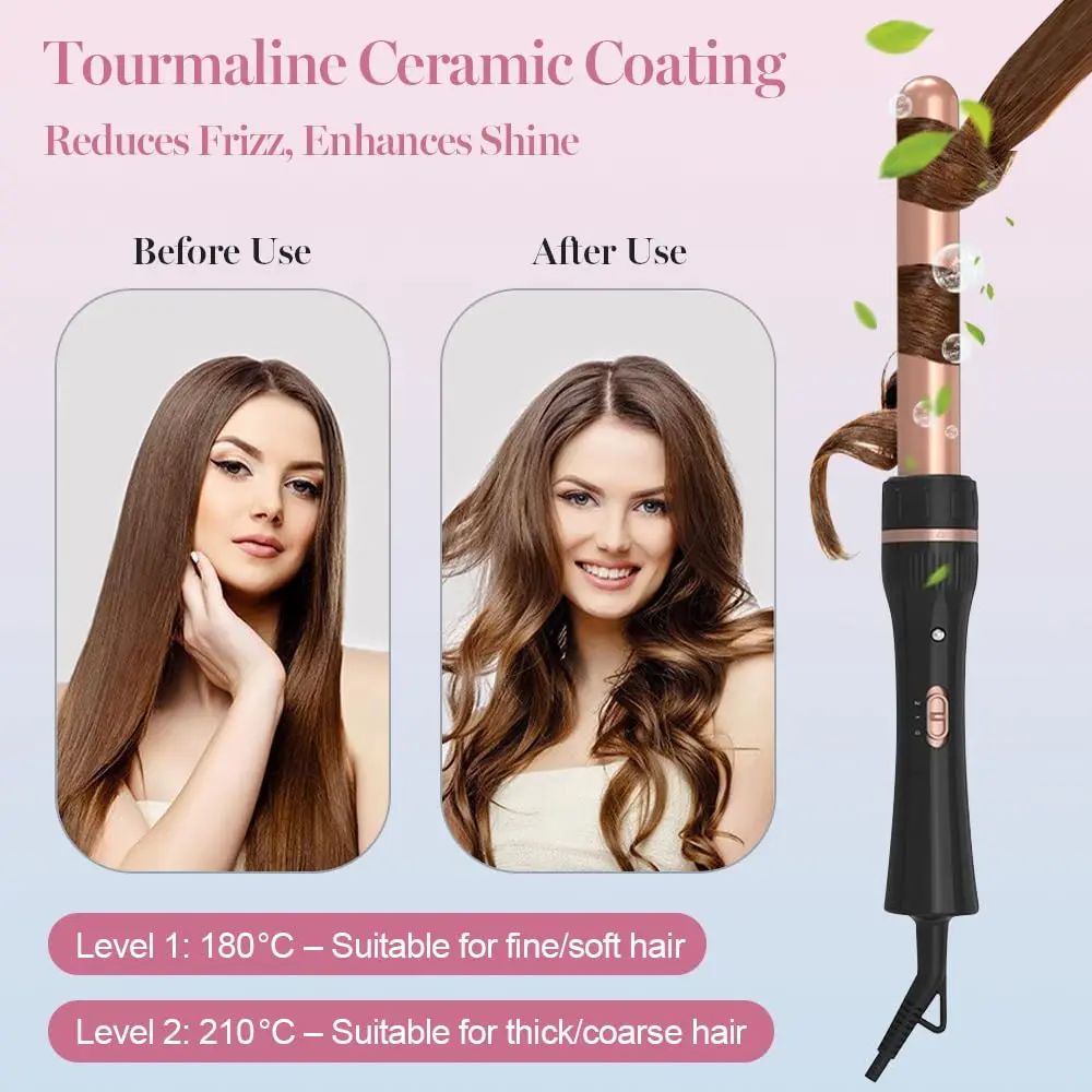 Unleash your inner stylist with our Versatile 5-in-1 Curling Iron Set! This innovative hair styling tool empowers you to create a myriad of stunning looks, from bouncy curls to beachy waves, all with a single device. No need to clutter your vanity with multiple curlers – this interchangeable set has you covered. Featuring five unique barrels, including a triple barrel for effortless waves, a tapered wand for natural-looking curls, a thin curler for tight ringlets, and two classic barrel sizes for versatile styling, the possibilities are endless. Whether you’re getting ready for a casual day out or preparing for a special occasion, this set provides the perfect tools to achieve your desired hairstyle. The quick-heating PTC technology ensures the curler is ready to use in just 30 seconds, saving you valuable time. The dual temperature control allows you to customize the heat setting to suit your hair type, whether it’s fine, thick, or somewhere in between, ensuring optimal results without causing unnecessary damage. The tourmaline ceramic coating on each barrel promotes even heat distribution, reducing heat damage and sealing in moisture for shiny, frizz-free curls that last. The secure locking system keeps the barrels firmly in place during use, providing a safe and stable styling experience. The lightweight and ergonomic handle ensures a comfortable grip, reducing fatigue even during longer styling sessions. Designed for global use with 110-240V dual voltage, this curling iron set is perfect for travel. It also makes a thoughtful and practical gift for yourself, family, or friends on birthdays, holidays, or any special occasion. Complete with a heat-resistant glove and two hair clips for added safety and convenience, this 5-in-1 curling iron set is a must-have addition to any hair care routine.