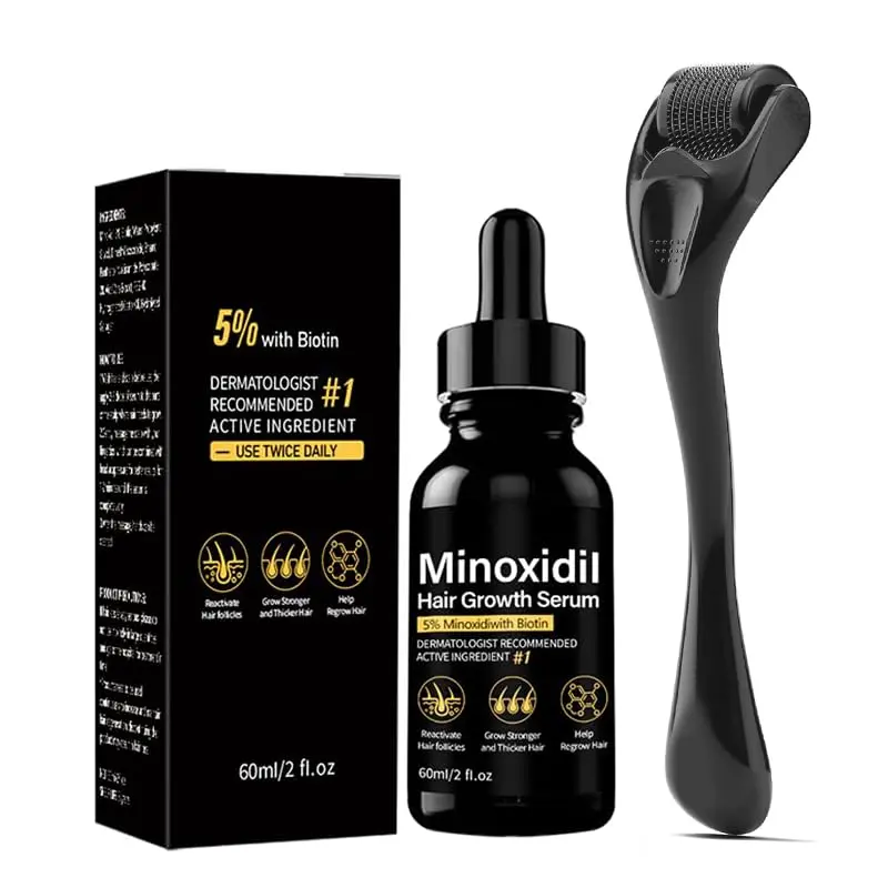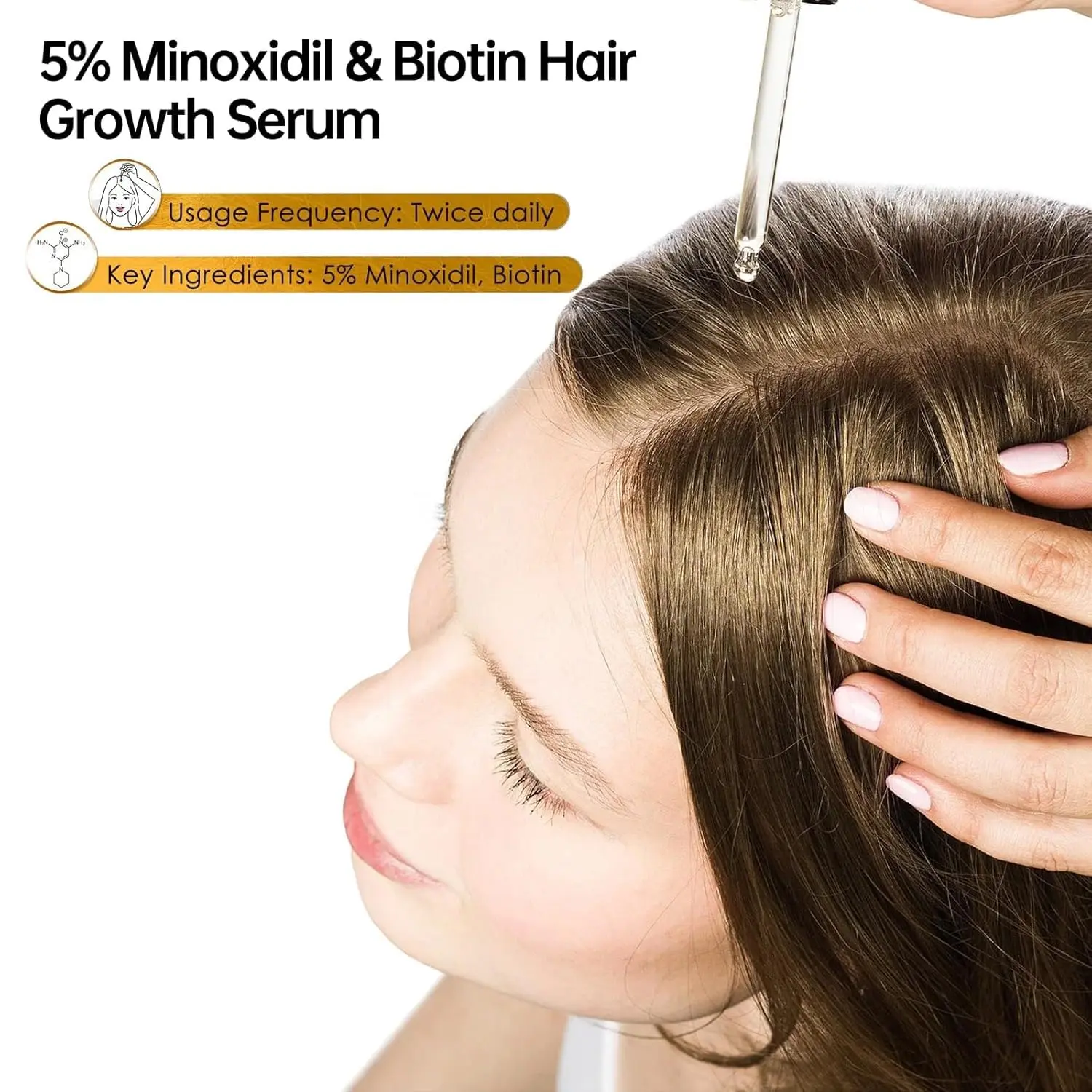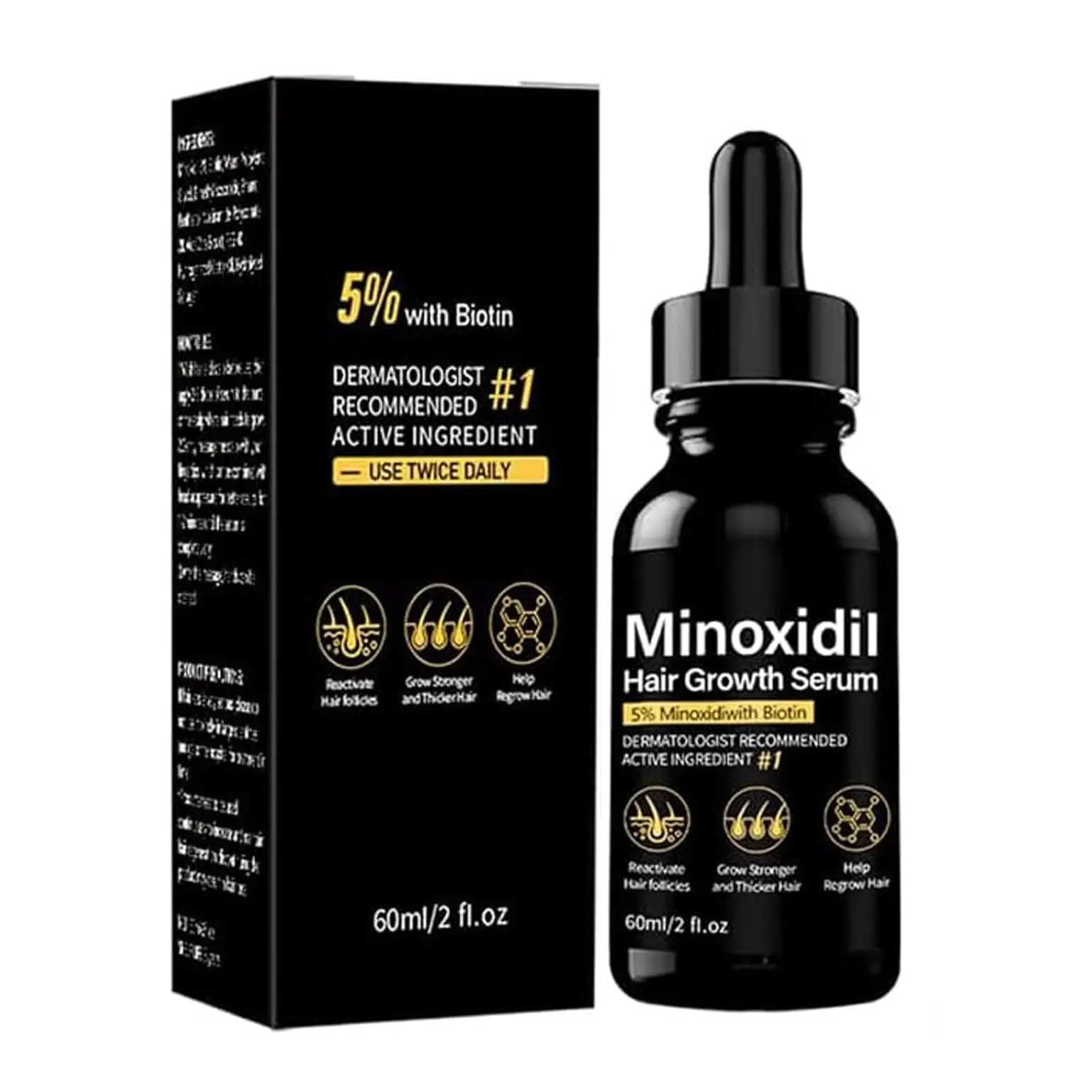Revitalize your hair and stimulate growth with our powerful 5% Minoxidil Hair Growth Serum. This advanced formula, suitable for both men and women, is designed to combat thinning hair, repair damage, and promote a healthier, fuller appearance. Infused with biotin, our serum not only strengthens fragile hair but also nourishes the scalp for optimal hair follicle health. Experience the transformative effects of a serum that works beyond the scalp, functioning as a beard growth stimulant as well. Our carefully formulated blend is gentle on all hair types and boasts natural ingredients that support overall scalp health. Incorporate this effortless treatment into your daily routine to achieve and sustain lasting results. Consistency is key – apply directly to the affected area on clean, dry hair or beard, gently massaging until fully absorbed, twice daily (morning and evening). Use 1ml (about 3-4 pumps) directly onto the scalp or beard in areas affected by hair loss. Discover the confidence that comes with thicker, healthier-looking hair and a fuller beard. Our serum is meticulously crafted to stimulate hair growth, fortify follicles, and reduce hair loss in multiple areas, providing a comprehensive solution for your hair and beard growth needs.Unlock your hair’s full potential with our easy-to-use, effective serum.