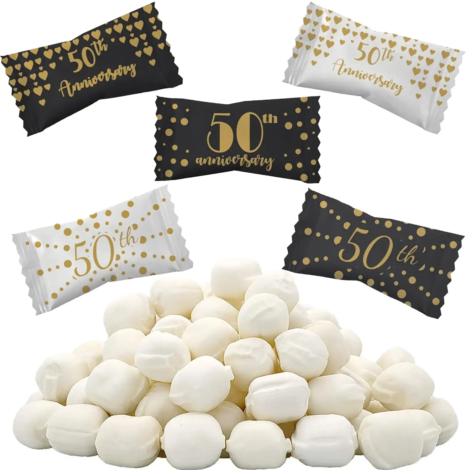 Celebrate in sweet style with our 50th Anniversary Buttermints! These classic butter mint candies are the perfect addition to any celebration, offering a smooth, creamy texture that melts in your mouth. Each buttermint is individually wrapped, making them ideal for party favors, parades, and candy buffets. They’re a delightful after-dinner treat or a sweet pick-me-up anytime. Choose the perfect party size packaging for your needs – available in 55, 110, or 330 buttermints per bag. Rest assured, these delicious mints are gluten-free, fat-free, kosher, and contain no trans fat, so everyone can enjoy them. Proudly made in the USA, our 50th Anniversary Buttermints are a testament to quality and taste. Add a touch of elegance and sweetness to your next themed celebration, party, or event with these irresistible butter mints. Whether you’re commemorating a milestone anniversary or simply want to add a touch of classic charm to your gathering, these buttermints are sure to be a hit. Their smooth and creamy texture, combined with the refreshing mint flavor, creates a truly delightful experience. They are perfect for receptions, corporate events, or even as a small treat for yourself. Their versatility and delicious taste make them a guaranteed crowd-pleaser. The individually wrapped nature ensures freshness and hygiene, so you can confidently share them with your guests. Stock up on these timeless classics and make your next event unforgettable!