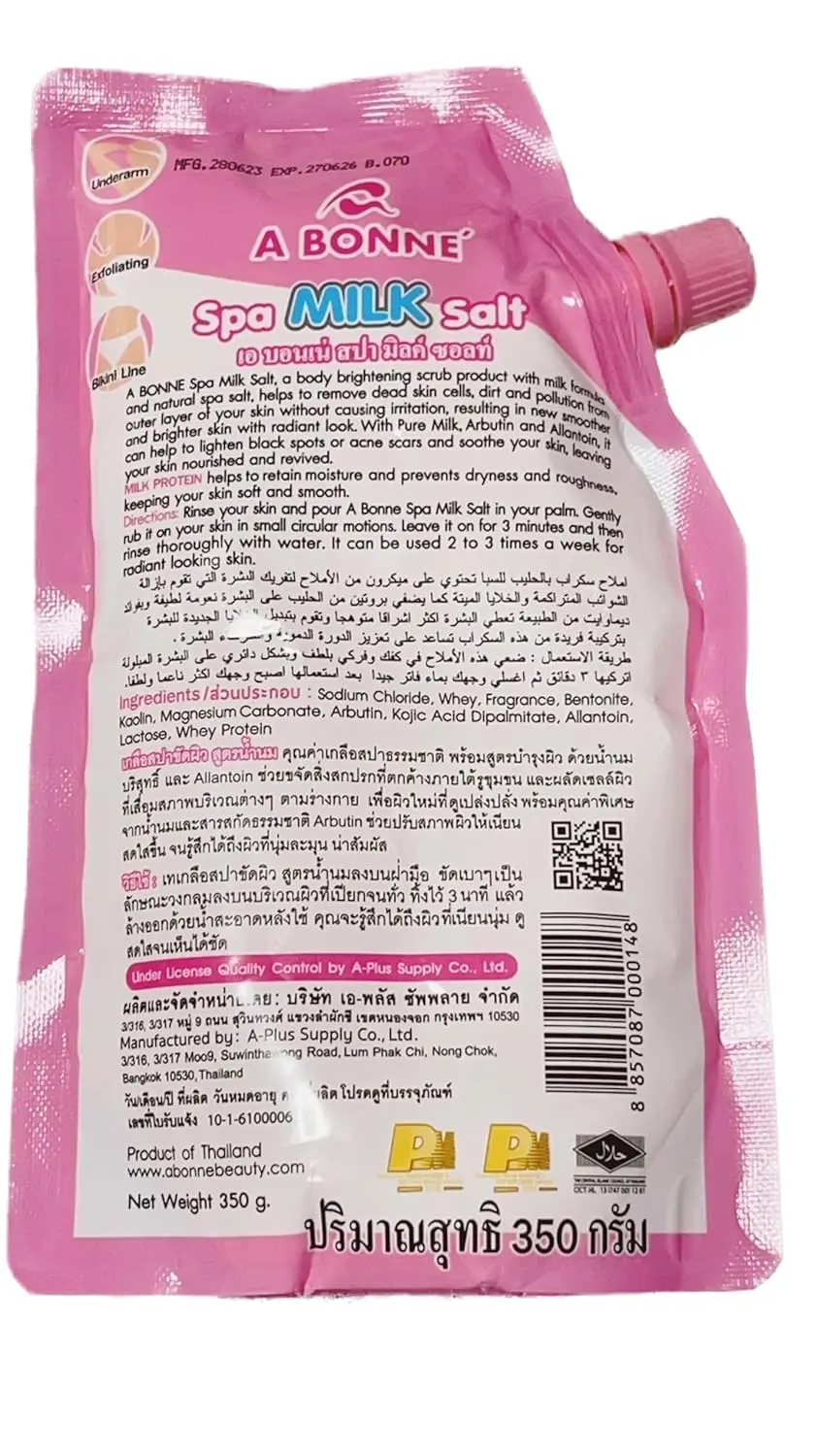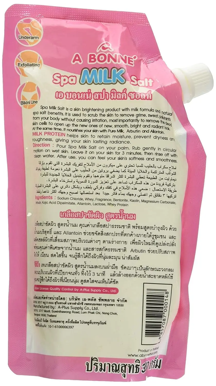 Transform your skin with A Bonne Spa Milk Salt, a luxurious and intensive whitening scrub designed to reveal a softer, smoother, and more radiant you. This special formula combines the exfoliating power of microized salt with the nourishing benefits of Milk Protein and the skin-brightening properties of Dermawhite. The microized salt gently removes dirt, oil, and dead skin cells, unclogging pores and promoting healthy skin renewal. Milk Protein deeply moisturizes and conditions, leaving your skin feeling incredibly soft and supple. Dermawhite, a natural whitening ingredient, helps to lighten skin tone and reduce the appearance of dark spots, revealing a brighter and more even complexion. A Bonne Spa Milk Salt not only exfoliates and whitens but also stimulates blood circulation, promoting relaxation and a healthy glow. The convenient packaging is designed for easy use, allowing you to pour, open, and close the container with ease, making your spa experience hassle-free. Experience the ultimate in skin pampering with A Bonne Spa Milk Salt and unveil your naturally beautiful and radiant skin. Indulge in this intensive spa treatment at home and enjoy the benefits of a professional spa experience without the expensive price tag. Say goodbye to dull, rough skin and hello to a revitalized, luminous complexion. A Bonne Spa Milk Salt is your secret to achieving soft, smooth, and beautifully whitened skin.