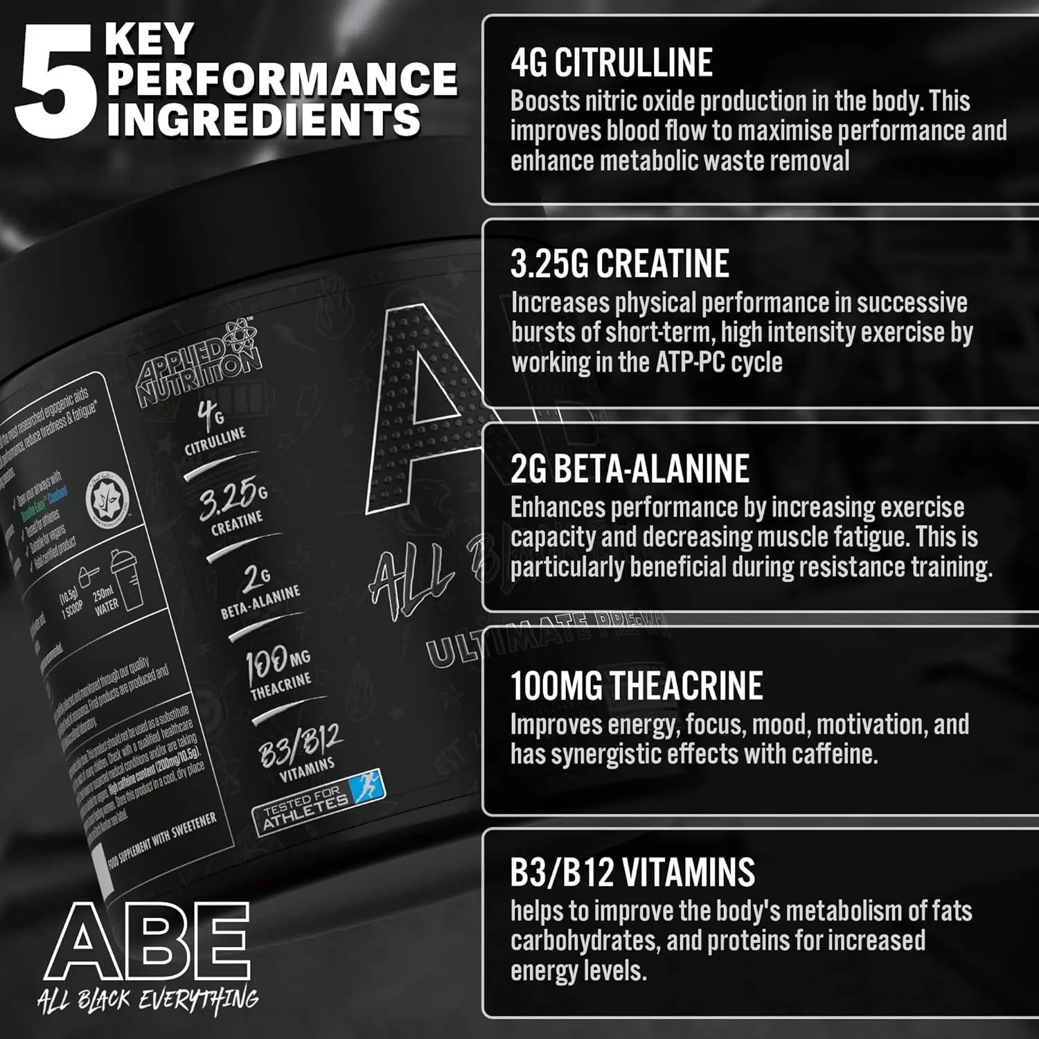 Feel the invigorating energy surge as you prepare to dominate your workout. ABE isn’t just about energy; it’s about optimized performance. The inclusion of Vitamin B3 promotes healthy blood fat levels, while Vitamin B12 supports normal red blood cell formation, contributing to overall vitality and well-being.