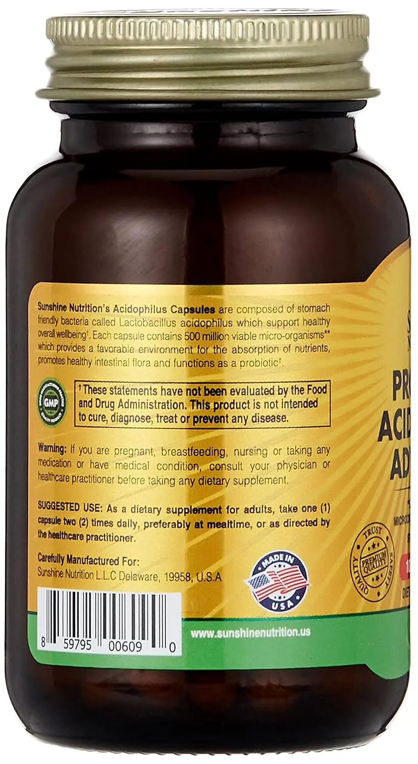 Support your digestive health with Sunshine Nutrition Probiotic Acidophilus Advanced! These capsules are formulated with Lactobacillus acidophilus, a stomach-friendly bacteria that aids in the digestive process and helps eliminate “bad” bacteria that can cause infections. Our advanced formula helps restore the normal balance of intestinal bacteria, which can be disrupted by various conditions, including antibiotic use. By replenishing beneficial bacteria, Acidophilus promotes healthy overall well-being and contributes to optimal gut health. Choose Sunshine Nutrition for a reliable and effective probiotic supplement. Maintaining a healthy gut flora is crucial for overall health, and our Acidophilus supplement is designed to support this important aspect of your well-being. Experience the difference with Sunshine Nutrition! Our Acidophilus capsules are easy to swallow and convenient to incorporate into your daily routine.