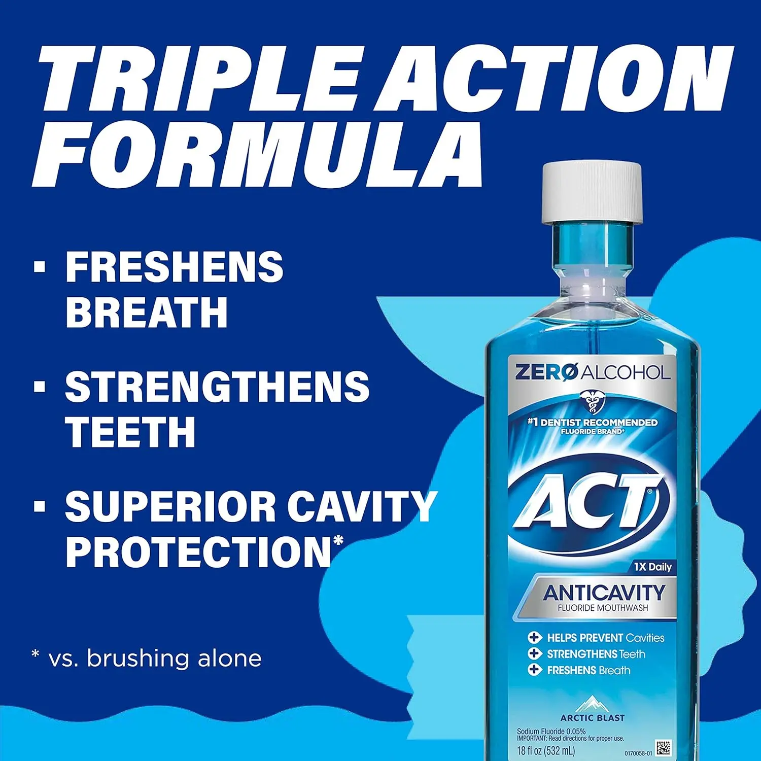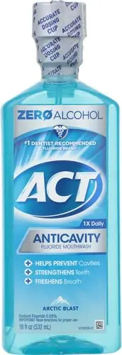 Experience the invigorating Arctic Blast of Act Anticavity Mouthwash and fortify your smile against cavities. This powerful mouthwash is designed to reach all those hard-to-reach places, delivering maximum fluoride protection to strengthen tooth enamel and prevent tooth decay. The refreshing Arctic Blast flavor leaves your mouth feeling clean and revitalized, providing a long-lasting freshness that you can feel. Act Anticavity Mouthwash is formulated with the maximum fluoride levels allowed in over-the-counter mouthwashes, ensuring optimal cavity prevention. Trust the brand recommended by dentists to help maintain a healthy and vibrant smile. Make Act Anticavity Arctic Blast Mouthwash a part of your daily oral hygiene routine and experience the difference. Not only does it fight cavities, but it also helps to freshen breath and remove plaque, contributing to overall oral health. This 18 oz bottle provides a generous supply of mouthwash, making it a cost-effective and convenient choice for the whole family. Protect your teeth and enjoy a refreshing clean with Act Anticavity Arctic Blast Mouthwash. The tingling sensation lets you know its working. Protect your smile’s future, get Act!