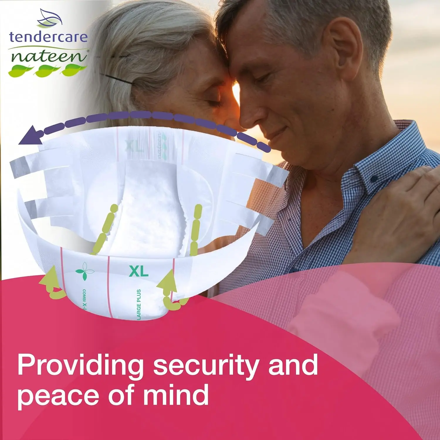Experience superior comfort and protection with Tendercare-Nateen Day Plus Adult Incontinence Nappies. This pack contains 40 extra-large nappies, providing reliable absorbency for daytime use. Designed for individuals requiring a high level of protection, these Day Plus nappies offer an impressive 3400 ml absorbency capacity, ensuring dryness and confidence throughout the day. The Large size is designed to fit waist sizes from 130cm to 175cm (51″-69″), offering a comfortable and secure fit. These nappies are discreetly packaged for your privacy and convenience. Trust Tendercare-Nateen for dependable incontinence management, allowing you to live your life with dignity and freedom. These nappies provide ultimate protection and comfort, allowing you to go about your day with confidence. The high absorbency core quickly locks away moisture, preventing leaks and keeping your skin dry. The breathable material helps to reduce the risk of skin irritation and promotes healthy skin. The secure fit ensures that the nappy stays in place, even during activity. The discreet design means that you can wear these nappies without worrying about them being noticed. These nappies are perfect for individuals with moderate to heavy incontinence. They are also suitable for use at night. With Tendercare-Nateen Day Plus Adult Incontinence Nappies, you can enjoy peace of mind knowing that you are protected from leaks and accidents. Choose Tendercare-Nateen for a reliable and comfortable solution to your incontinence needs.