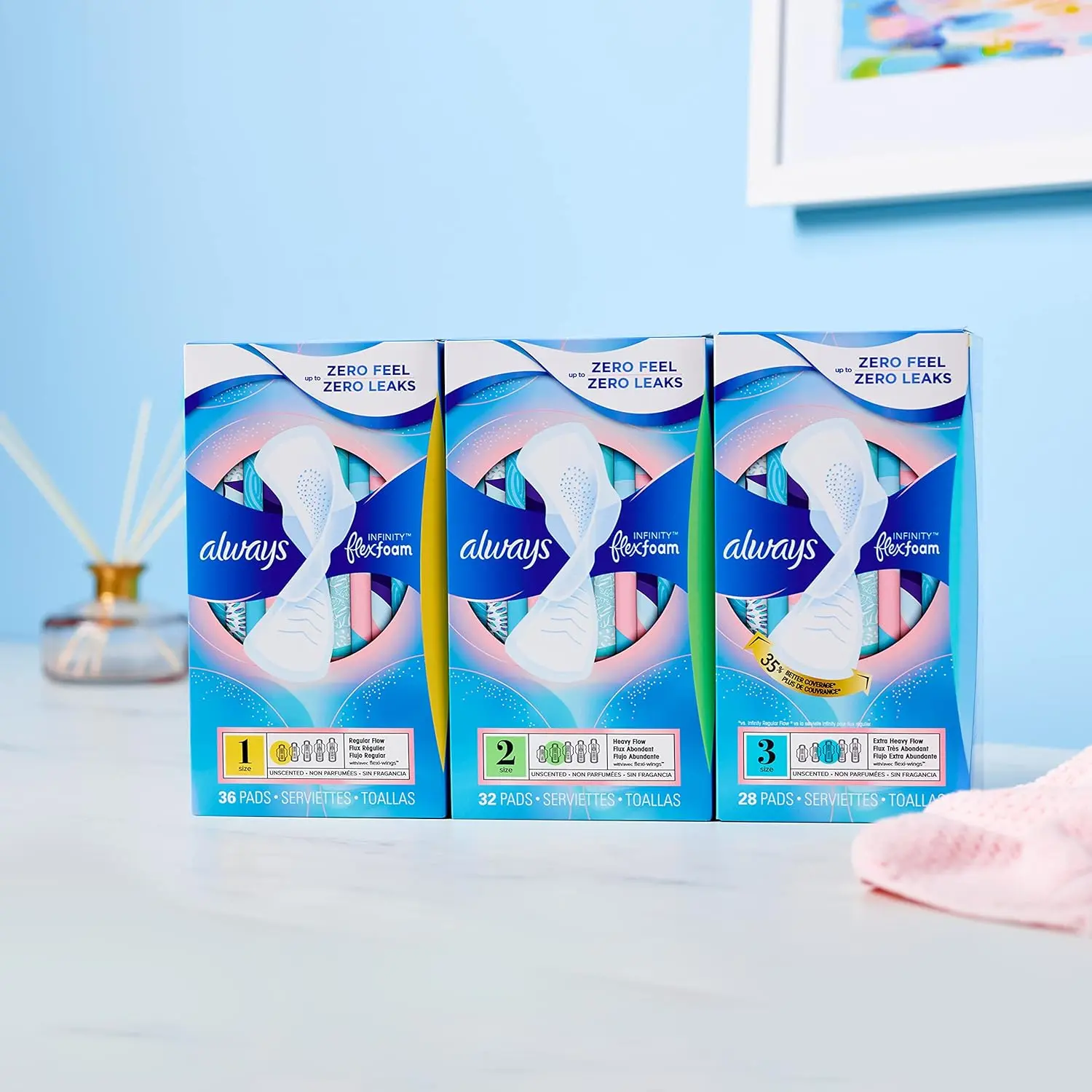 Experience revolutionary period protection with Always Infinity Pads featuring FlexFoam technology. Designed for heavy flow days, these pads offer unparalleled comfort and security, allowing you to live your life without compromise. Made with innovative FlexFoam, Always Infinity pads absorb 10 times their weight, ensuring zero leaks, even during your heaviest flow. The unique FlexFoam material contours to your body, moving seamlessly with you, eliminating bunching and discomfort. Its breathable top layer keeps you feeling fresh and dry throughout the day. Unlike traditional pads made with fluff, FlexFoam provides a remarkably thin and flexible experience, making you feel like you’re wearing nothing at all. Available in 5 different sizes, use the Always MyFit sizing chart to find your perfect fit and discover the ultimate in discreet and reliable protection. Say goodbye to bulky, uncomfortable pads and hello to the zero-feel confidence of Always Infinity. These pads are meticulously crafted to provide exceptional leak protection, so you can tackle your day with confidence and peace of mind. No more worrying about embarrassing accidents or constant adjustments. Always Infinity FlexFoam pads are designed to keep you feeling comfortable, secure, and in control, no matter what your day brings. The advanced absorption technology quickly locks away moisture, keeping you dry and comfortable for hours. The pads are also incredibly easy to use, with a secure adhesive backing that keeps them in place. Experience the difference of Always Infinity and embrace the freedom to live your life to the fullest, even on your heaviest days. With Always Infinity, you can confidently face any challenge, knowing that you’re protected by the ultimate in period care technology. Discover the zero-feel difference and say goodbye to the discomfort and inconvenience of traditional pads. Choose Always Infinity for unbeatable comfort, protection, and confidence.