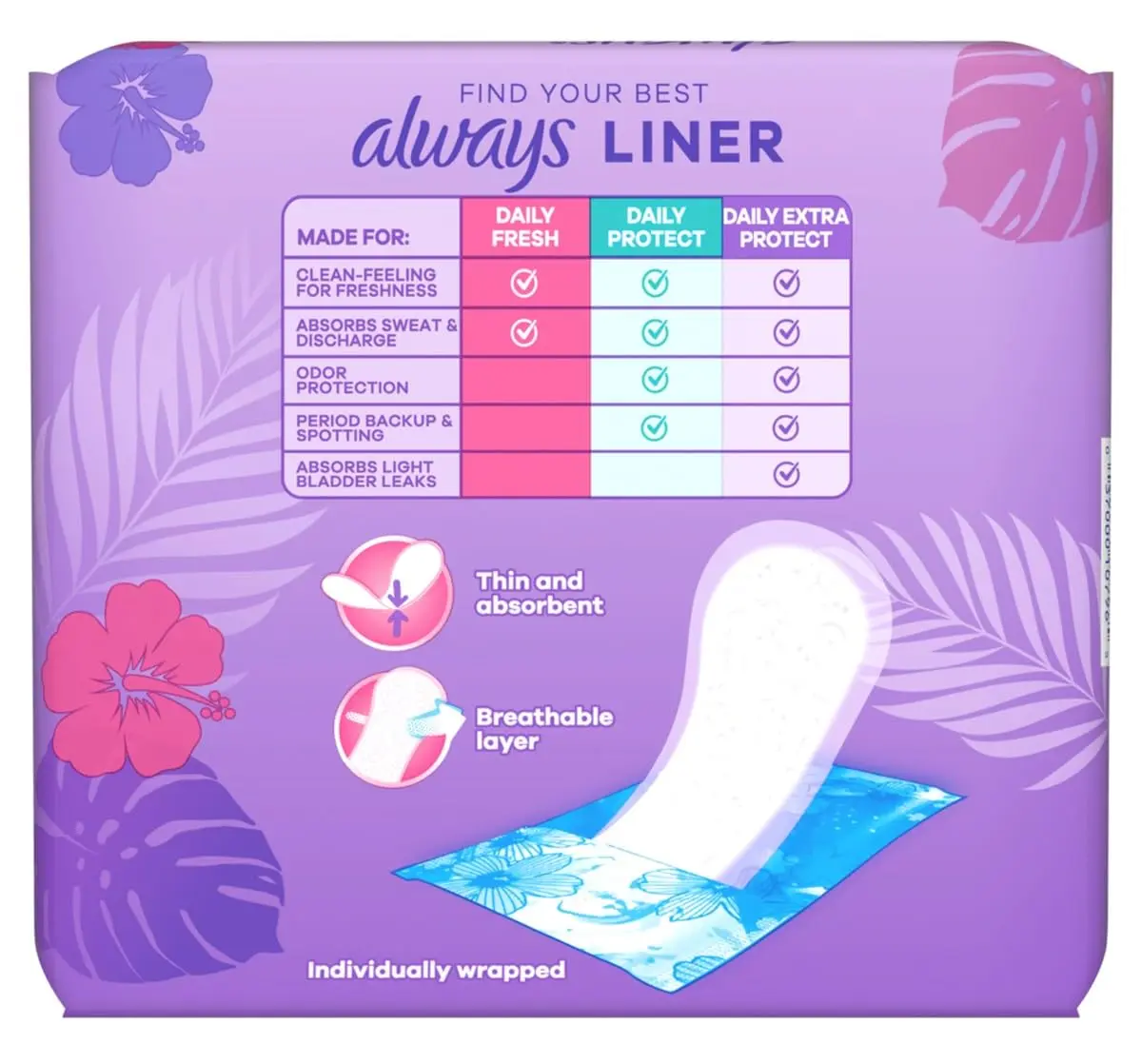 Experience everyday freshness and confidence with Always Thin Liners. These incredibly thin and comfortable pantiliners are designed to feel like fresh underwear, making them ideal for daily use. The breathable layer helps keep moisture away, ensuring all-day comfort and cleanliness. Whether you’re looking for an everyday clean feeling, need light flow protection, or want tampon backup, Always Thin Liners provide flexible protection you can rely on. Their so seamless design allows you to forget you’re even wearing them. The edge adhesive helps keep the pantiliner from shifting, so you can move with confidence. Available in Unscented, you can choose the option that best suits your needs. These thin daily liners will help you feel fresh and comfortable all day long. Each package contains 120 regular panty liners, with this pack containing 3 packages for a total of 360 liners, providing long-lasting value. Don’t forget to also explore Always Infinity and Tampax Pearl for other feminine care needs. With Always Thin Liners, embrace all-day freshness and cleanliness with a thin, comfortable design. Experience the freedom of movement and confidence knowing you have reliable protection. The discreet design is ideal for any outfit, and the breathable layer ensures lasting comfort. Say goodbye to worries about leaks or discomfort, and say hello to everyday freshness with Always Thin Liners. Perfect for active lifestyles, these pantiliners provide the peace of mind you need to tackle your day with confidence. Enjoy the feeling of fresh underwear all day long with Always Thin Liners.