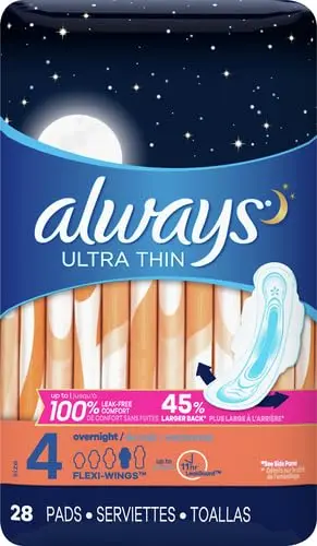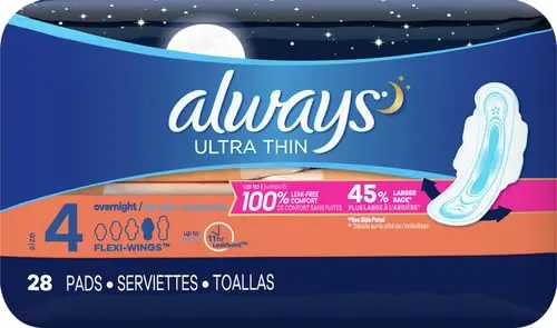 ALWAYS Ultra Thin Overnight Pads with Wings feature a flexible design that moves with you, providing unparalleled comfort and confidence. Experience ALWAYS’ best nighttime protection and wake up feeling refreshed and worry-free. Say goodbye to restless nights and hello to peaceful sleep, knowing you’re fully protected. Don’t let leaks hold you back – choose ALWAYS Ultra Thin Overnight Pads, Size 4, and experience the difference. Find your fit and stay protected. These pads offer exceptional comfort, superior absorbency, and reliable protection for a worry-free period experience.