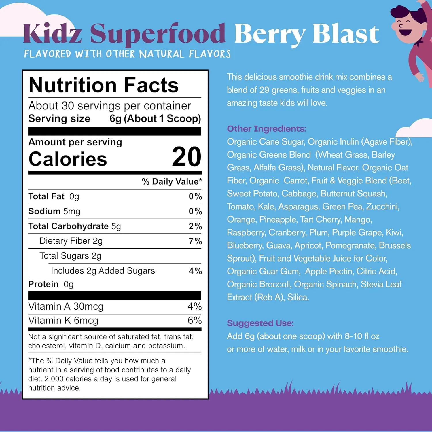 Fuel your child’s health with Amazing Grass Kidz Berry Superfood, a delicious and convenient way to ensure they get their daily dose of essential fruits and vegetables! This guilt-free nutritional powerhouse is crafted from a vibrant rainbow blend of organic greens, fruits, and vegetables, making it a super easy way to sneak healthy goodness into their day. Perfect for picky eaters, this berry-flavored drink powder mixes easily into smoothies, juices, or even just water, turning ordinary drinks into extraordinary sources of vitamins and minerals. You can finally rest easy knowing your kids are getting the nutrients they need to thrive, supporting their immune system, energy levels, and overall well-being. Amazing Grass Kidz Berry Superfood contains no artificial colors, flavors, or fillers, offering only pure, wholesome ingredients you can trust. It’s also vegan, dairy-free, and gluten-free, making it suitable for children with various dietary needs and sensitivities. Empower your kids to build healthy habits with this tasty and effective superfood supplement. Each serving is packed with antioxidants, phytonutrients, and enzymes to support optimal health and vitality, helping them grow strong and stay energized throughout the day. This amazing product makes getting their daily greens fun and hassle-free.