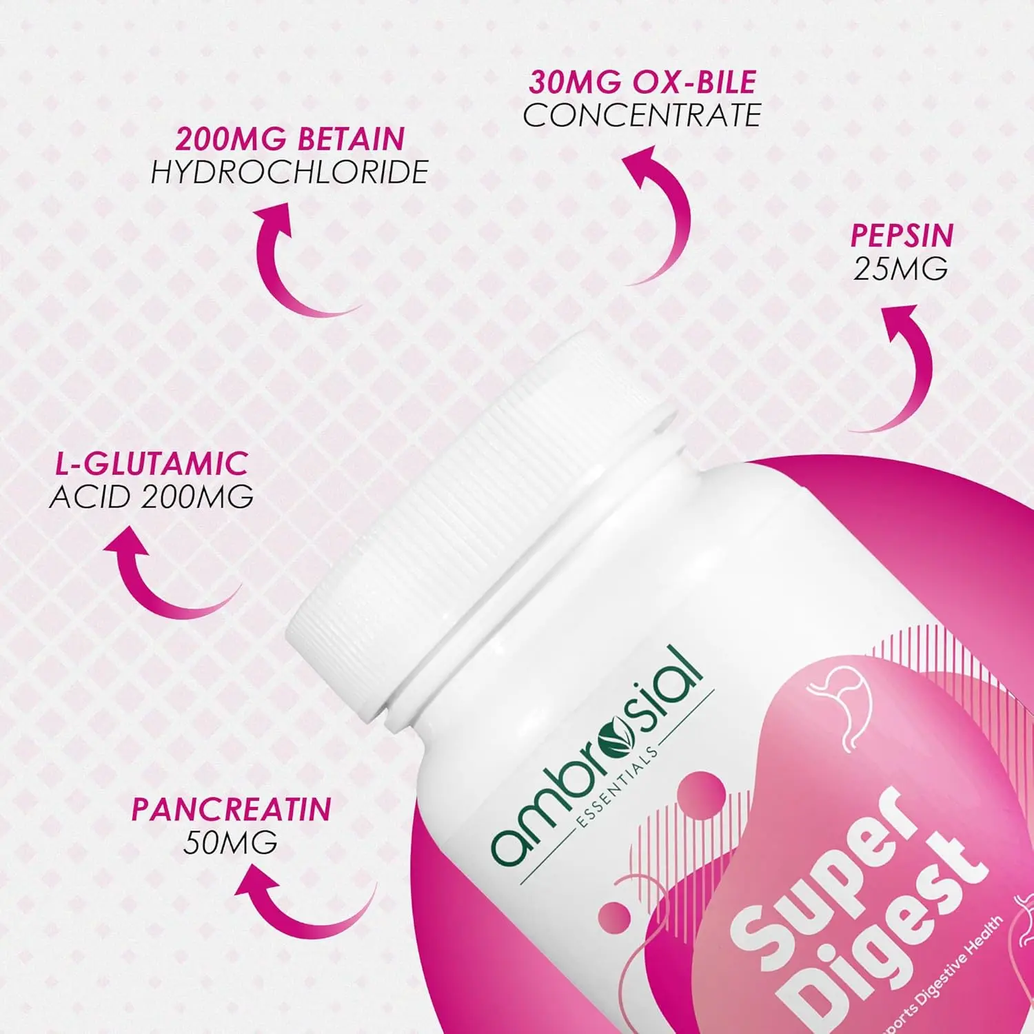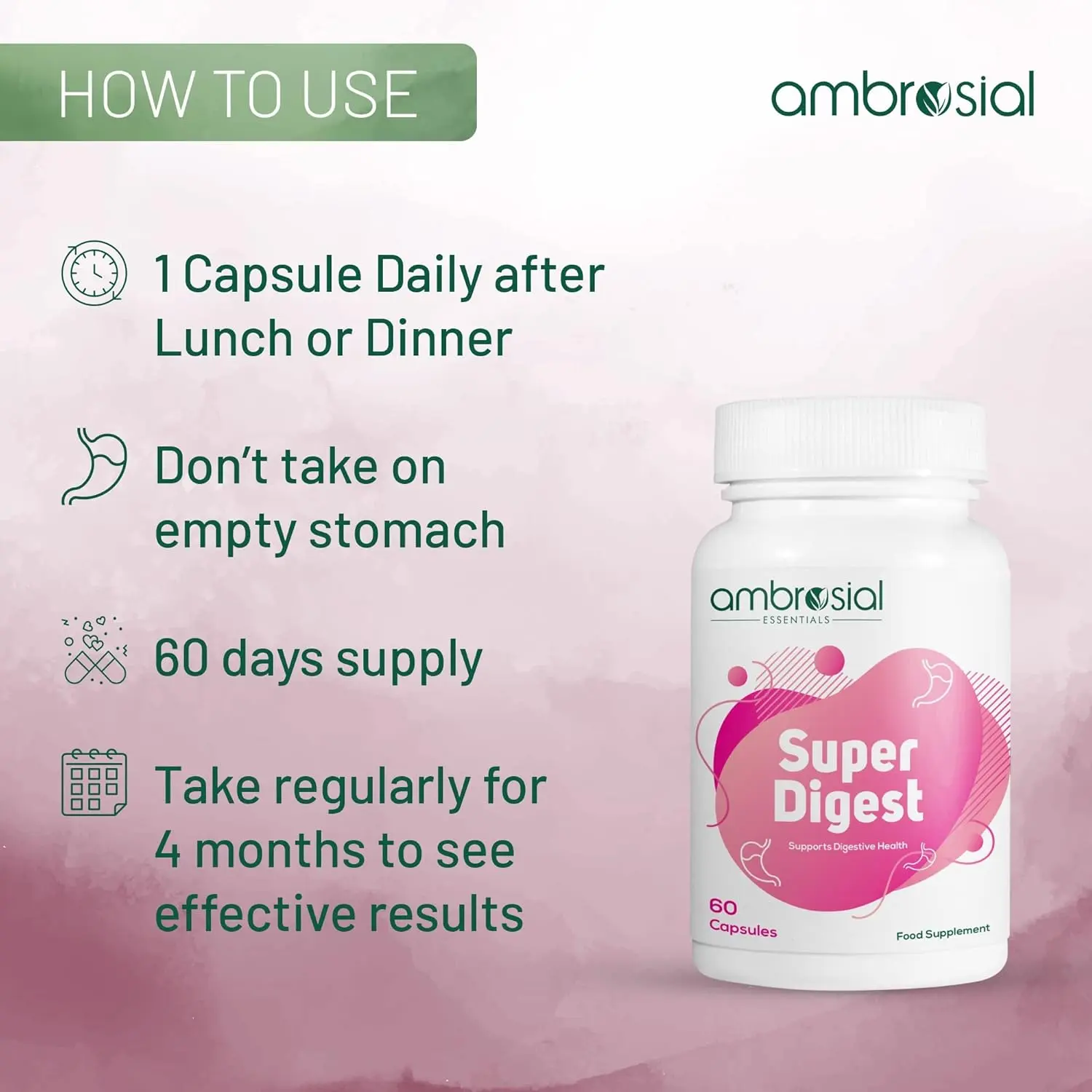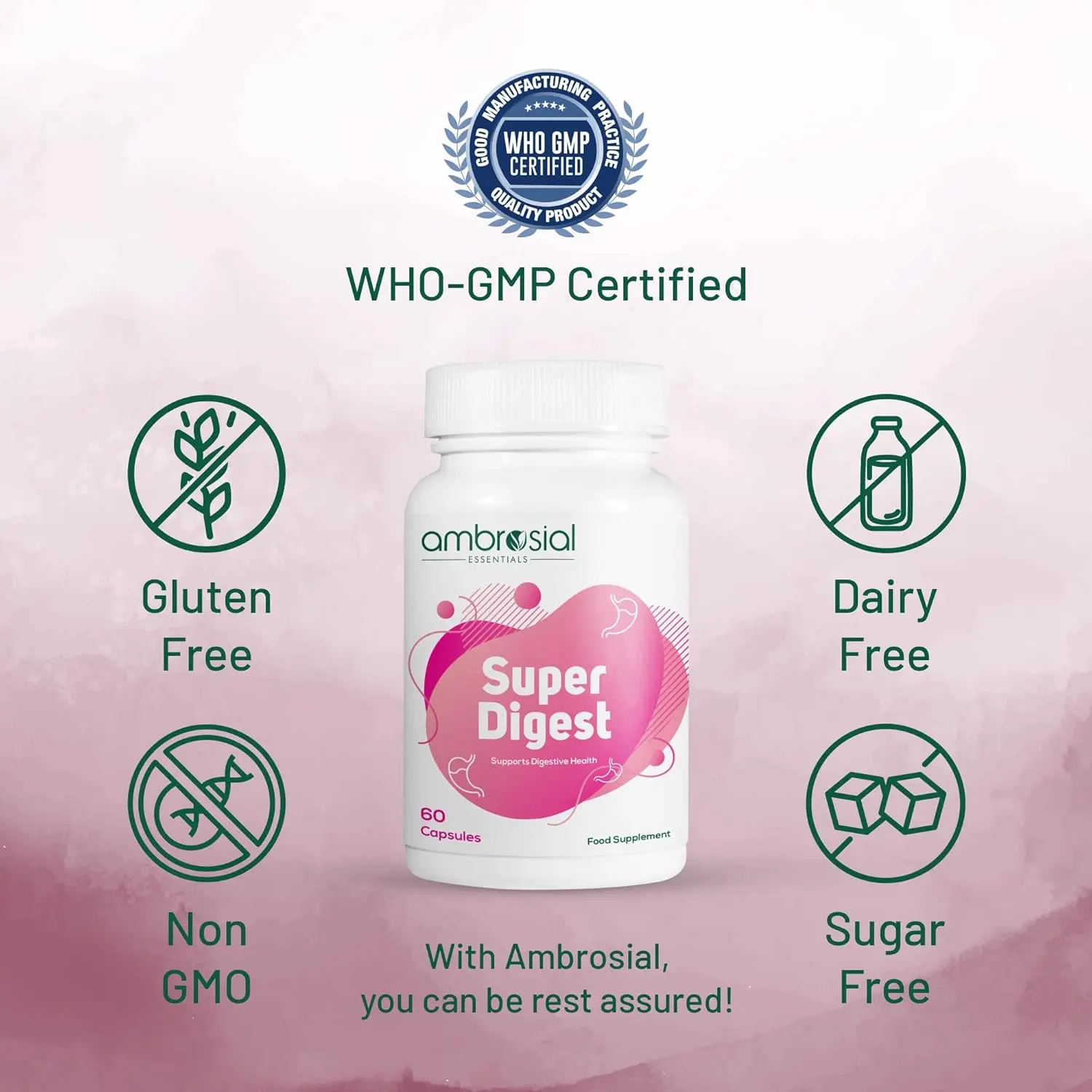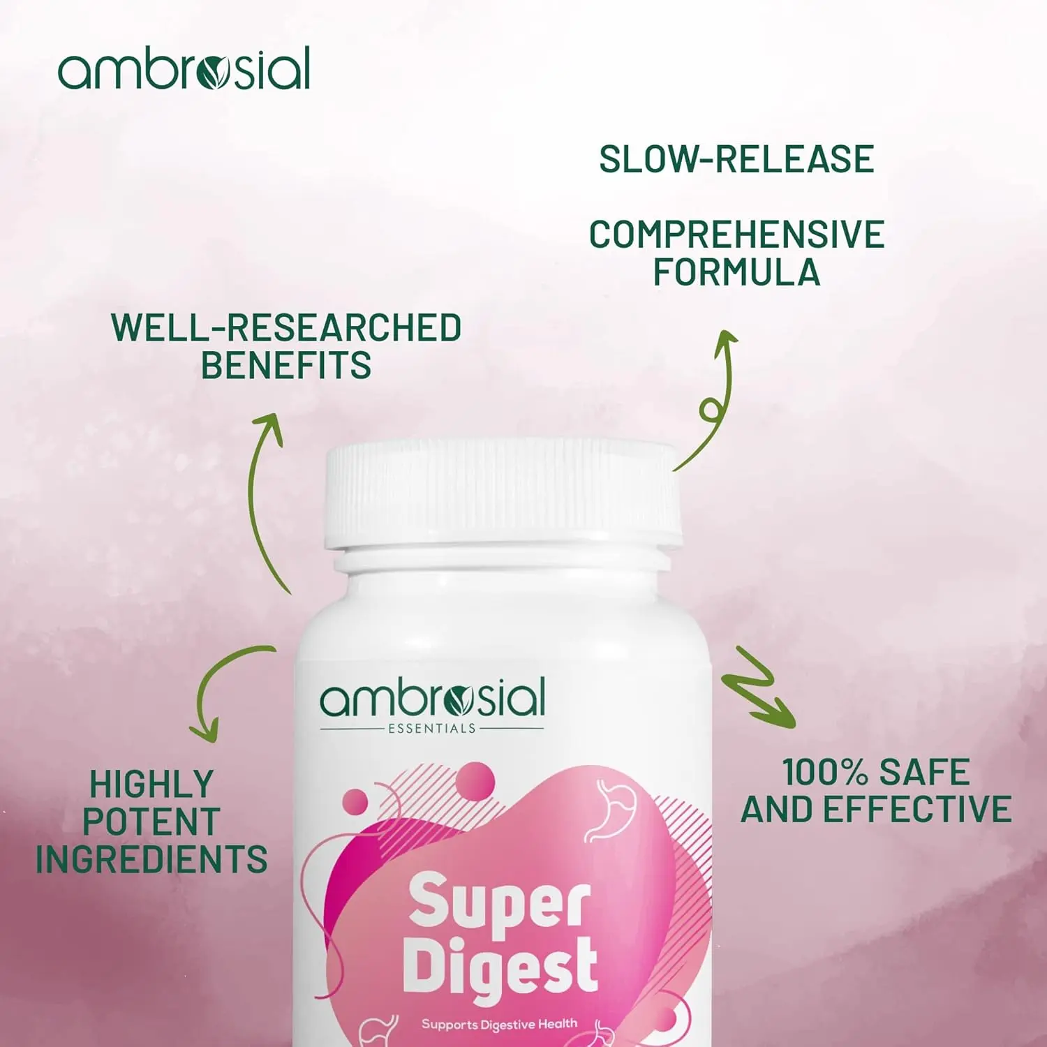 Ambrosial Super Digest is your advanced solution for optimal gut health and comfort. This powerful digestive enzyme supplement features a meticulously crafted blend of digestive enzymes, ox bile salts, and betaine HCL, all working synergistically to promote healthy digestion and a balanced gut flora. Say goodbye to digestive discomfort and hello to a happier, healthier you! From bloating and constipation relief for adults to lactose and gluten intolerance support, our comprehensive formula addresses a wide spectrum of digestive needs. Each ingredient is carefully selected for its potential to contribute to your overall digestive well-being. The phytochemicals in Super Digest not only boost metabolic health but also suppress the formation of unwanted bacteria in your gut. Integrating Ambrosial Super Digest into your daily routine is effortless. A simple daily regimen can significantly improve your digestive health, promoting the growth of beneficial bacteria like Lactobacillus and Bifidobacterium, which play crucial roles in the colon. We believe our supplement will help your body process food more efficiently, leading to better nutrient absorption and improved overall health. At Ambrosial, quality is our top priority. We ensure that only the best reaches you. Each batch undergoes rigorous quality and purity evaluations before and after manufacturing, guaranteeing a high-quality Ambrosial product you can trust. Join our mission towards better health! At Ambrosial, our goal is to empower our customers to achieve better, safer, and serene health and well-being by providing safe and effective supplements. We are committed to serving that purpose every day. Experience the Ambrosial difference and unlock the potential for a healthier, more comfortable digestive system.
