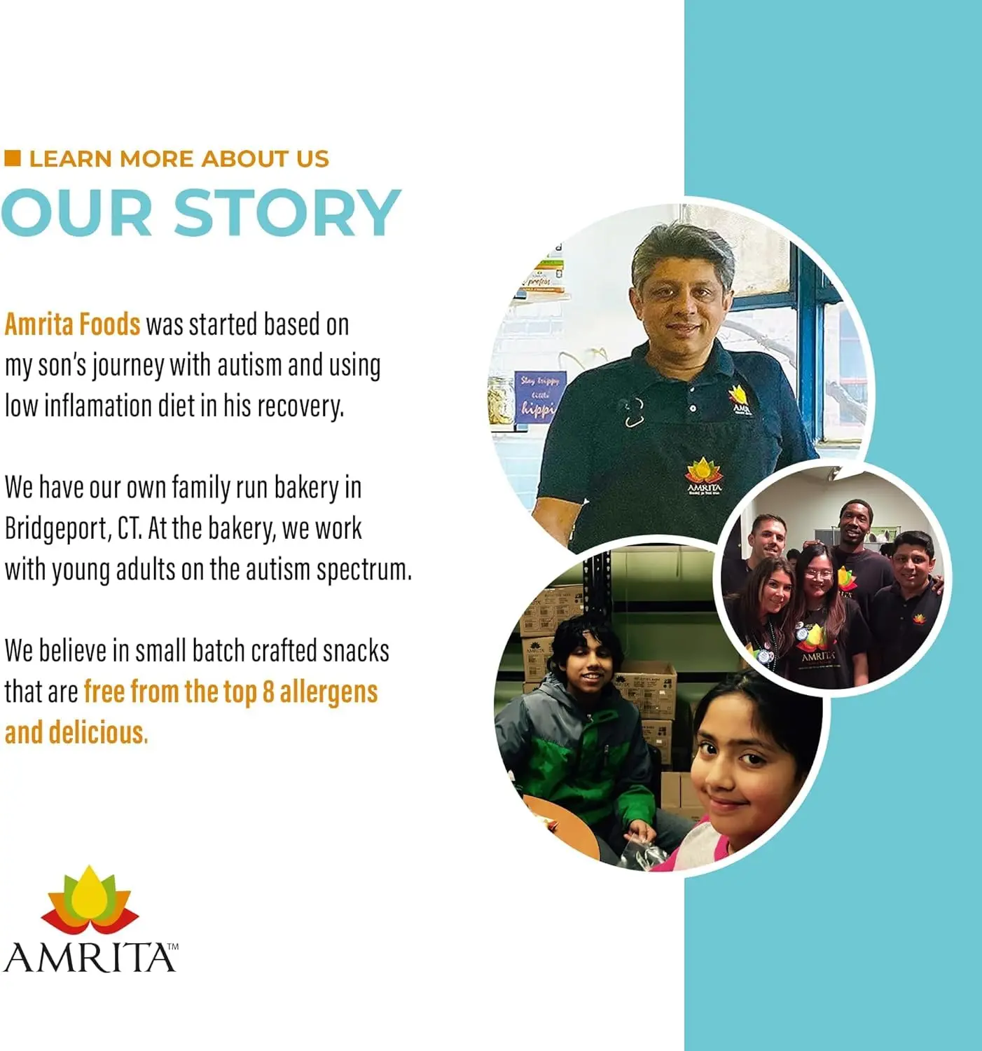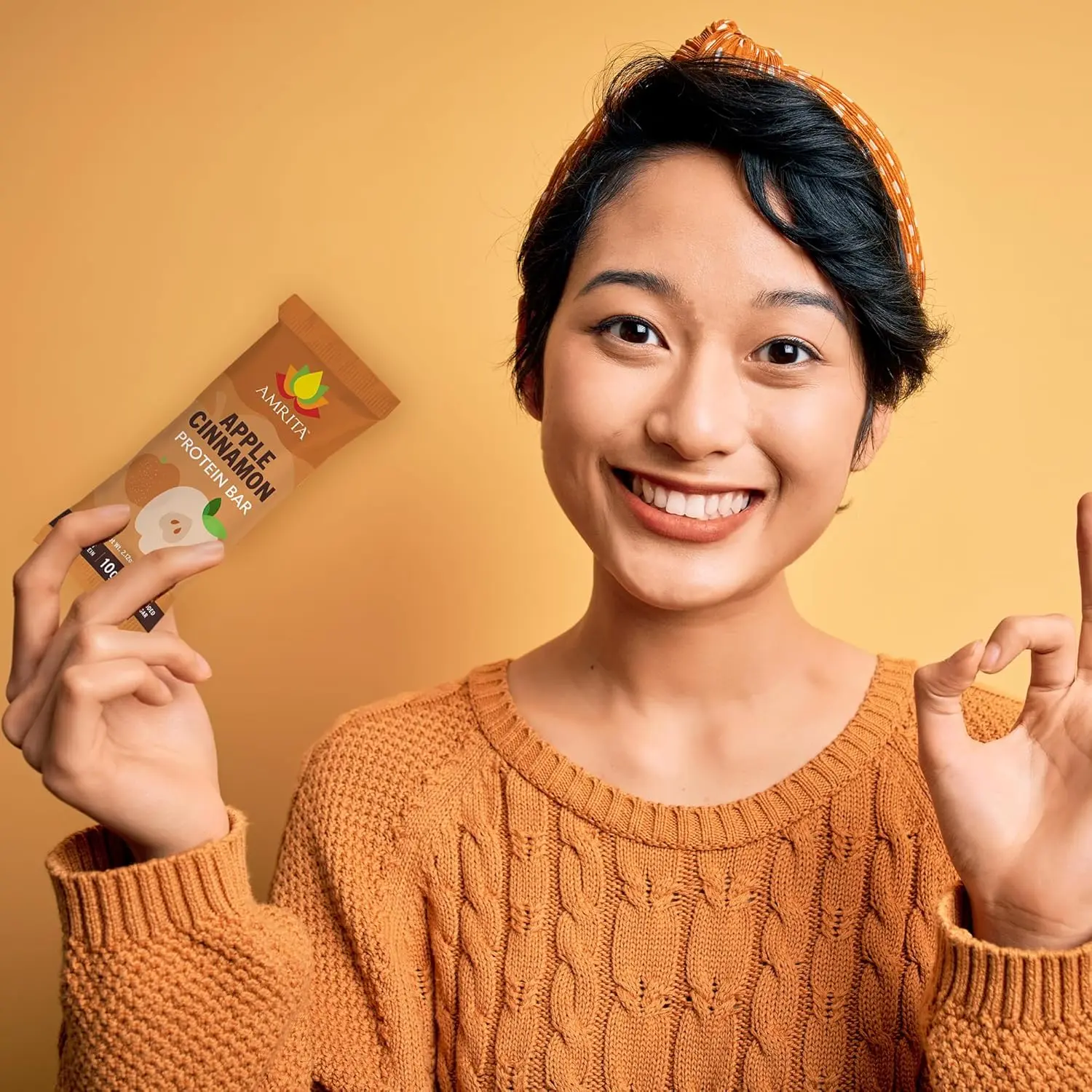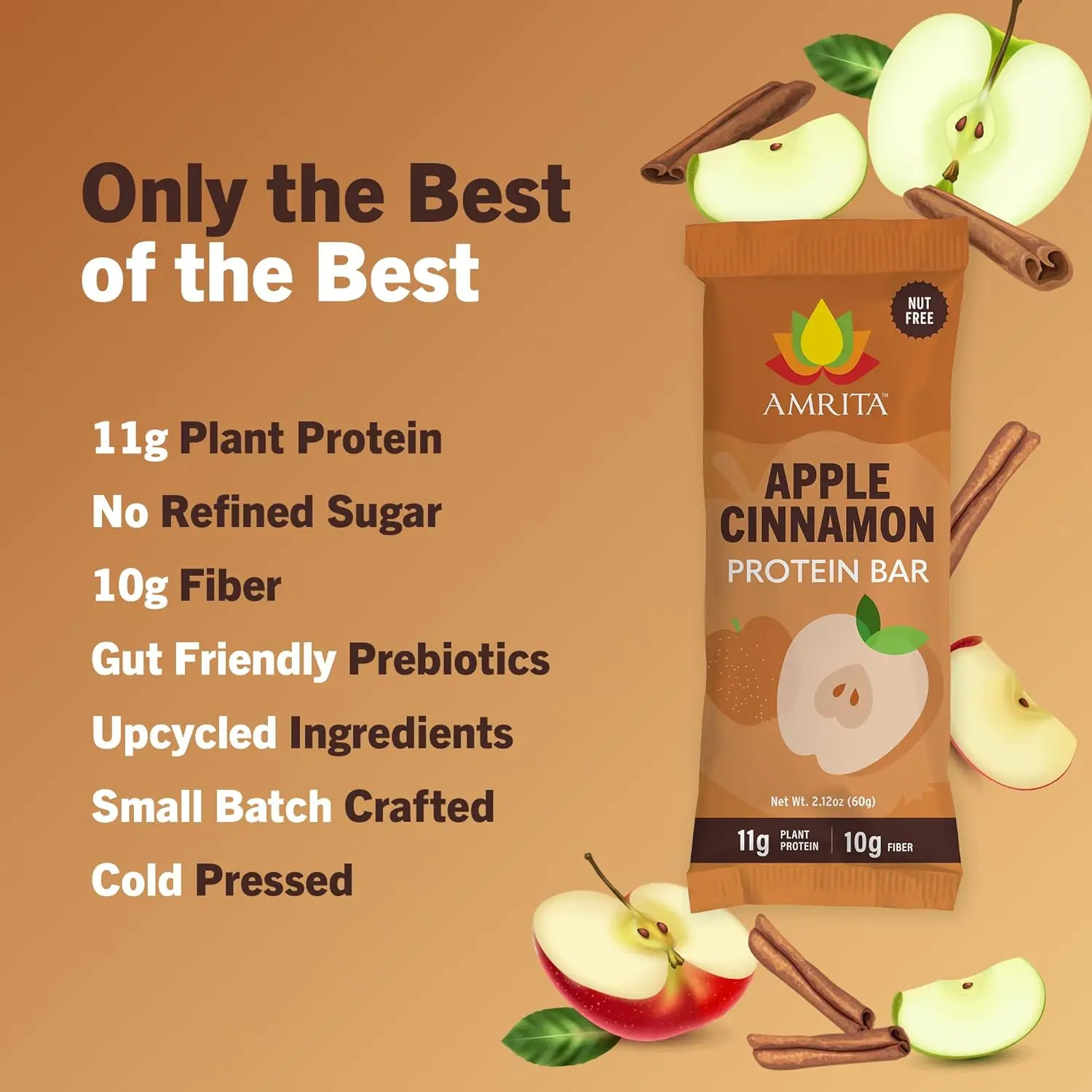 Fuel your day with Amrita Apple Cinnamon Protein Bars! These plant-powered protein bars are crafted from pure, cold-pressed ingredients, delivering 15 grams of plant protein per bar. We use only natural ingredients like dates, dried fruits, and seeds. Enjoy a nostalgic taste of apple pie with the flavors of tart, sweet apples and superfood cinnamon spice. Each box contains 12 flavor-packed protein bars perfect for guilt-free enjoyment. These low-sugar, high-protein bars are a perfect healthy snack and meal replacement! They are vegan, gluten-free, and free from Gluten, Dairy, Soy, Peanuts, Sesame, and GMOs. Our breakfast bars contain healthy ingredients like dates, brown rice protein, sunflower seeds, chia seeds, pumpkin seeds, unsweetened coconut, cinnamon, and apples for nutrient-rich snacking. Whether at work, the gym, or on a hike, these bars provide convenient, wholesome nutrition. Fuel yourself up with a mix of carbohydrates and pure plant protein with our clean protein bar! Amrita snacks are crafted in small batches in our allergen-free family-run bakery. We proudly support young adults with autism through our hiring practices and stand by our products.