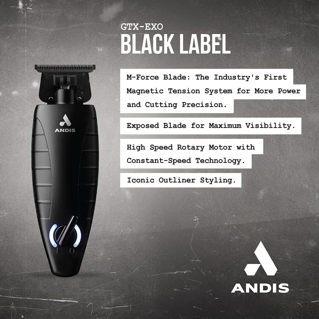 Own the exclusive Andis GTX-EXO Black Label Trimmer, a rare find for discerning professionals. This limited-edition trimmer boasts the innovative M-Force blade, featuring an advanced magnetic tension system for consistent tension across the blade, improved line of sight, and superior sound. The springless design minimizes wear and tear, ensuring consistent blade speed and temperature for long-lasting performance. Experience unparalleled precision with the closer zero gap spec on the trusted GTX-Z M-Force blade, now enhanced with a durable Black PVD coating. Power through the toughest jobs with the powerful rotary motor, delivering an impressive 7,200 strokes per minute. Enjoy the convenience of cord/cordless operation thanks to the long-lasting lithium-ion battery. The EXO Line of Sight Housing provides a clear, unobstructed view for enhanced control and accuracy. Complete with a premium charging stand, 4 attachment combs, blade brush, and oil, the Andis GTX-EXO Black Label Trimmer is the ultimate tool for achieving flawless results. Elevate your grooming game with this exceptional trimmer that combines cutting-edge technology with exclusive design. Get yours today before they are gone.