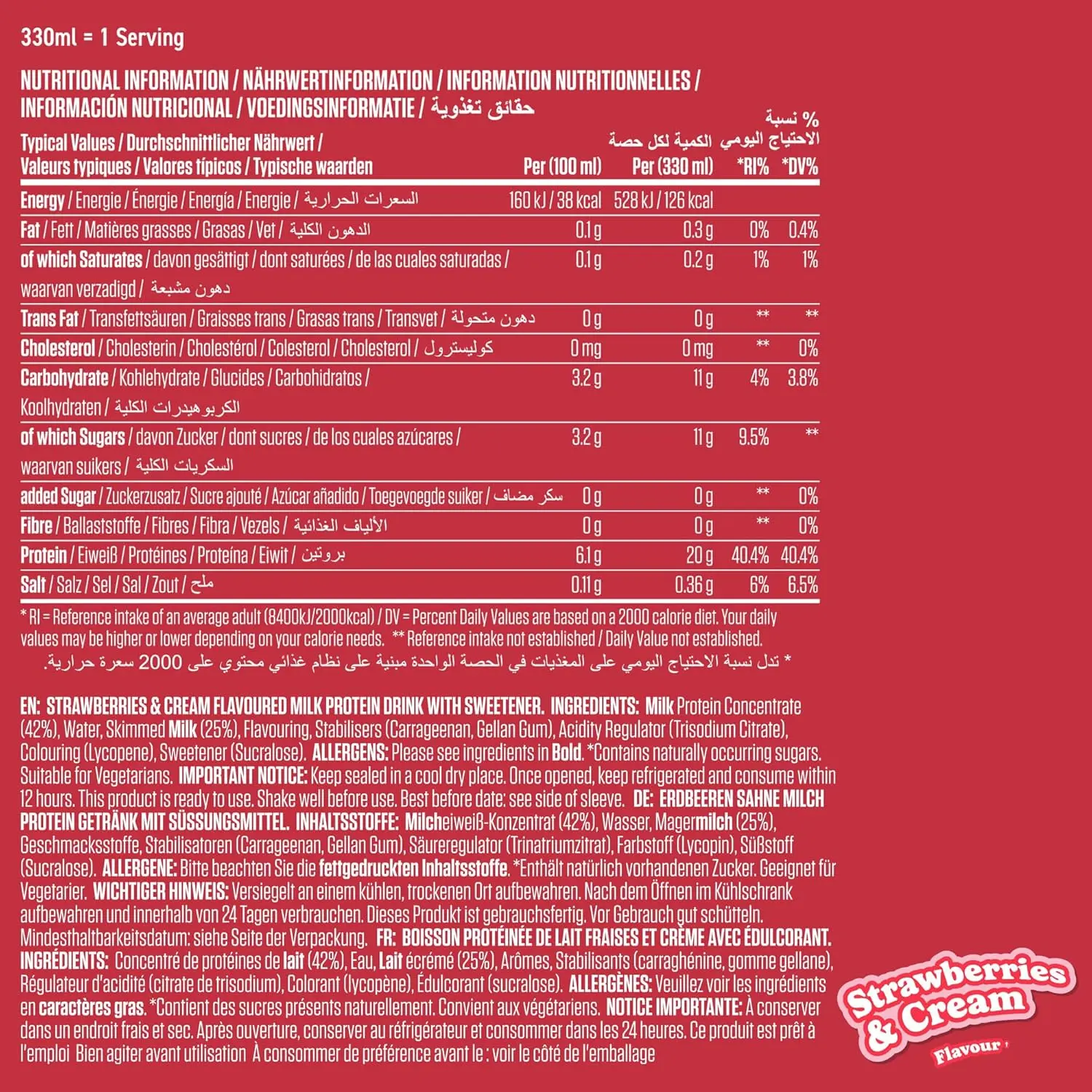 • Contains 20g of protein per 330ml bottle.
