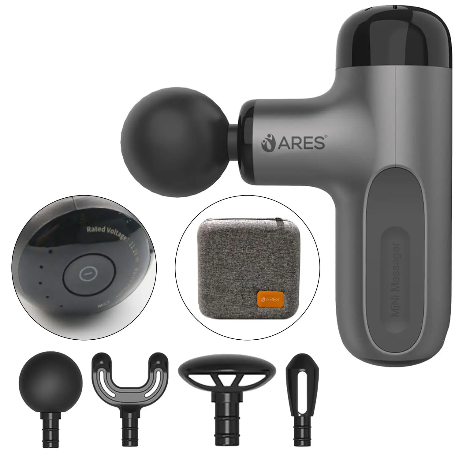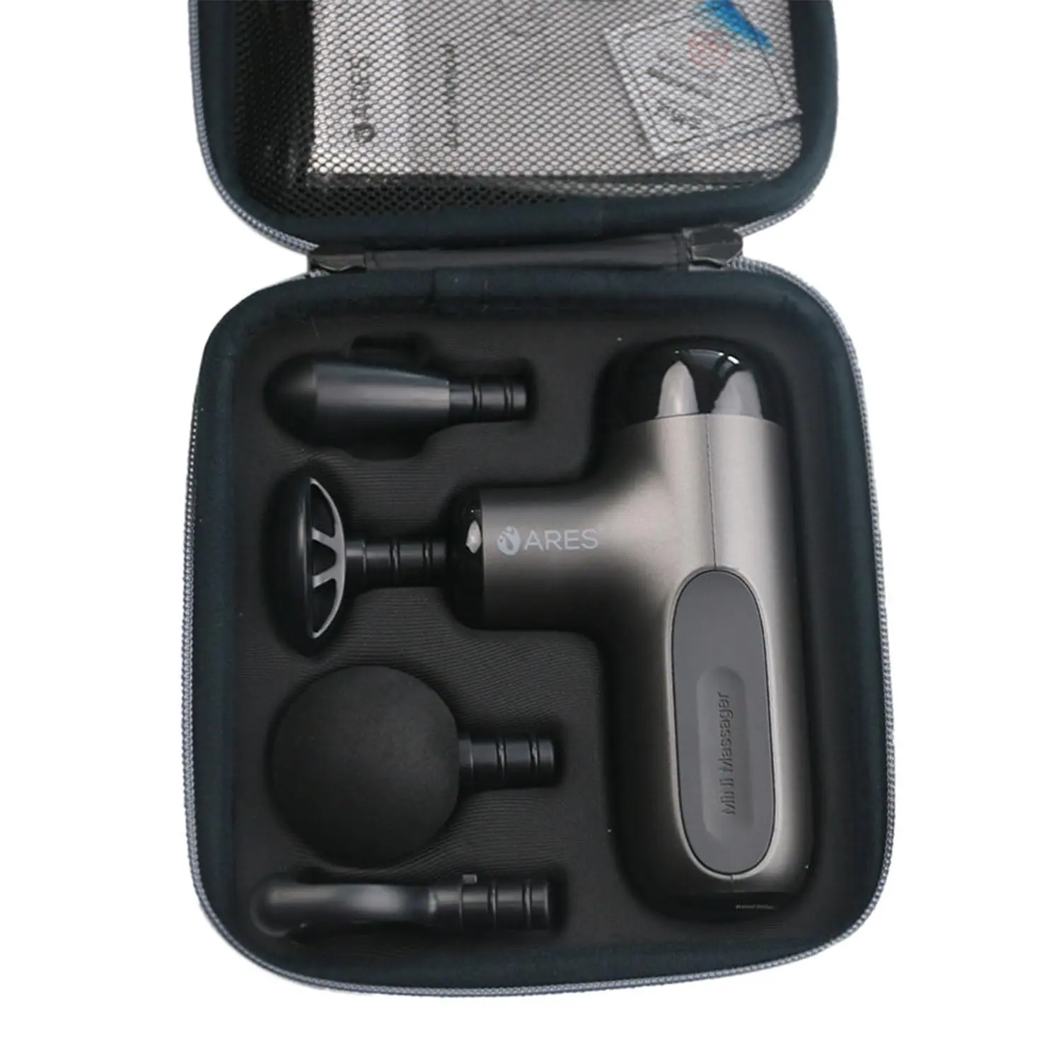 Experience deep muscle relief and revitalization with the ARES iCute Gun Massager. This versatile percussion massager is designed for full body use, making it the perfect companion after intense workouts, long commutes, or stressful workdays. Target specific muscle groups with interchangeable massage heads, each designed to deliver optimal comfort and effectiveness. The powerful 25-watt motor provides deep tissue massage, helping to alleviate soreness, reduce muscle tension, and improve circulation. Its innovative ergonomic design ensures a comfortable and secure grip for both men and women, allowing you to easily reach any area of your body. Enjoy the freedom of cordless operation with the built-in 7500 mAh lithium battery, providing over 15 hours of continuous use on a single charge. Recharge conveniently with the included USB-C cable. Keep your massager safe and organized with the included durable storage bag, perfect for travel and on-the-go use.