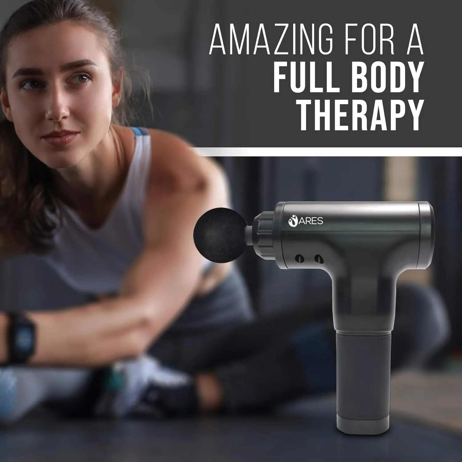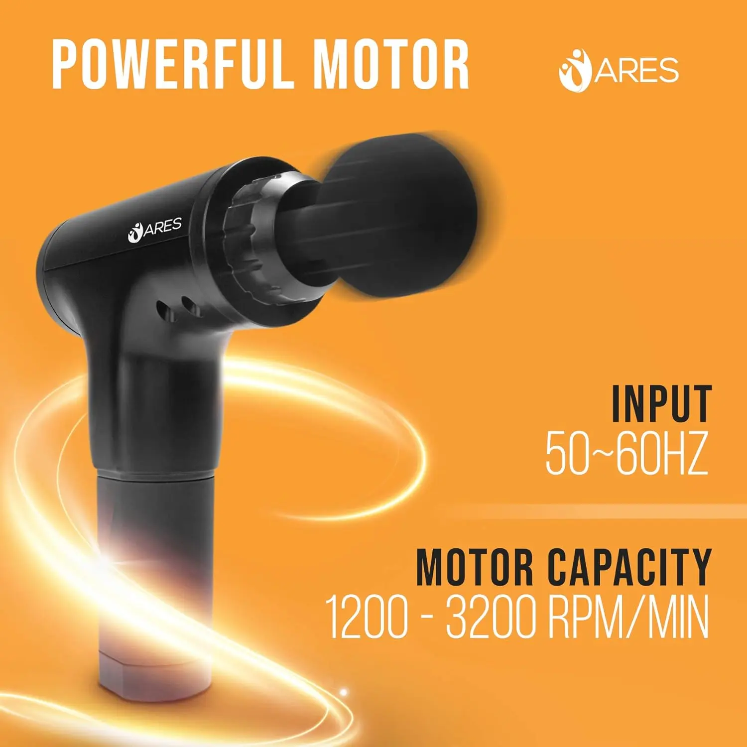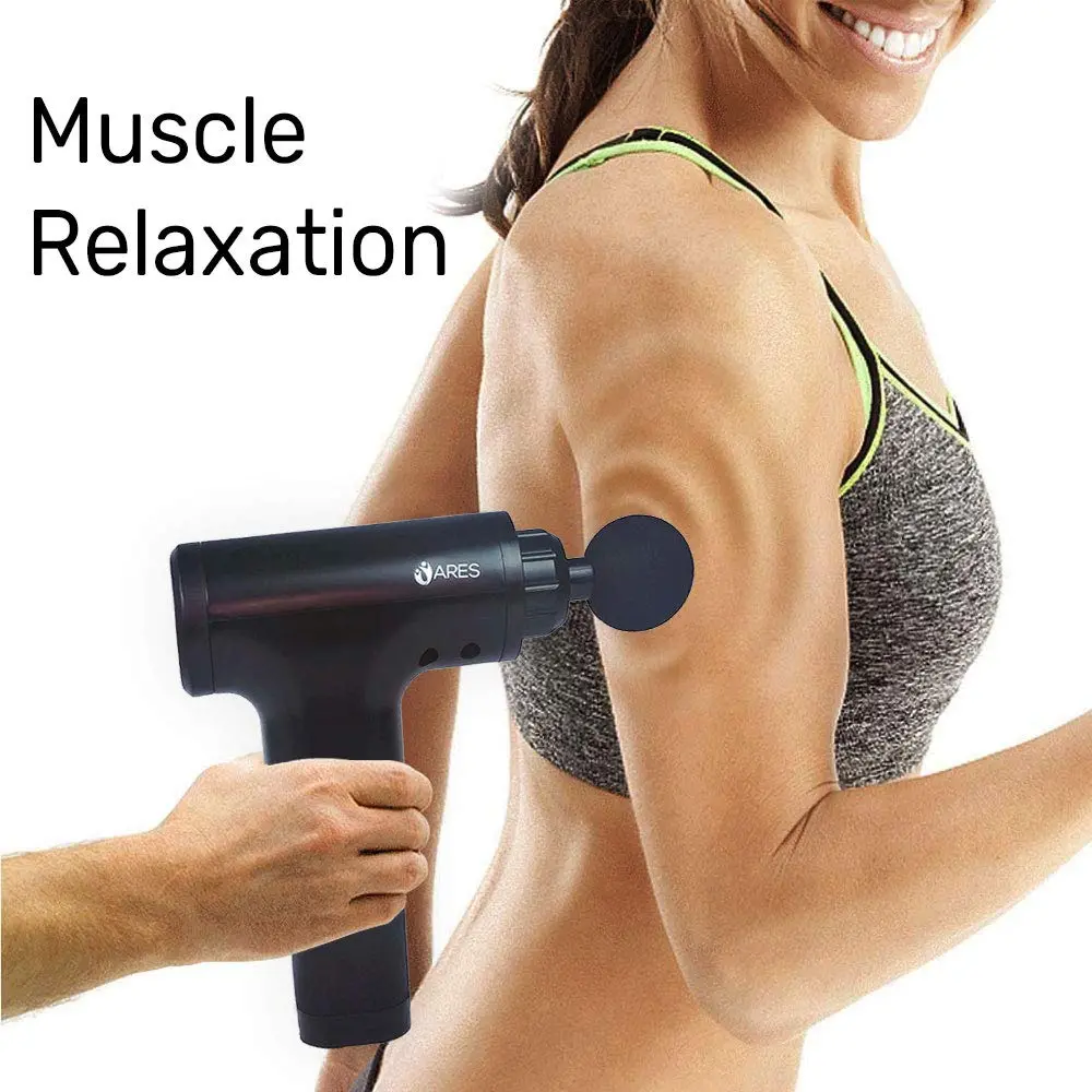 The ARES Muscle Massage Gun provides deep tissue percussion therapy for muscle relief and faster recovery. Features 6 speeds, 4 heads, quiet operation, and ergonomic design. Cordless and rechargeable.