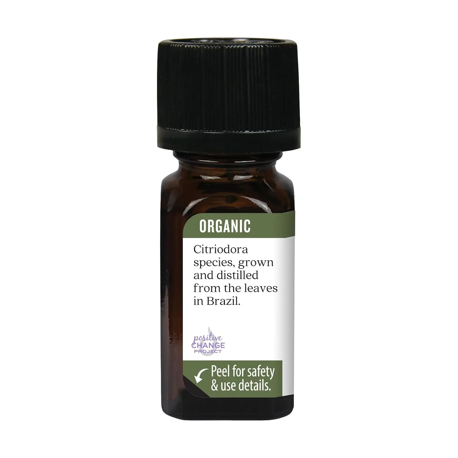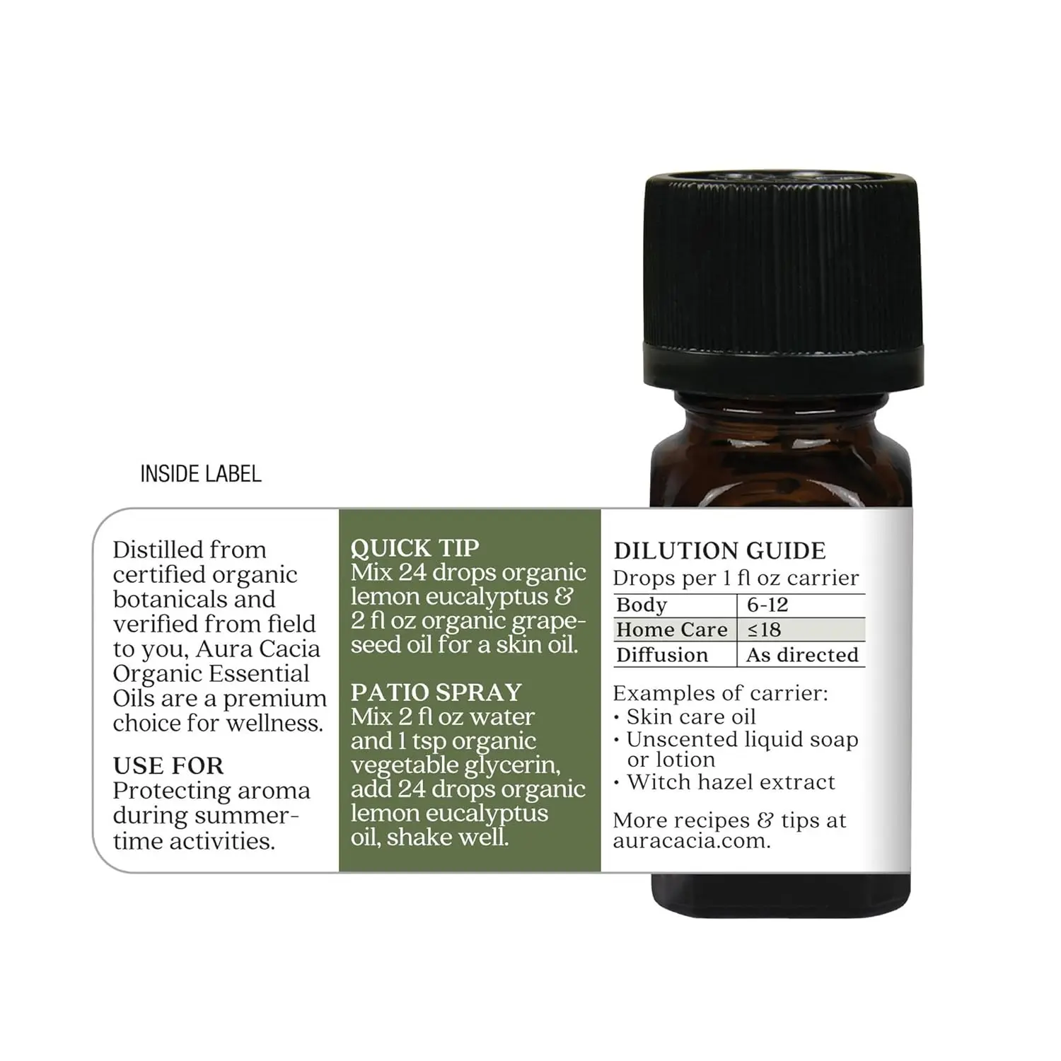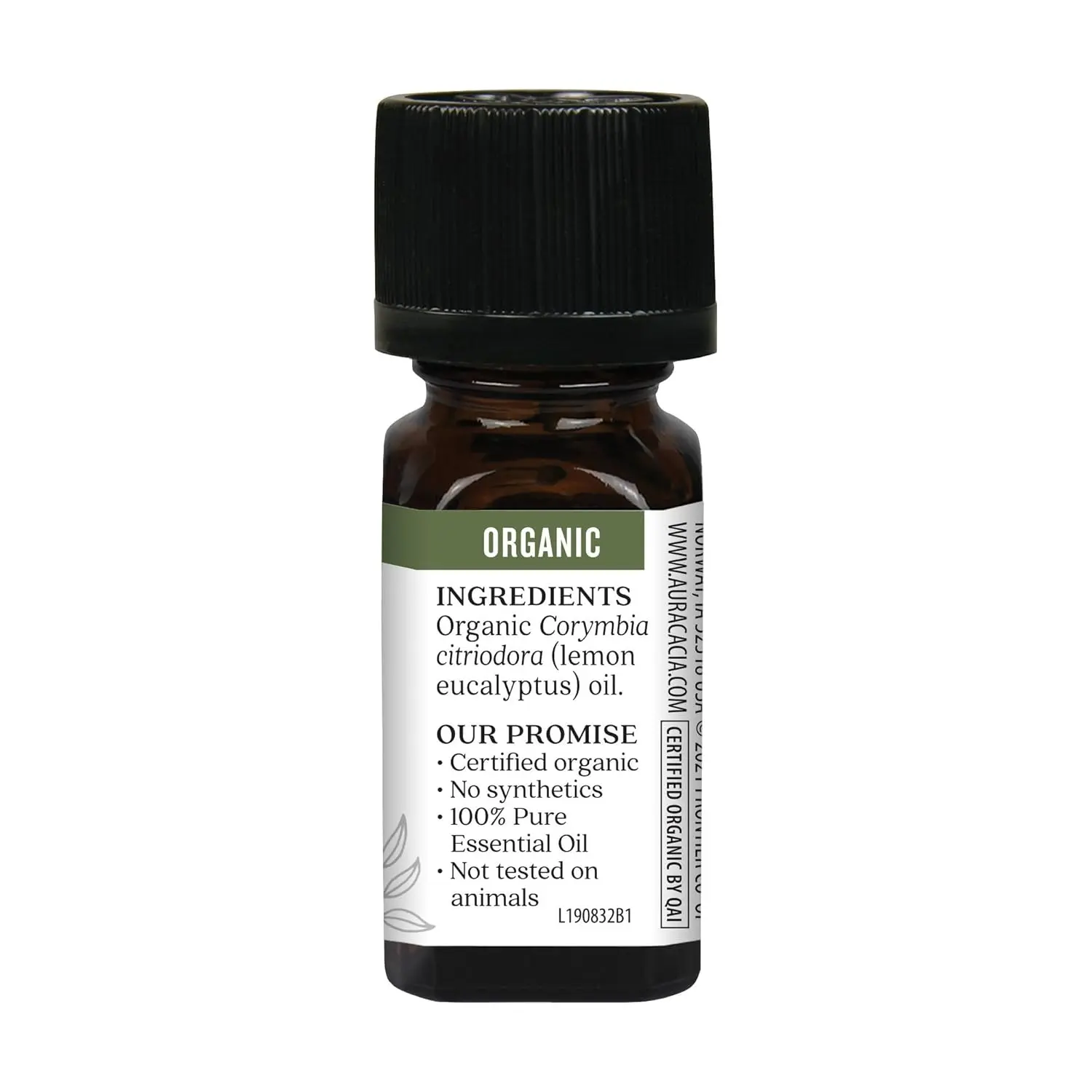 Aura Cacia Organic Lemon Eucalyptus Oil is steam distilled from *Corymbia citriodora* leaves. It is certified organic with an invigorating and clarifying aroma, perfect for aromatherapy.