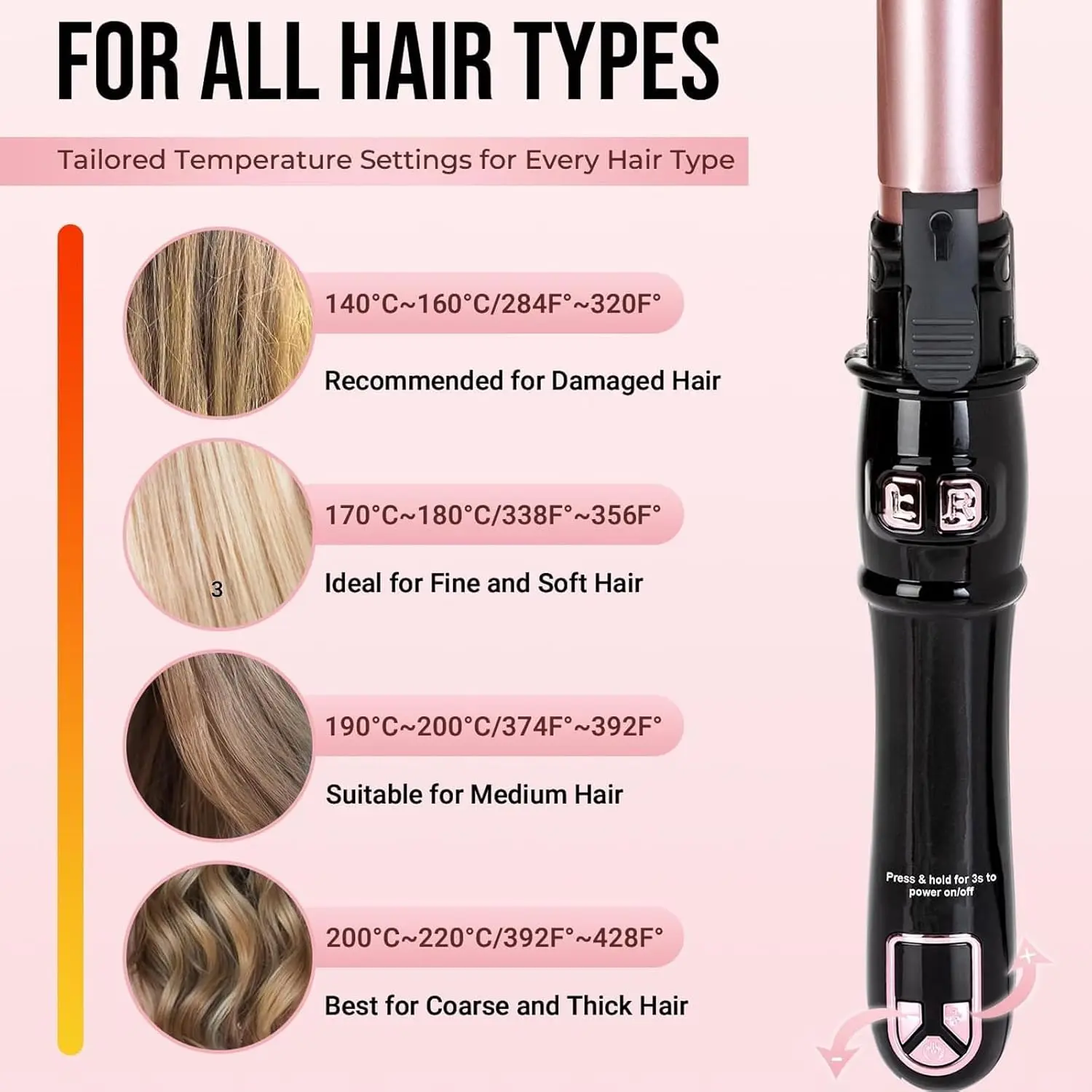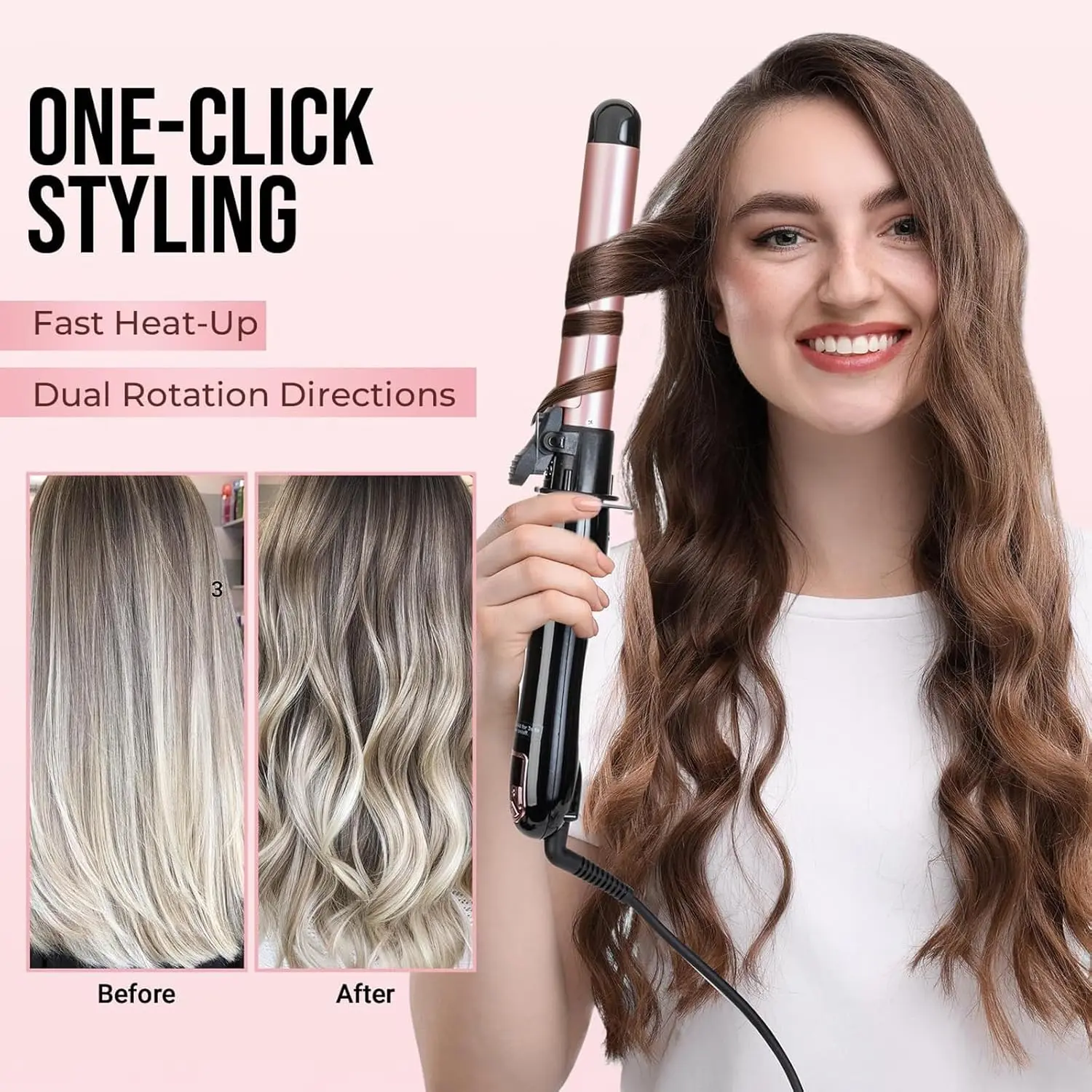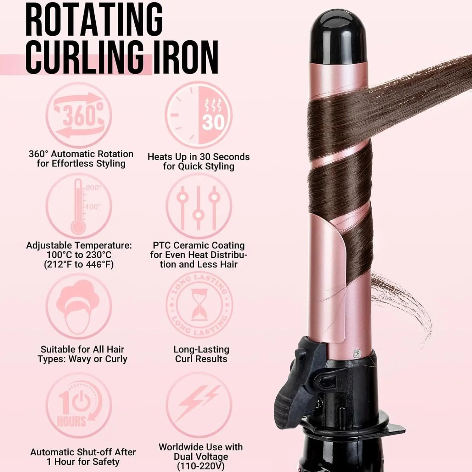 • Automatic rotation for effortless curls and waves