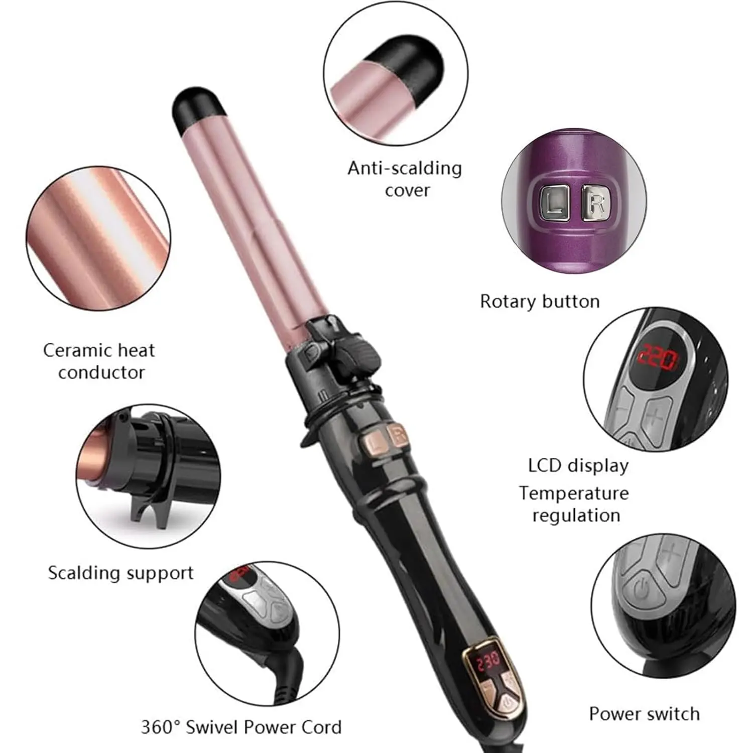 Achieve effortless, salon-worthy curls and waves with our Automatic Curling Iron! This innovative 1.1-inch ceramic curling iron features an auto-rotating design, making it incredibly easy to create luxurious waves and long-lasting curls without the hassle of tangles or twists. The upgraded auto-rotating function does all the work for you, so you can achieve stunning beach curls and loose waves in minutes. Save valuable time with our rapid heat-up technology. In just seconds, this hair curling iron is ready to transform your hair, making it perfect for busy mornings or last-minute touch-ups. Our newly upgraded version features an LED display that shows the temperature, allowing you to adjust the settings to meet the needs of your personalized hairstyles. The adjustable temperature settings range from 212°F to 446°F (100℃ to 230℃), making it suitable for all hair types. Whether you have fine, delicate hair or thick, coarse hair, you can find the optimal temperature for better and longer-lasting curling effects. The LED digital display ensures precise temperature control, so you can avoid overheating and damage to your hair. The automatic rotating hair curler is designed with a 360° swivel cord for effortless maneuvering and styling. The rotating curling wand is coated with a rust-resistant ceramic coating that quickly conducts even heat and reduces heat damage, ensuring your hair stays shiny and healthy while creating gorgeous waves. This user-friendly design simplifies the curling process and saves you time. Get ready to experience the convenience and ease of our Automatic Curling Iron!