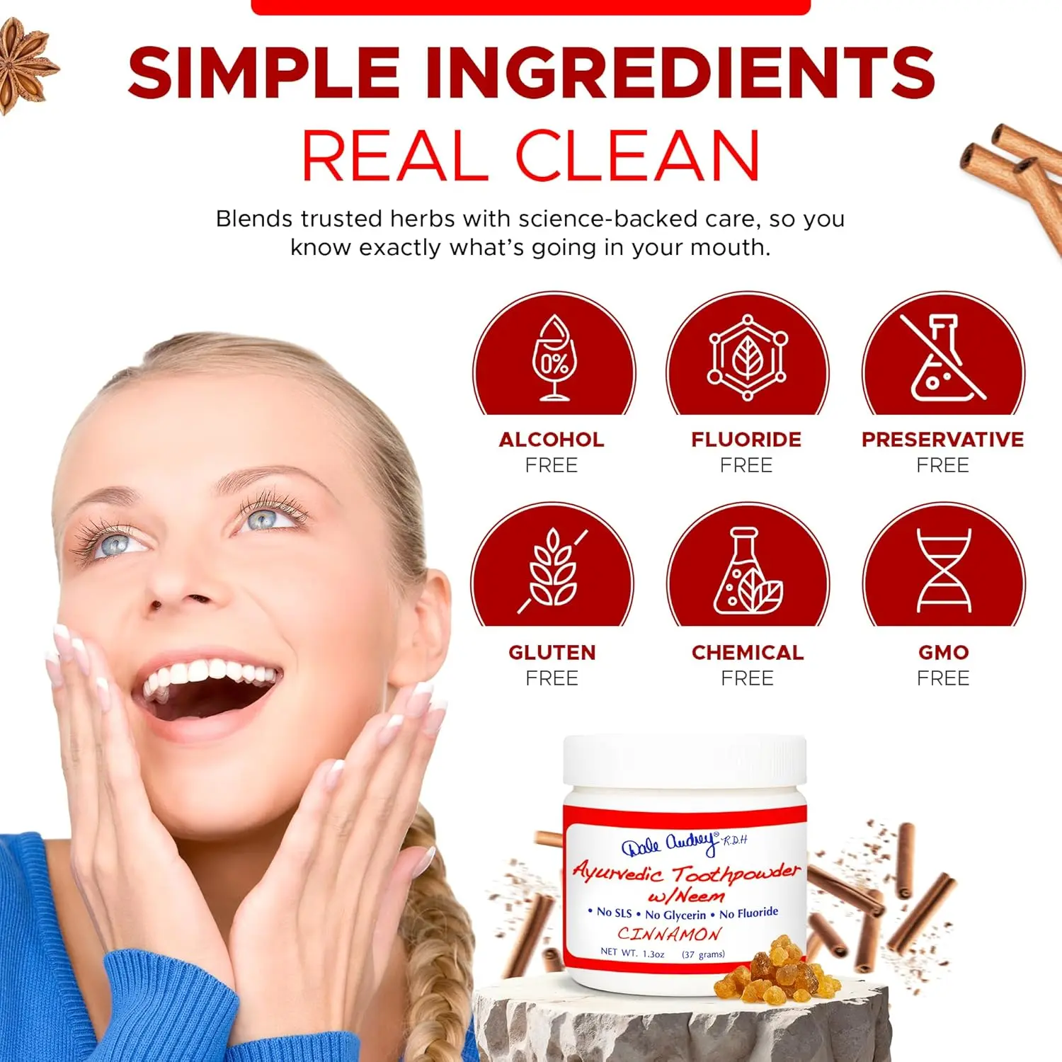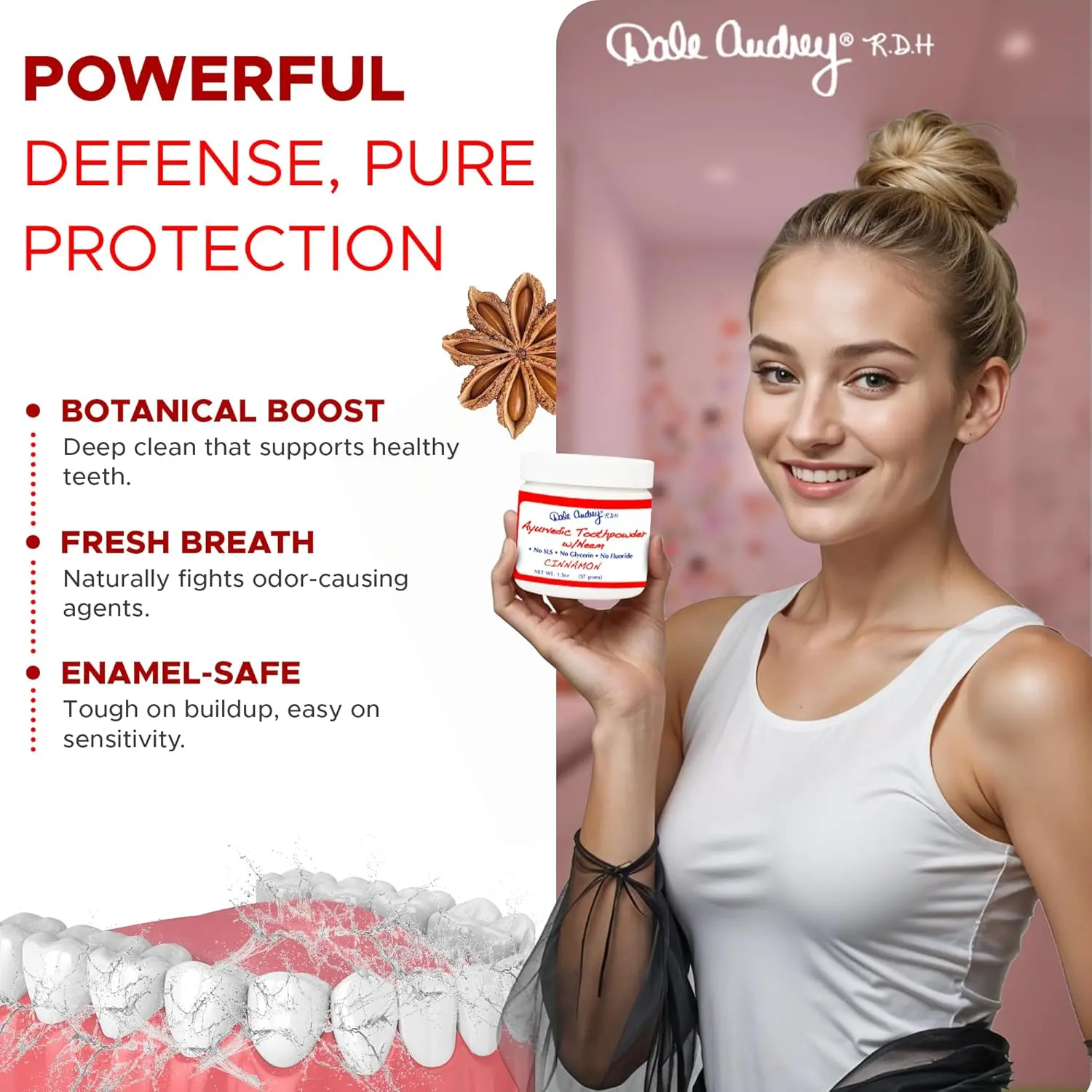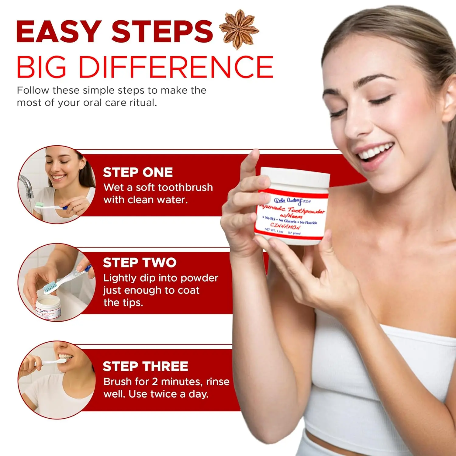 Discover the ancient secret to a naturally brighter and healthier smile with our Ayurvedic Tooth Powder. Unlike conventional toothpastes laden with artificial chemicals, our tooth powder offers a 100% chemical-free alternative, crafted with potent Ayurvedic herbs known for their dental benefits. This traditional formula gently cleanses your teeth, strengthens your gums, and freshens your breath without the harsh abrasives or synthetic additives found in commercial products. Experience the holistic approach to oral care that Ayurveda has perfected over centuries. Our Ayurvedic Tooth Powder helps to remove plaque, prevent cavities, and promote overall oral hygiene using only natural ingredients. It’s a gentle yet effective way to maintain a healthy and radiant smile. It is carefully formulated to provide comprehensive dental care, addressing common issues like sensitivity, gum inflammation, and bad breath. Embrace the power of nature and experience the difference that a chemical-free approach can make to your oral health. Switch to our Ayurvedic Tooth Powder and enjoy a cleaner, healthier, and more vibrant smile, naturally. This traditional blend cleans, whitens, and protects your teeth using the power of ancient herbs.