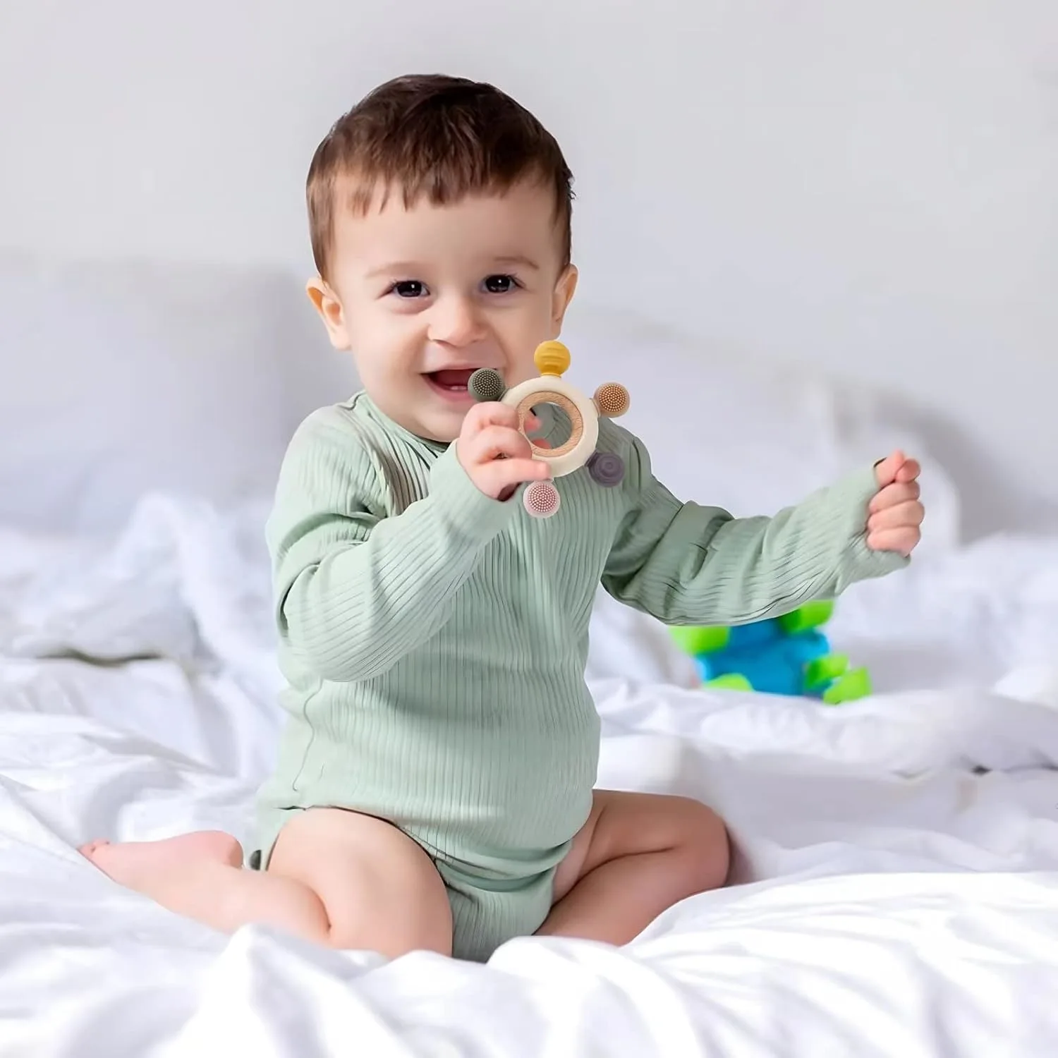 Soothe your little one’s teething discomfort with our Baby Teething Toy! This carefully designed teether combines the safety and softness of food-grade silicone with the natural, comforting feel of beech wood. It’s the perfect solution to ease your baby’s sore gums while encouraging sensory exploration and development. This teether is 100% safe, crafted from non-toxic materials that meet strict FDA standards. Rest easy knowing it’s free from harmful BPA and phthalates, prioritizing your baby’s health and well-being. The flexible, lightweight design is easy for tiny hands to grasp and hold, helping to develop motor skills and grasping reflexes. The size is perfectly suited for babies to comfortably chew on, providing targeted relief. Featuring a variety of textures, our sensory silicone teether allows your baby to explore and gnaw, effectively soothing aching gums in every area of their mouth. The unique design also aids in tongue exploration and speech development. Keeping the teether clean is simple! Just wash it with mild soapy water or boil it to sterilize. For extra cooling relief, the silicone portion can be stored in the fridge (remember to remove the wooden ring before boiling). The combination of textures, shapes, and materials stimulates your baby’s senses, encouraging sensory exploration and cognitive development. Give your baby the comfort and stimulation they need during this important developmental stage with our safe, effective, and engaging teething toy.