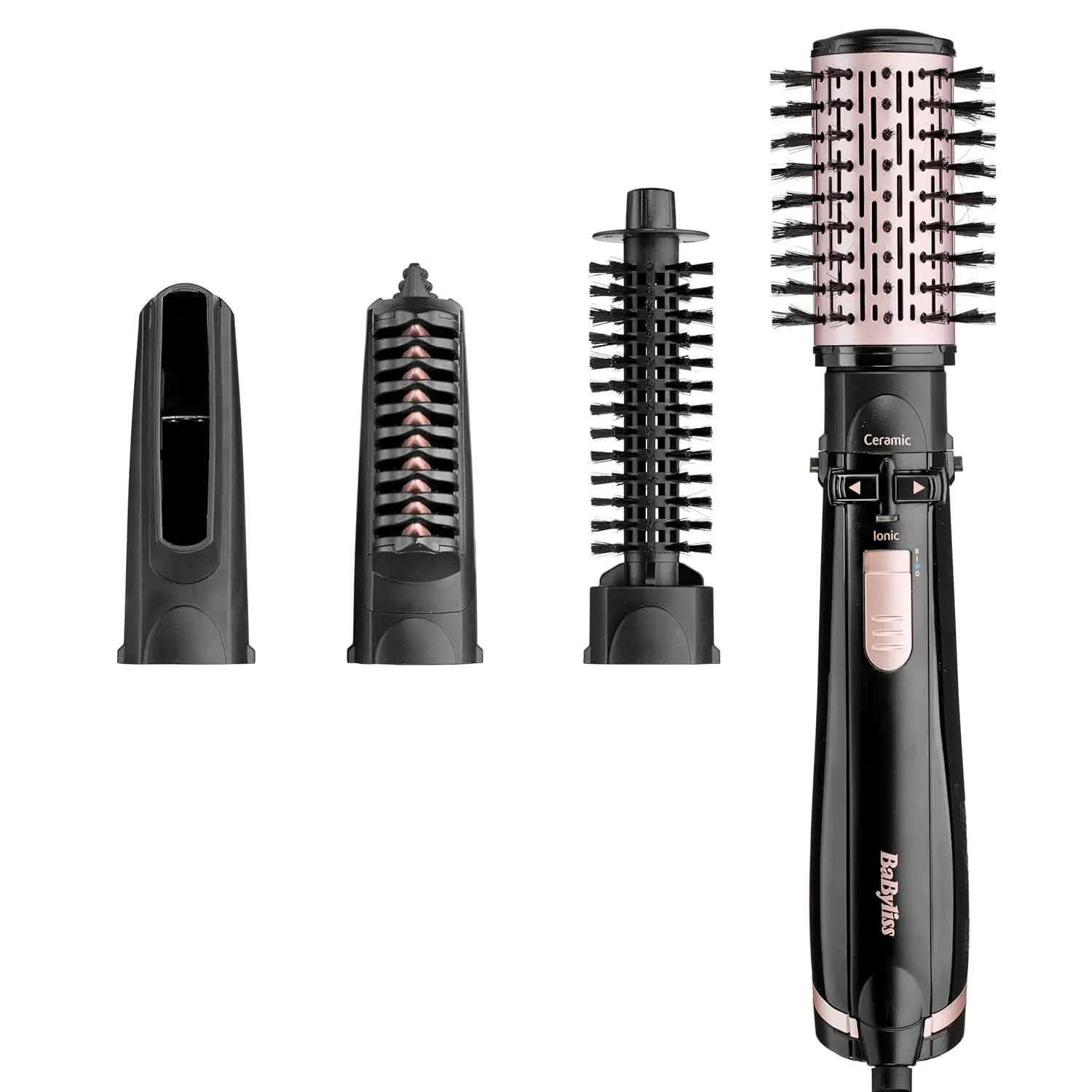 Achieve salon-worthy hair at home with the BaByliss Rotating Hot Air Brush Set. This comprehensive styling tool features a 50 mm rotating brush and a 20 mm fixed brush, perfect for adding volume, creating soft curls, and smoothing your hair. For sleek, straight styles, the included Beliss straightening accessory delivers professional results. The concentrator nozzle focuses airflow for precise styling. With 4 interchangeable heads, this set offers unparalleled versatility for all hair types and styles. The removable Silent Air filter ensures quiet operation, while the digital sensor automatically recognizes the inserted accessory, optimizing performance for each attachment. Powered by a professional digital motor, this hot air brush delivers consistent and powerful airflow for fast and efficient styling. The ionic anti-frizz function eliminates static and flyaways, leaving your hair smooth, shiny, and manageable. The cold air function sets your style for long-lasting hold. With 2 directions of rotation, you can easily create symmetrical styles on both sides of your head. The 2 temperature/speed settings allow you to customize the heat and airflow to suit your hair type and desired style. Whether you have fine, medium, or thick hair, the 2 heat/speed settings provide optimal control for creating a variety of looks. The included case provides convenient storage and portability, making this set perfect for travel. Elevate your hairstyling routine with the BaByliss Rotating Hot Air Brush Set and experience the difference of professional-quality results.