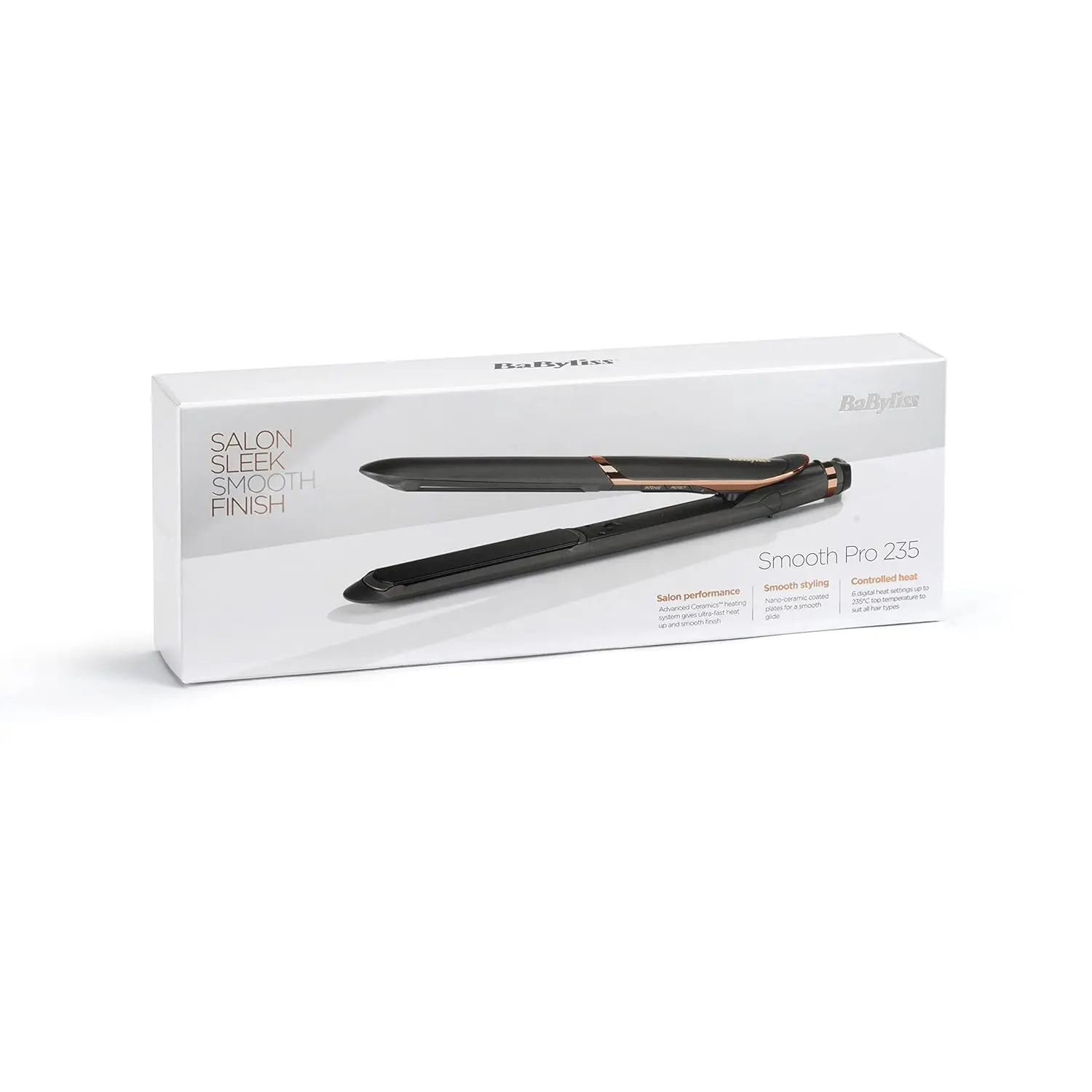 Achieve salon-worthy, sleek, and smooth hair with the BaByliss Smooth Pro 235 Hair Straighteners. Designed with advanced technology and user-friendly features, these straighteners deliver professional results in the comfort of your own home. The nano-ceramic plates glide effortlessly through hair, distributing heat evenly to minimize damage and maximize shine. With 6 digital heat settings reaching up to 235°C, you can customize the temperature to suit your specific hair type and styling needs, whether you have fine, delicate hair or thick, coarse locks. The Advanced Ceramics heating system ensures rapid heat-up and maintains a consistent temperature throughout styling, allowing for efficient and effective straightening. Say goodbye to frizz with the built-in ionic frizz-control, which releases negative ions to neutralize positive charges in the hair, leaving it smooth, polished, and manageable. For added safety and peace of mind, the auto shut-off function automatically turns off the straighteners after a period of inactivity. Experience the ultimate in hair straightening technology with the BaByliss Smooth Pro 235 and unlock your hair’s full potential. Get ready for gorgeous, head-turning hair every single day. The ceramic plates and variable temperature settings ensure that your hair is protected from heat damage, maintaining its health and vitality.