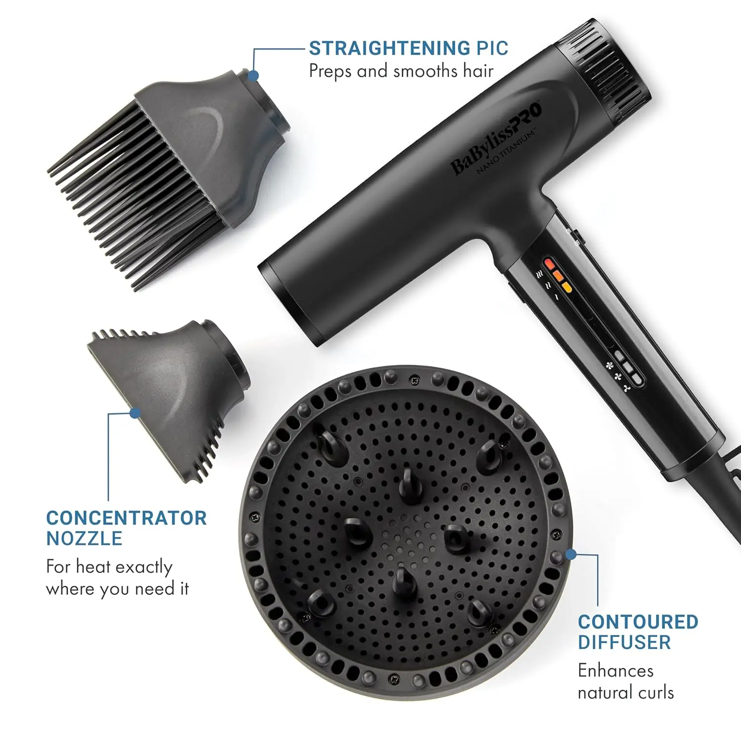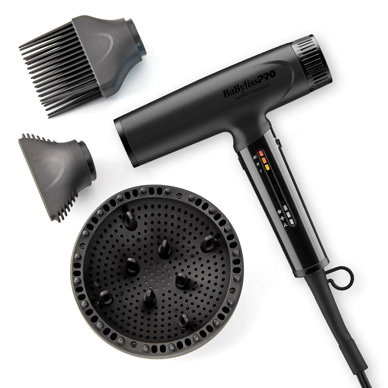 But speed isn’t everything. The BabylissPRO Nano Titanium Lightweight Hair Dryer is designed to cater to all your styling needs. It comes complete with a suite of essential accessories, including a cool-to-touch concentrator nozzle for precise styling, a straightening pic with curved teeth to create sleek, smooth looks, and an extra-deep contoured diffuser for enhancing natural curls and waves without frizz.