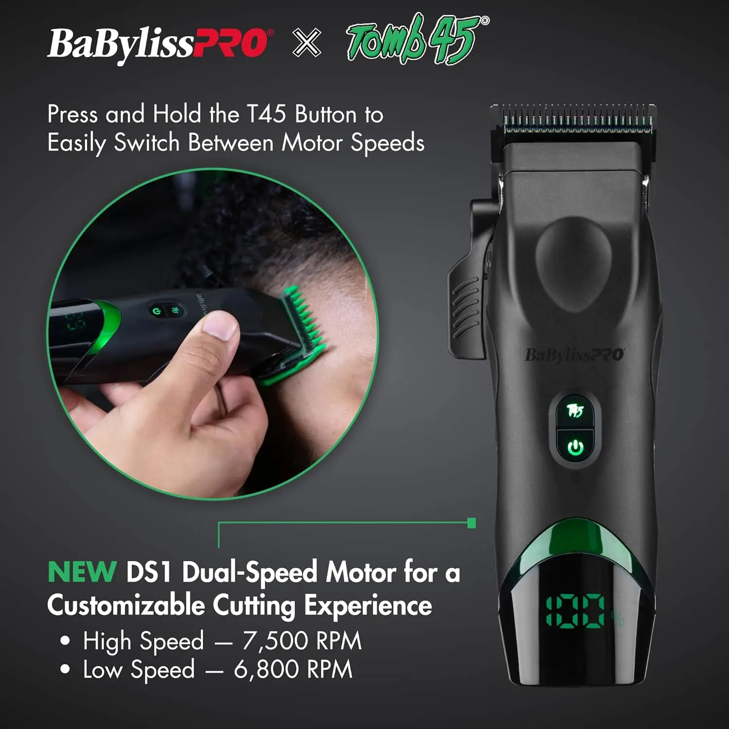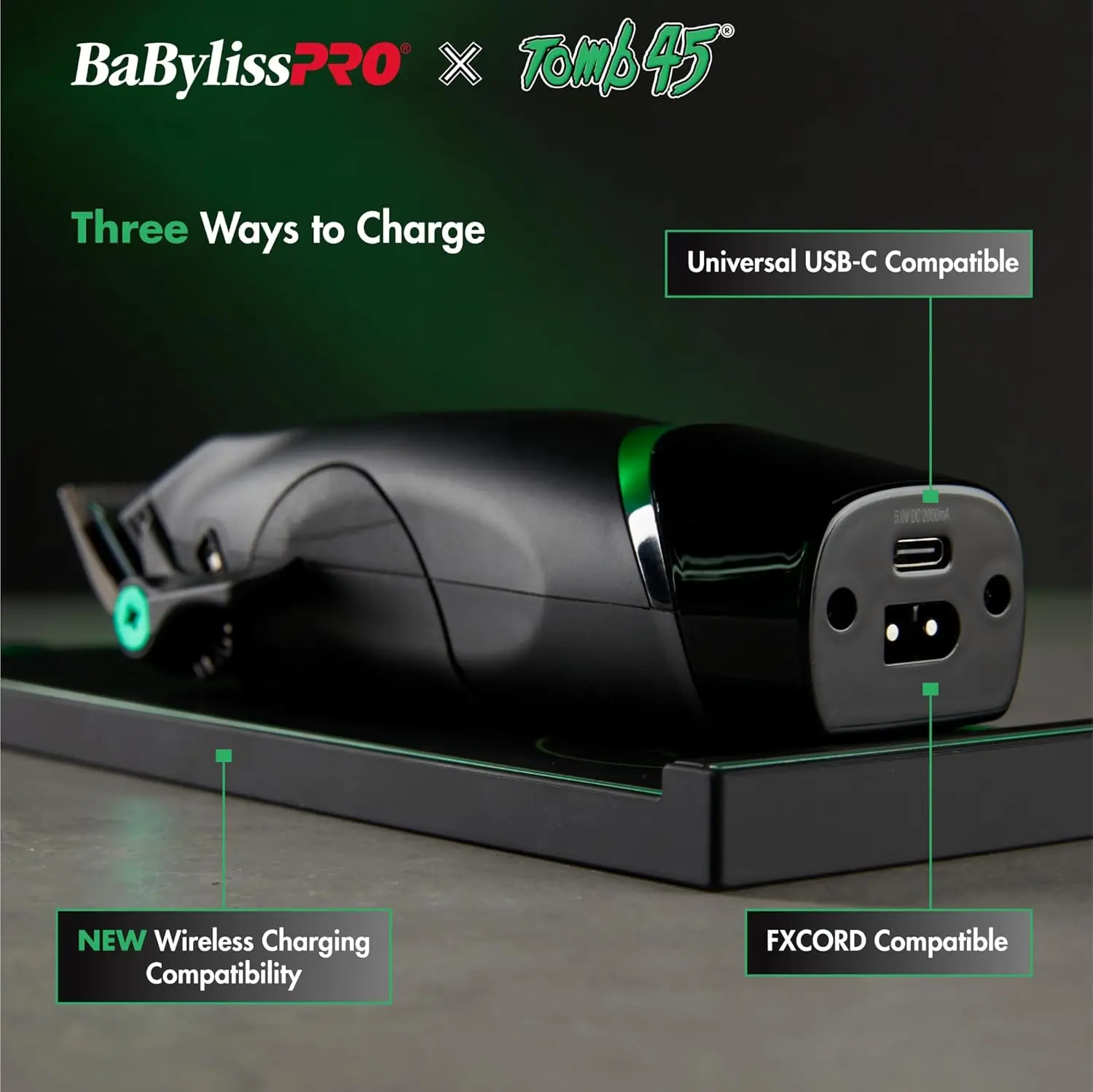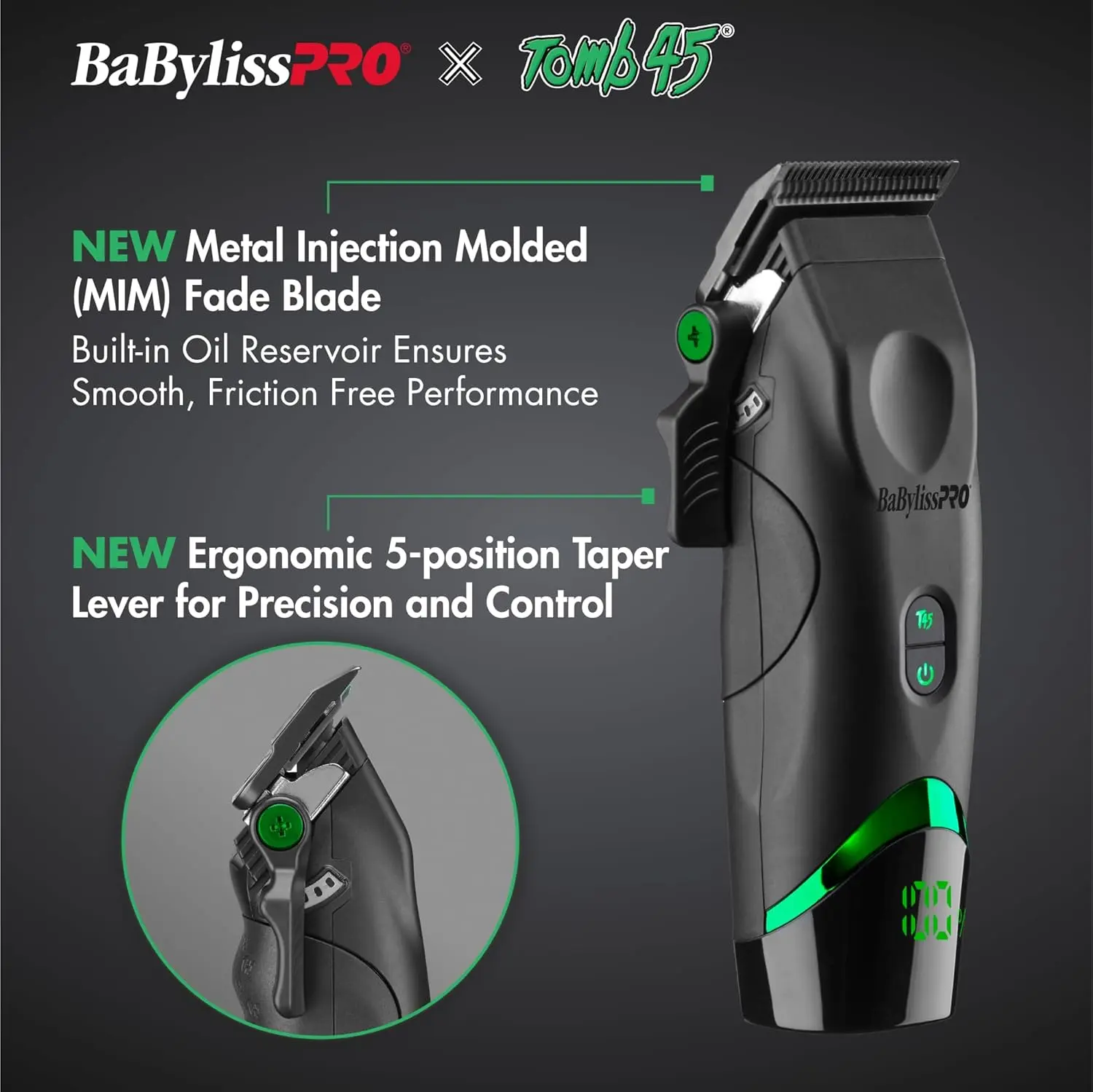 Elevate your barbering game with the BaBylissPRO Tomb45 Wireless Hair Clipper, a collaboration engineered for ultimate precision, power, and comfort. This professional-grade clipper boasts a suite of advanced features designed to meet the demands of even the most discerning barber. Experience uninterrupted performance with dual high-capacity lithium-ion batteries, providing an impressive runtime of up to 4 hours on a single charge. The innovative 5-position locking stretch taper lever offers exceptional versatility, allowing you to effortlessly create seamless fades and blends with unparalleled control. The black titanium metal injection molded (MIM) fade blade delivers consistently sharp, precise cuts, ensuring clean lines and impeccable detail work. Its exceptional durability guarantees long-lasting performance, even under the rigors of daily use. Designed with the barber’s comfort in mind, the clipper features a compact ergonomic design, incorporating a secure rubber grip and thoughtfully placed finger grooves. This ensures superior control and reduces hand fatigue during extended use, allowing you to focus on your craft and deliver exceptional results every time. The BaBylissPRO Tomb45 redefines wireless clipper performance.