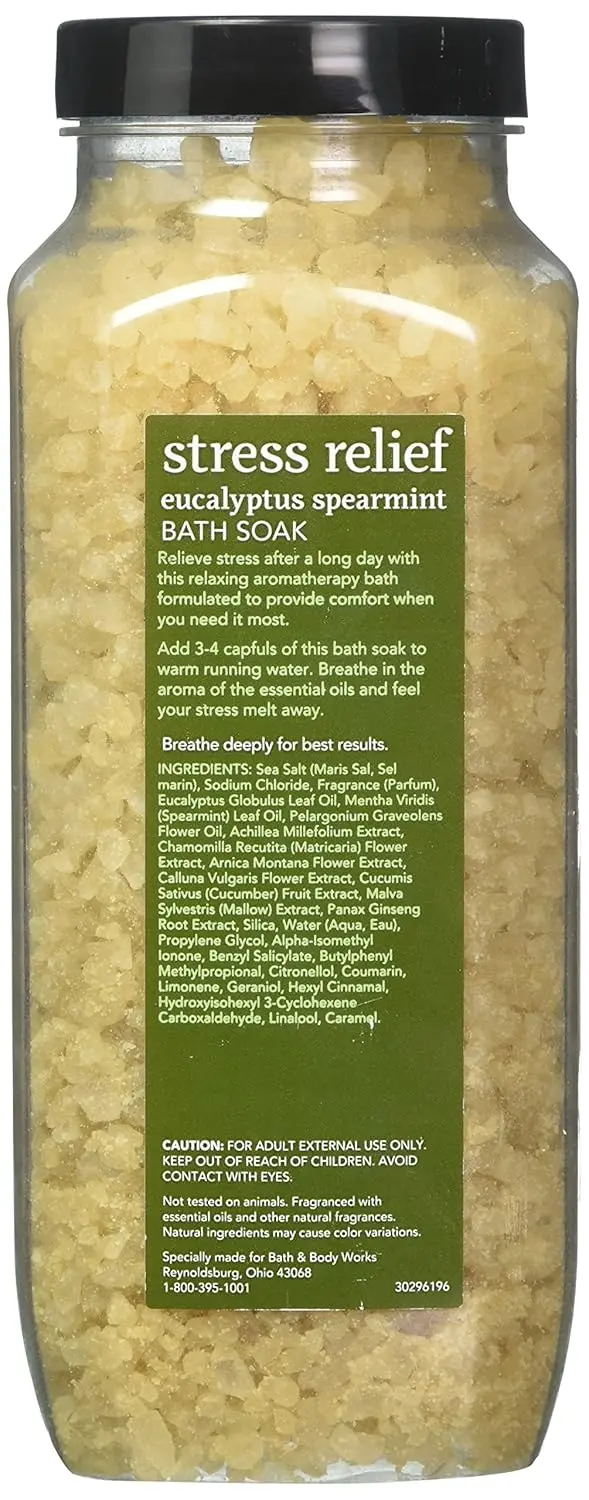 Indulge in a soothing and revitalizing bath experience with Bath & Body Works Aromatherapy Eucalyptus Spearmint Bath Soak. This luxurious soak, in a generous 17-ounce (481 g) size, is designed to transform your ordinary bath into a spa-like retreat. The invigorating blend of eucalyptus and spearmint essential oils creates a refreshing and uplifting aroma that helps to clear your mind and ease tension. Eucalyptus is known for its clarifying properties, promoting a sense of well-being and helping to decongest, while spearmint provides a cooling and stimulating effect, invigorating your senses and leaving you feeling refreshed. As you pour the bath soak into warm water, it dissolves quickly, releasing its aromatic fragrance and creating a milky, moisturizing bath. The formula is enriched with nourishing ingredients that help to soften and hydrate your skin, leaving it feeling smooth, supple, and revitalized. Allow the stress of the day to melt away as you soak in the comforting warmth and inhale the invigorating scent. Perfect for unwinding after a long day, easing muscle tension, or simply creating a moment of self-care, this bath soak is a must-have addition to your relaxation routine. Enjoy the harmonizing blend of eucalyptus and spearmint essential oils, creating a truly rejuvenating and therapeutic bath experience that nourishes your body and mind.