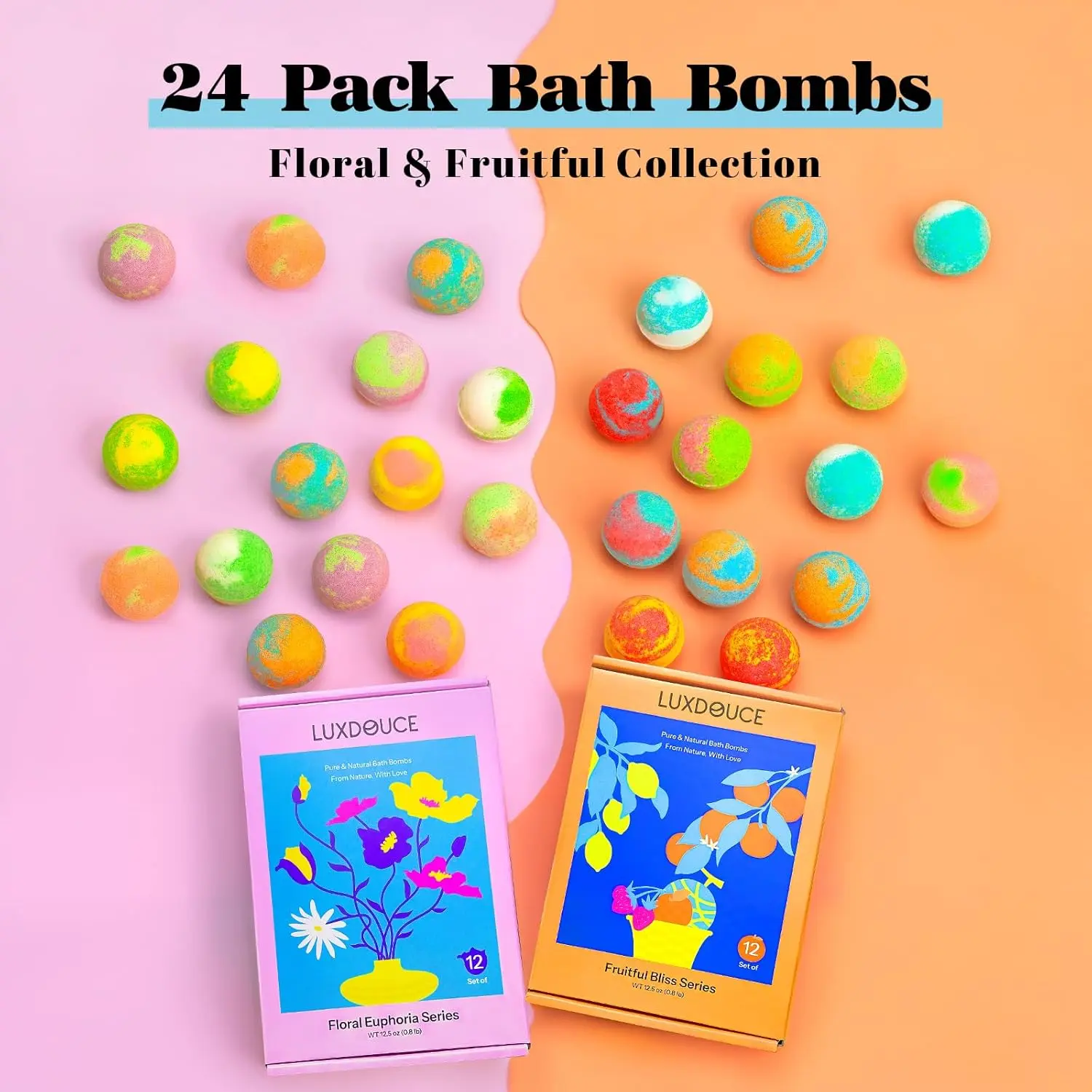 Indulge in the ultimate relaxation experience with the LUXDOUCE Bath Bombs Gift Set! This luxurious set features 24 uniquely scented bath bombs, each designed to transform your ordinary bath into a soothing and aromatic spa getaway. Immerse yourself in a world of fragrant bliss with our carefully curated collection of 12 delightful scents, ranging from calming florals to invigorating fruits. Unwind with the refreshing essence of Eucalyptus, the sweet aroma of Gardenia, or the calming notes of Lavender. Experience the classic elegance of Rose and Jasmine, or awaken your senses with the cool freshness of Peppermint. For a zesty twist, enjoy the vibrant scents of Orange and Lemon, or escape to a tropical paradise with Pineapple, Watermelon, Papaya, and Peach.