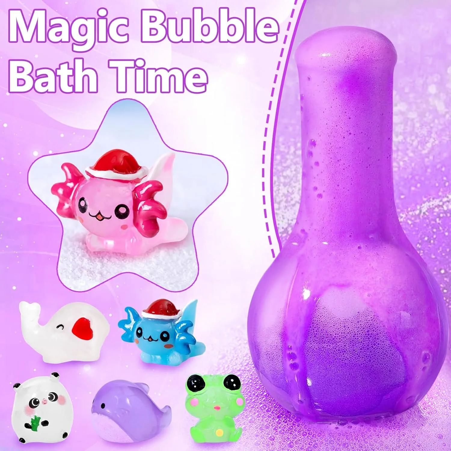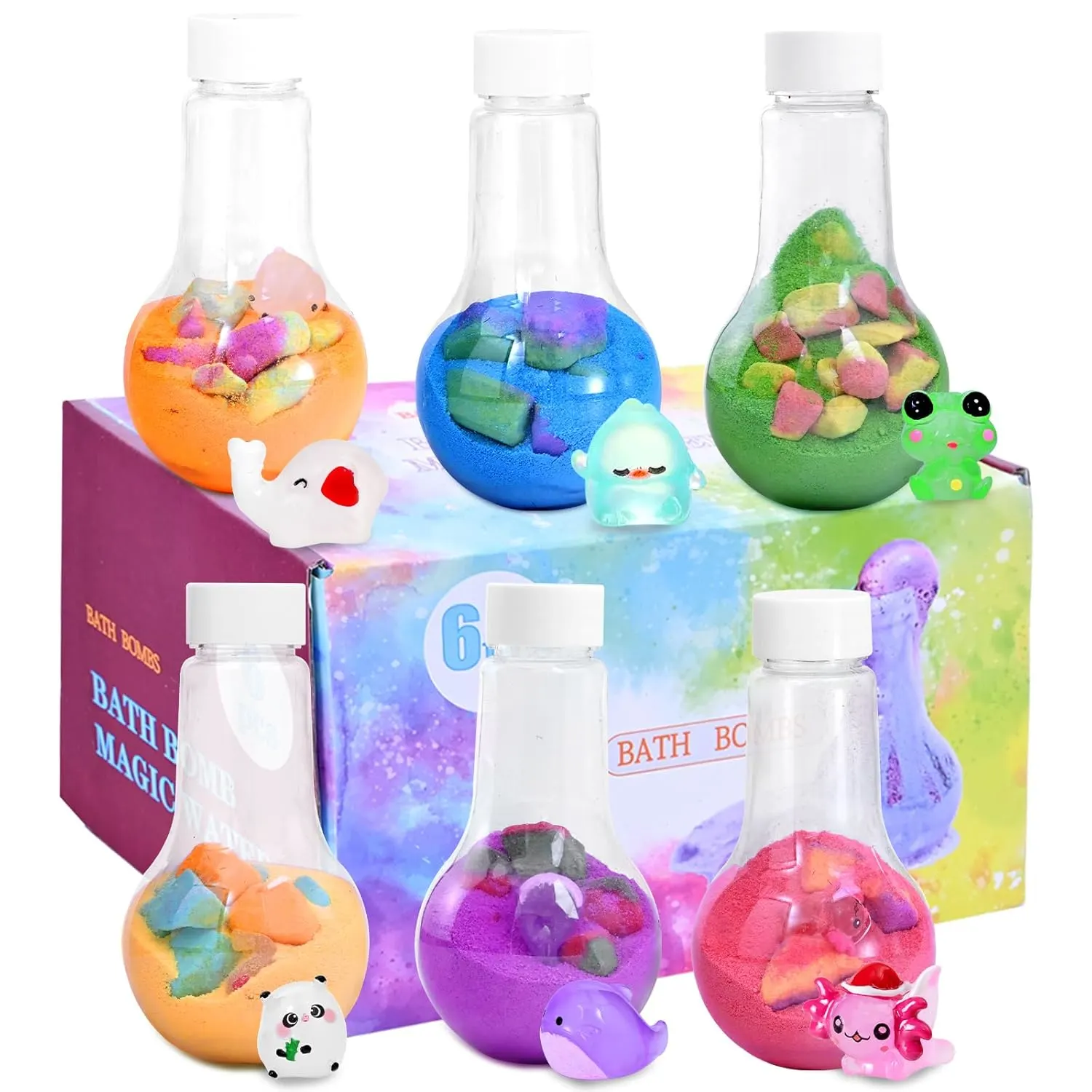 Transform bath time into an exciting adventure with our Bath Bombs with Surprise Toys! This delightful gift set includes 6 handcrafted kids bath bombs, each containing a surprise animal-themed toy. But the surprises don’t stop there! The beautiful gift box also holds 6 additional mystery animal toys, adding an element of blind box fun. Watch as your child’s eyes light up as they drop a potion bath bomb into warm water and witness a colorful, bubble-filled eruption with a soothing fruity scent. It’s like a mini science experiment right in the tub!