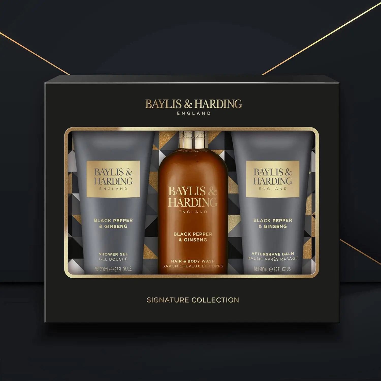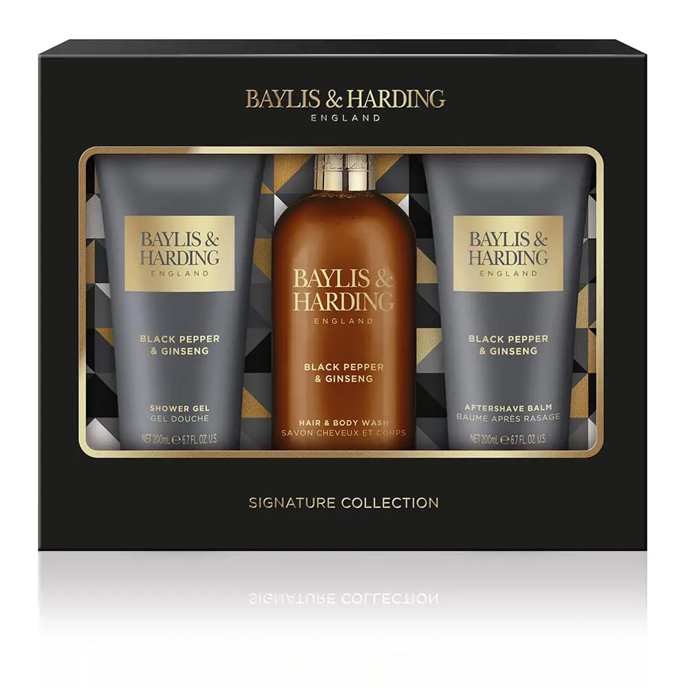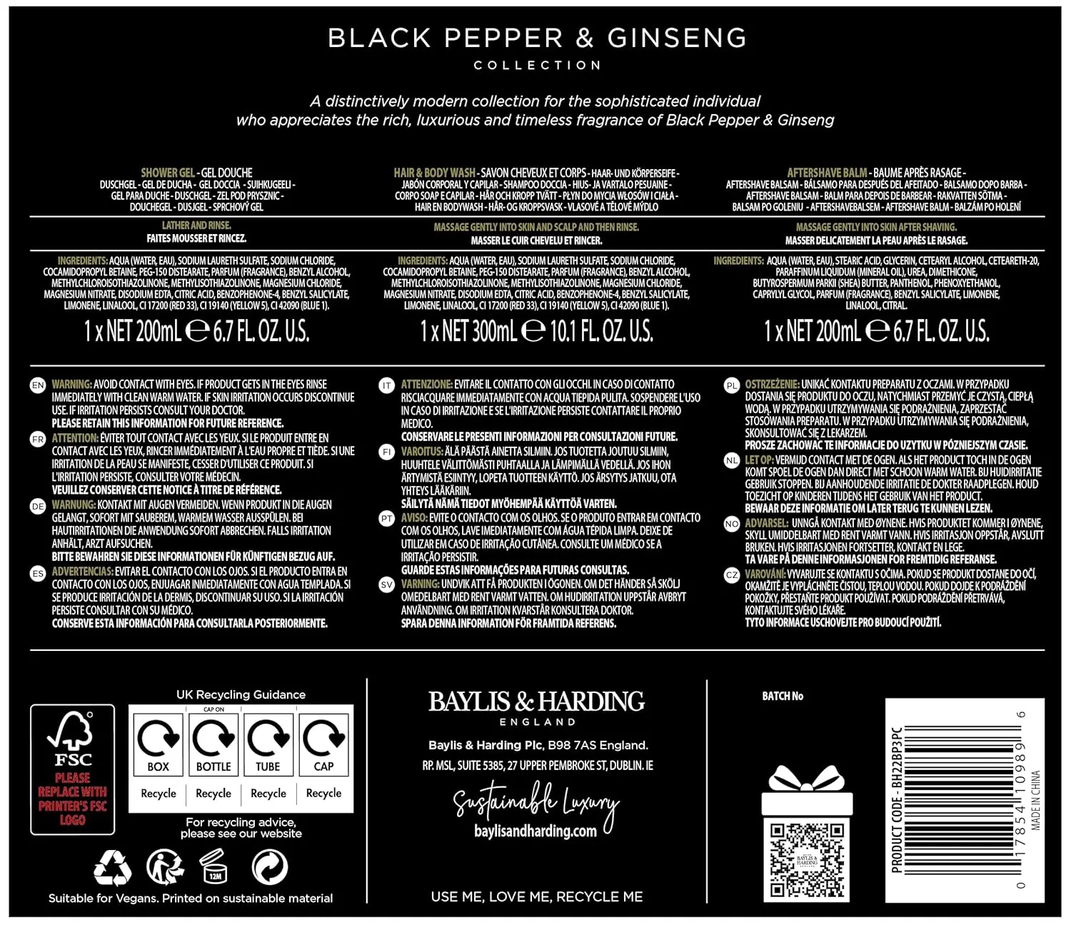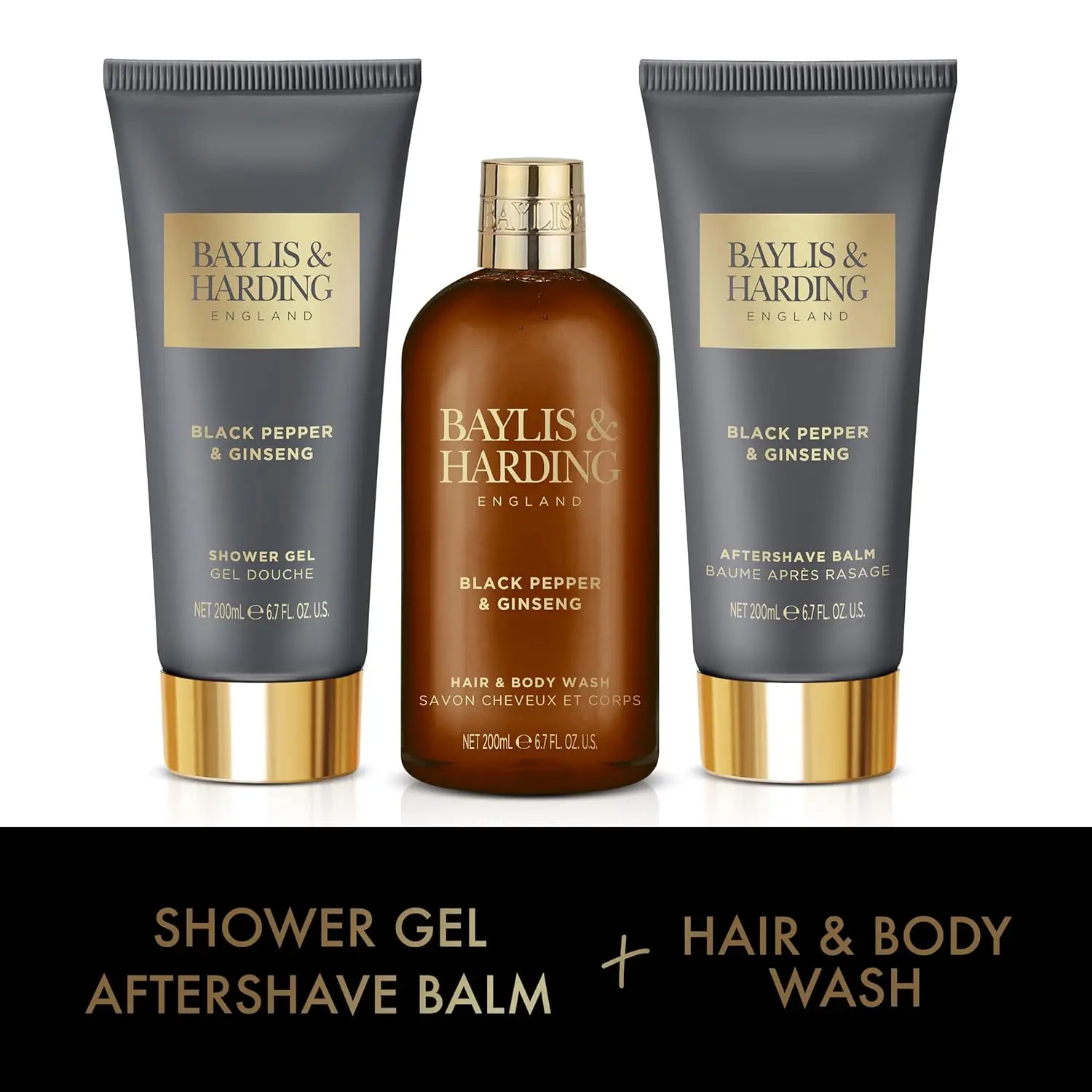 Indulge in the ultimate grooming experience with the Baylis & Harding Black Pepper & Ginseng Gift Set. This classic and stylish collection provides the perfect routine for cleansing, invigorating, and moisturizing your skin. The set includes a 300ml Hair & Body Wash, a 300ml Shower Gel, and a 200ml Aftershave Balm, all infused with the rich, timeless fragrance of Black Pepper & Ginseng. The Hair & Body Wash effectively cleanses your hair and body, leaving you feeling refreshed and revitalized. The Shower Gel gently cleanses and invigorates the skin, providing a luxurious lather and a long-lasting fragrance. The Aftershave Balm soothes and moisturizes the skin after shaving, reducing irritation and leaving your skin feeling smooth and hydrated. This gift set is suitable for vegans and is not tested on animals, making it a conscious choice for ethical consumers. The plastic-free outer packaging is 100% recyclable, further demonstrating our commitment to sustainability. Please note that the packaging may vary as we roll out our new design. Experience the perfect blend of luxury and responsibility with the Baylis & Harding Black Pepper & Ginseng Gift Set. It’s the ideal gift for yourself or a loved one.