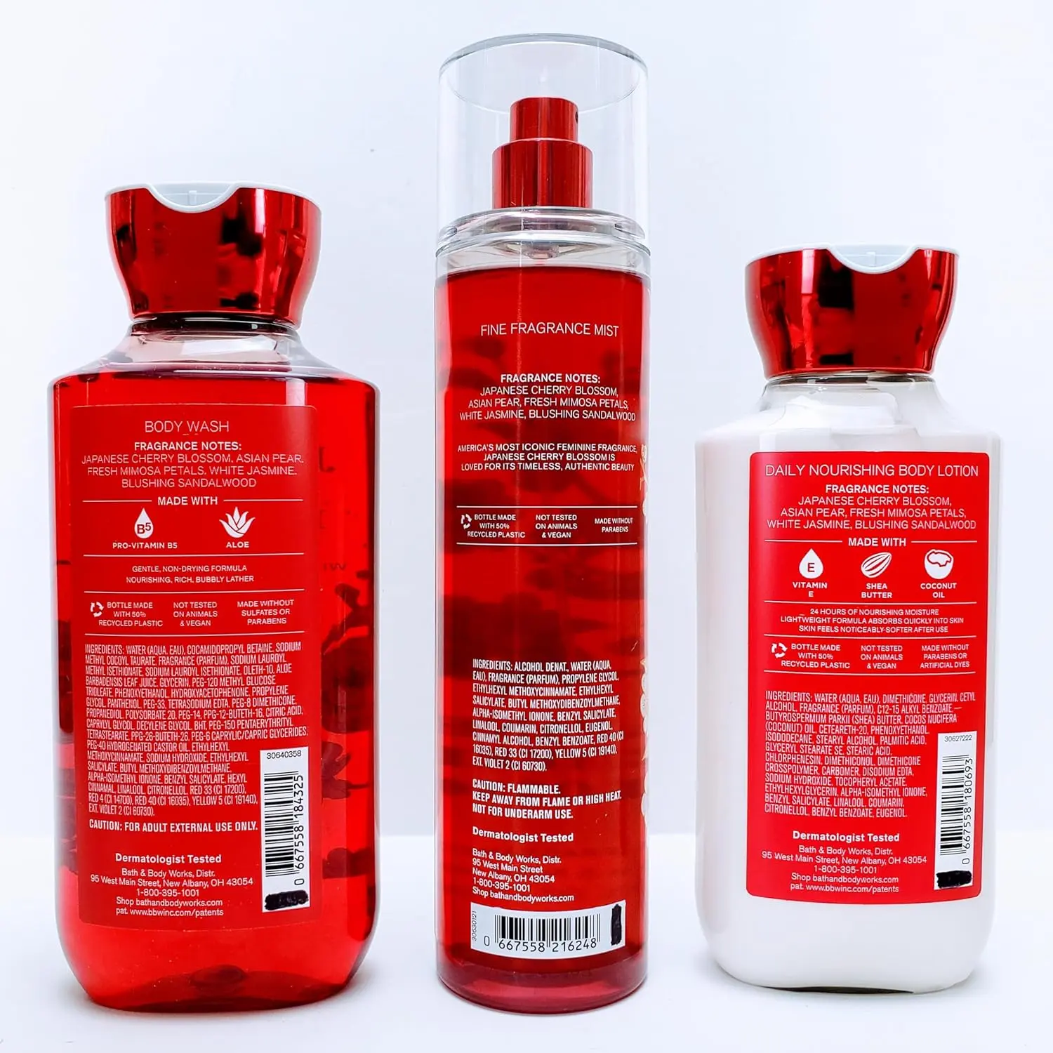 Indulge in the captivating allure of the BBW Japanese Cherry Blossom Set. This ultra-feminine fragrance is a sensual symphony of delicate floral notes and sparkling fruity accents, creating an unforgettable olfactory experience. The top notes tantalize with the crisp sweetness of Asian Pear and Fuji Apple, intertwined with the unique and juicy aroma of Ume Plum. This opening accord sets the stage for a heart of exquisite blossoms. The mid notes unfold with the iconic and romantic Japanese Cherry Blossom, complemented by the graceful Butterfly Lily, the classic Kyoto Rose, delicate Mimosa Petals, and intoxicating White Jasmine. The scent is further enhanced by a sensual blend of crystallized amber, kissed with the effervescent sweetness of raspberry champagne. This full-size trio, presented with cellophane wrapping, a beautiful ribbon, and a charming gift tag, makes it the perfect present for yourself or a loved one. Experience the luxury and sophistication of Japanese Cherry Blossom and let its enchanting fragrance transport you to a world of beauty and elegance. The long-lasting formula ensures you’ll enjoy the captivating scent throughout the day, leaving a trail of delicate floral and fruity notes wherever you go. This set is ideal for those who appreciate feminine fragrances with a touch of sophistication and sweetness. Perfect for everyday wear or special occasions, the Japanese Cherry Blossom scent is sure to become a signature fragrance.