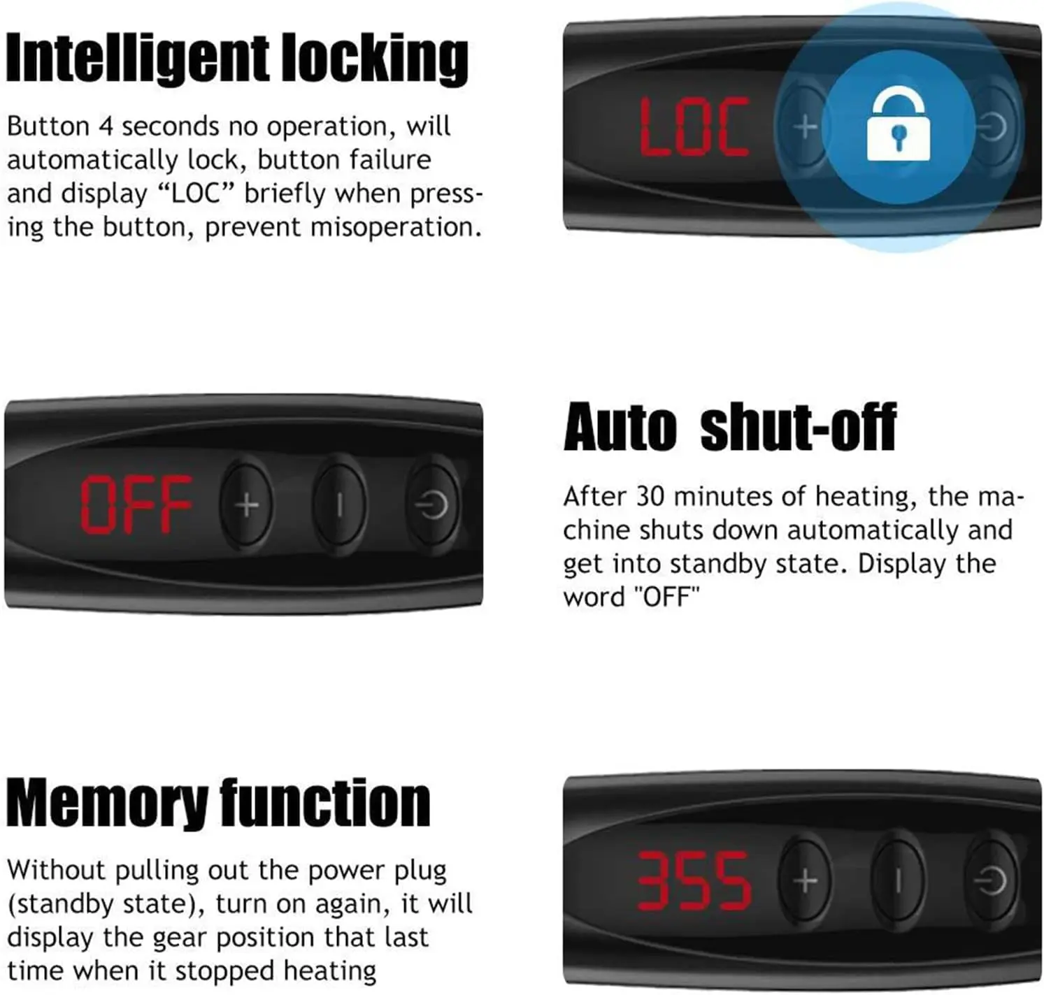 • Auto safety shut-off after 30 minutes.