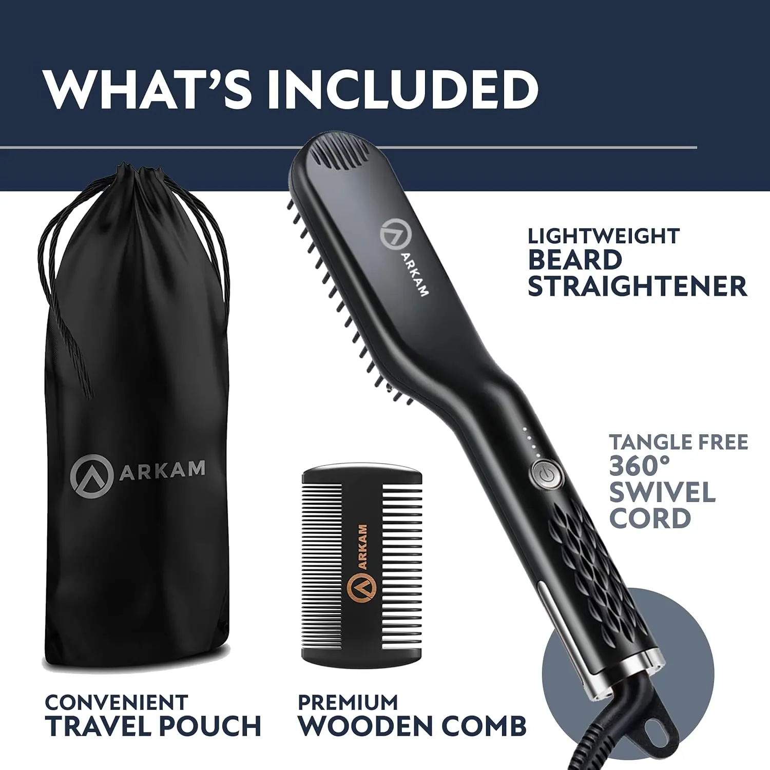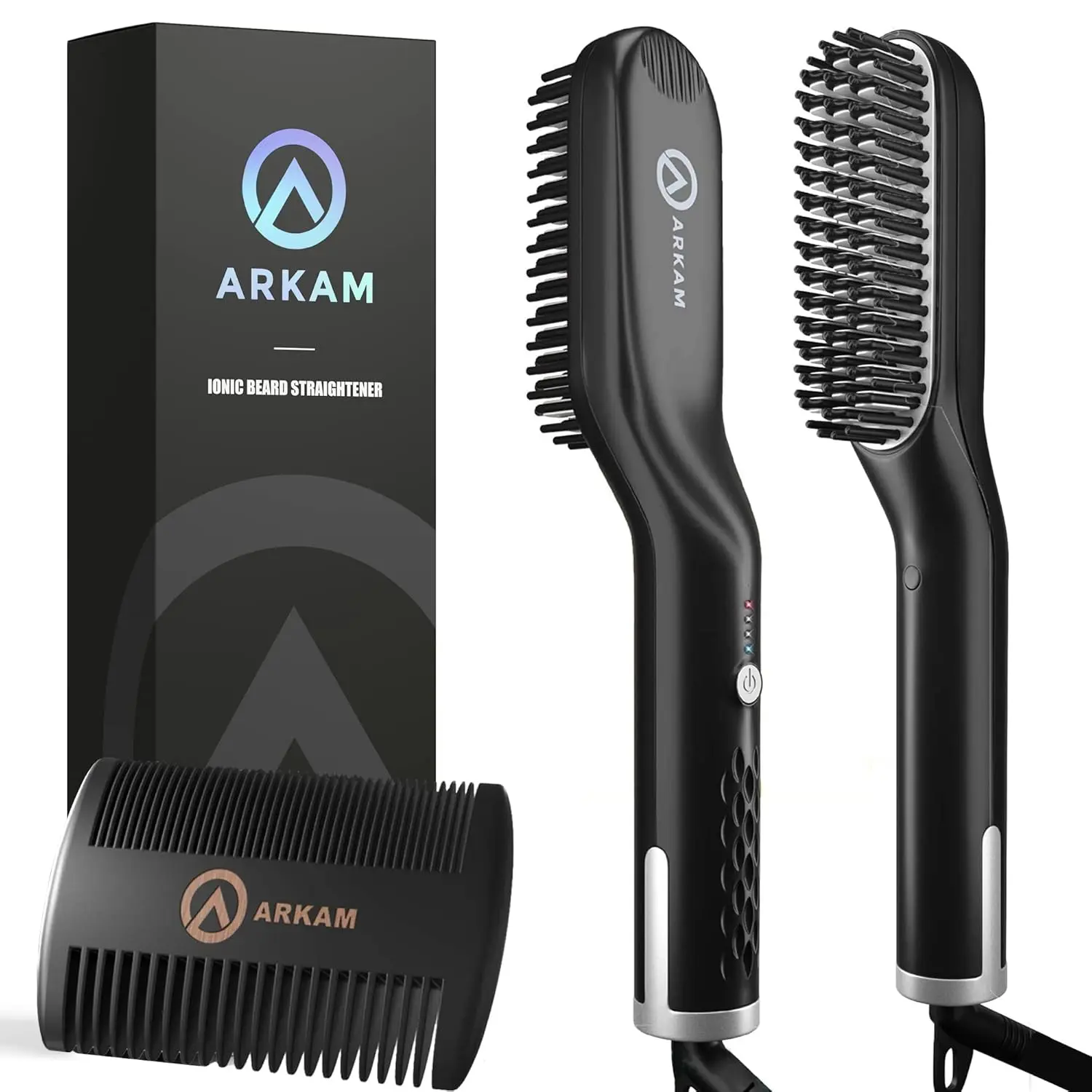 Tame your beard and achieve a perfectly groomed look with our Beard Straightener for Men! This heated brush kit is designed to straighten, smooth, and reduce frizz, giving you all-day results. Featuring 3 heat levels (300°F, 355°F, 400°F) to accommodate all hair types, from thin to thick and curly, you can easily customize the heat to your beard’s specific needs with our one-touch adjustment. Our Single Stroke Technology, combined with variable heat gauge and ION technology, allows you to groom and perfect your beard in a flash with a single brush stroke, saving you valuable time. The advanced ionic technology eliminates frizz and locks in moisture, leaving your beard looking smoother and healthier. For on-the-go grooming, the kit includes a comb and travel bag, making it the ultimate gift for men who want to stay suave all day long. Safety is paramount, so our hair straightener brush comes with a 30-minute auto shut-off, a 360° swivel cord, and supports 110-240 voltage. Get ready to experience the difference a quality beard straightener can make!