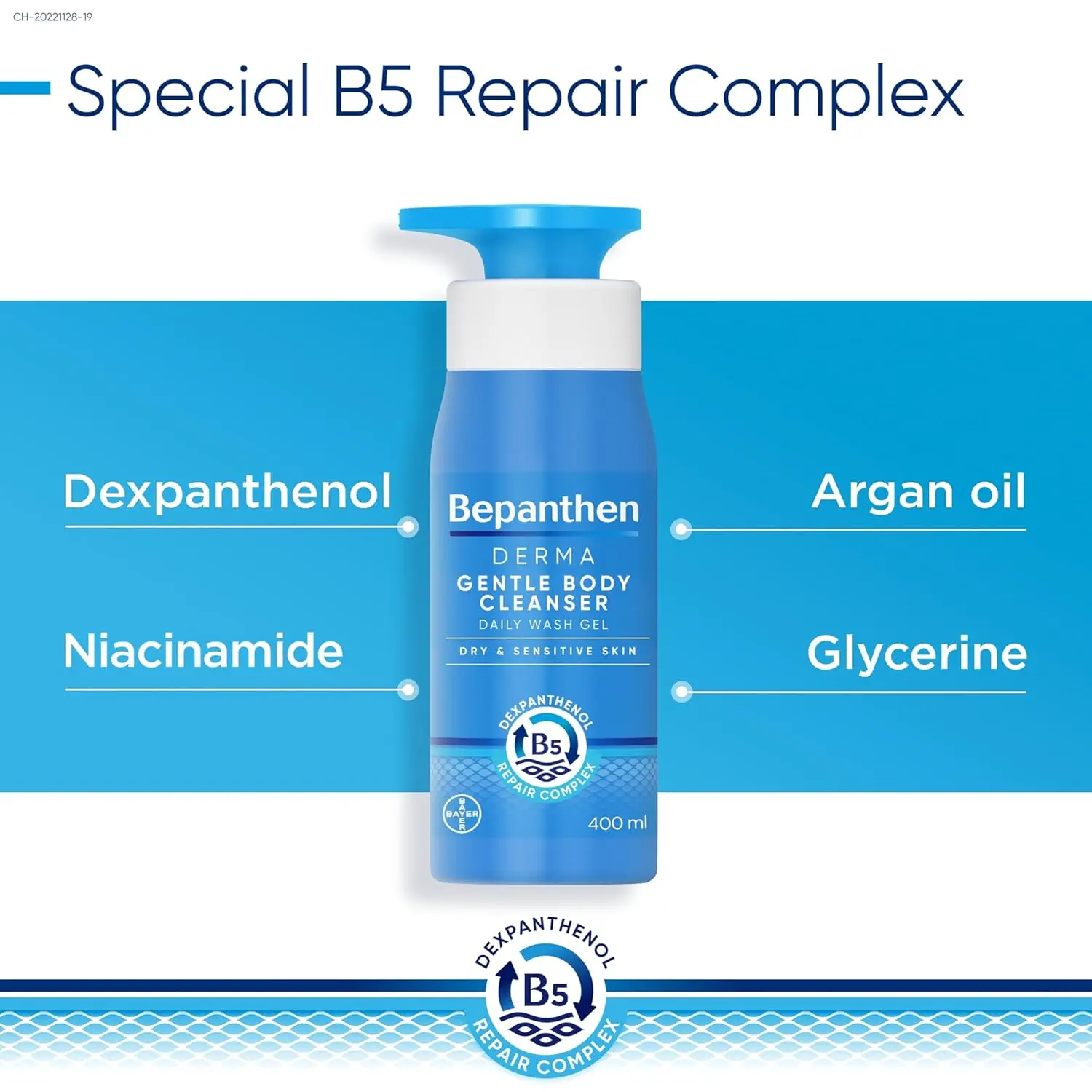 Soothe and cleanse dry, itchy skin with Bepanthen Derma Gentle Body Wash. This soap-free formula gently cleanses without stripping away essential moisture, leaving your skin feeling fresh, clean, and comfortable. Infused with a unique B5 Repair Complex, this body wash supports skin regeneration from the inside out. Dexpanthenol and niacinamide (vitamin B3) work together to nourish and repair the skin’s natural barrier, while natural lipids like argan oil and glycerin help to replenish moisture and prevent dryness.