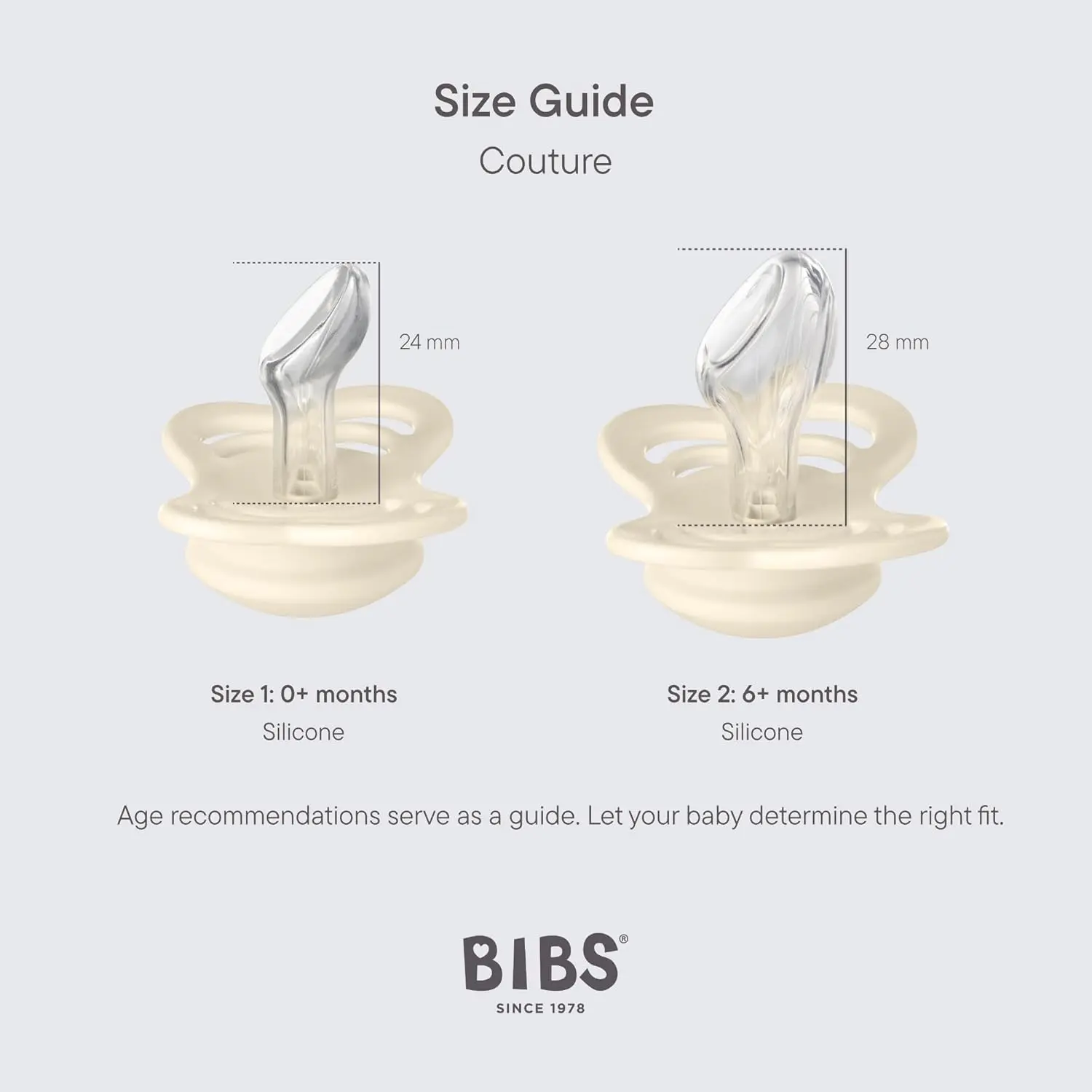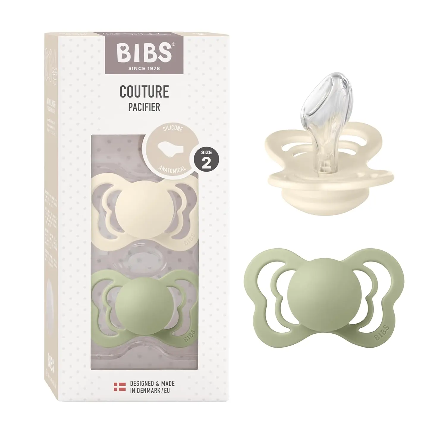 Soothe your little one with the trusted comfort and safety of Bibs Pacifiers. This 2-pack features size 2 pacifiers in a stylish Ivory/Sage color combination. Designed with your baby’s well-being in mind, these pacifiers are crafted from high-quality materials and adhere to the strictest safety standards. The anatomically shaped nipple provides optimal support for your baby’s jaw and gums, promoting healthy oral development. The nipple is made from food-grade silicone, ensuring a soft and gentle feel against your baby’s delicate skin. You can rest assured knowing that these pacifiers are 100 percent free from harmful substances like BPA, PVC, and phthalates. The lightweight and durable shield is constructed from Polypropylene (PP) plastic, offering long-lasting performance. Designed and manufactured in Denmark/EU, these pacifiers meet the stringent requirements of the European Standard EN 1400+A2, guaranteeing exceptional quality and safety. Give your baby the best with Bibs Pacifiers – a reliable choice for comfort and peace of mind.These pacifiers are not just functional, they are also aesthetically pleasing. The Ivory/Sage color combination adds a touch of sophistication, making these pacifiers a stylish accessory for your little one. Easy to clean and maintain, these pacifiers are a practical and hygienic choice for everyday use. Trust Bibs, a brand known for its commitment to quality, safety, and design.