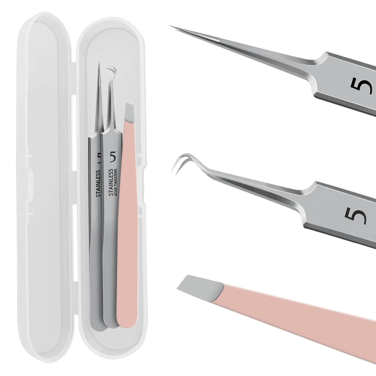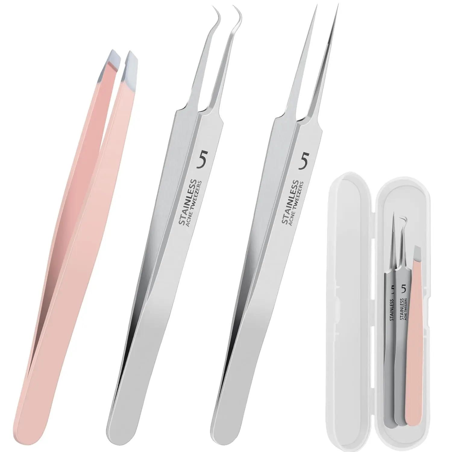 Comprehensive set with 2 acne tweezers and 1 eyebrow/ingrown hair tweezer. Durable stainless steel tools with anti-slip grip. Portable case included for on-the-go use.