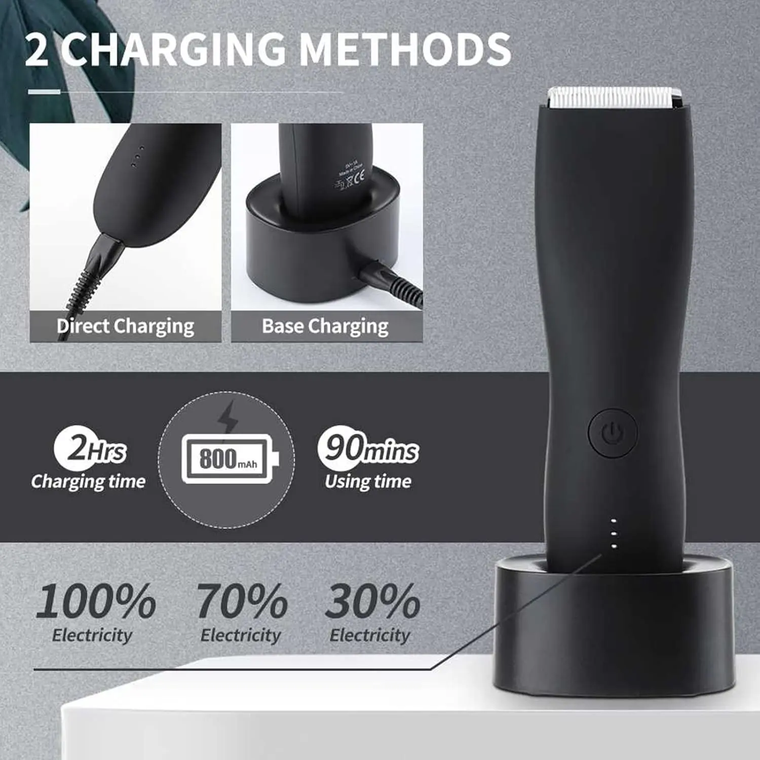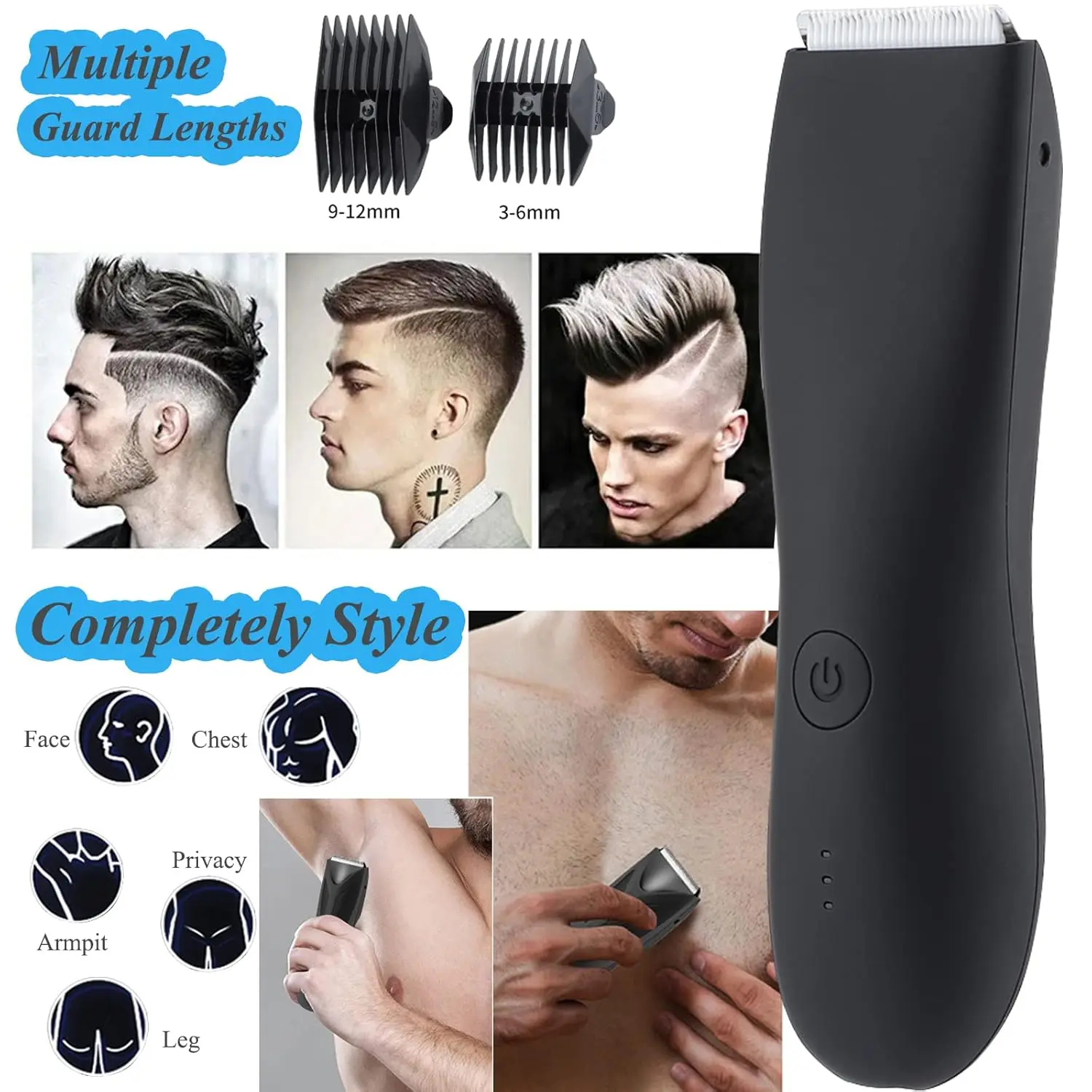 Achieve a confident and well-groomed look with our Body Hair Trimmer for Men! This specially designed groin trimmer features an ultra-sensitive ceramic blade and a high-power motor, ensuring effective yet gentle trimming for even the most intimate areas. Men deserve to maintain their personal grooming with the right tools. Say goodbye to embarrassing situations and hello to a presentable and confident you. Our trimmer eliminates cuts, nicks, snags, and burns, thanks to its anti-cut blade and powerful motor that make shaving faster and easier than ever before. Experience a smoother and more comfortable trimming experience today! The ergonomic design provides a secure grip, even when wet, allowing for effortless trimming of back hair, chest hair, pubic hair, bikini hair, and underarm hair. The waterproof construction allows for easy cleaning, as water washes away trimmings, preventing painful pulling. Enjoy low noise operation (less than 43db) and fast recharging with the included USB charging dock. A full charge provides 90 minutes of shaving time. The new version trimmer supports both TYPE-C charging and a charging dock. It’s so quiet, you can even use it to trim baby hair while they sleep! This versatile trimmer includes 2 reversible guards and 3 hair length settings (clean, 3-6MM, 9-12MM), making it perfect for grooming men’s pubic hair and body hair to your desired length. Comfortable and easy to use, it’s the ultimate tool for achieving a well-groomed and confident appearance.