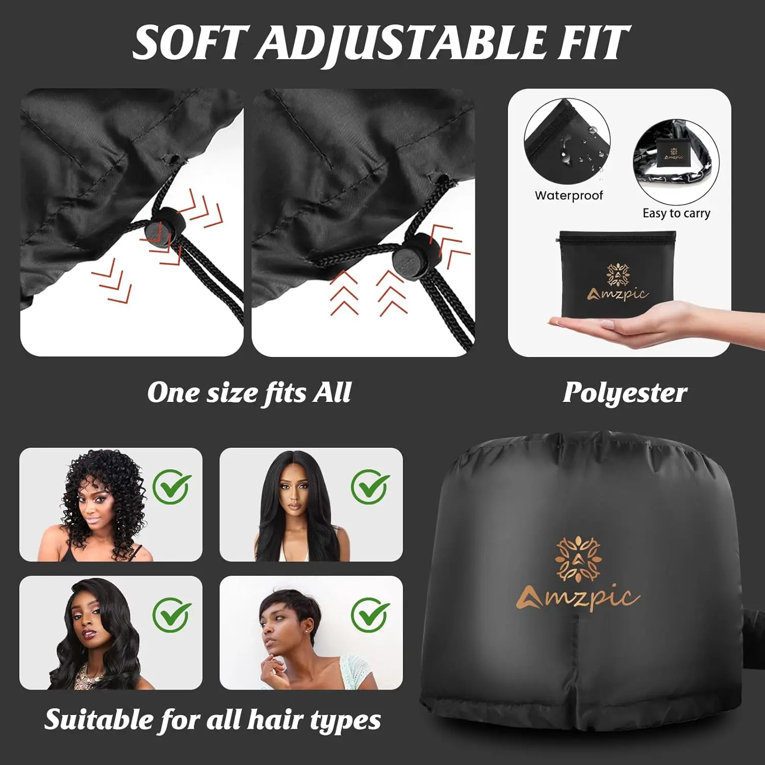 Crafted with premium, waterproof material, this hair dryer bonnet is built to last. It’s designed to withstand countless drying and conditioning sessions, making it a durable and reliable addition to your hair care routine.