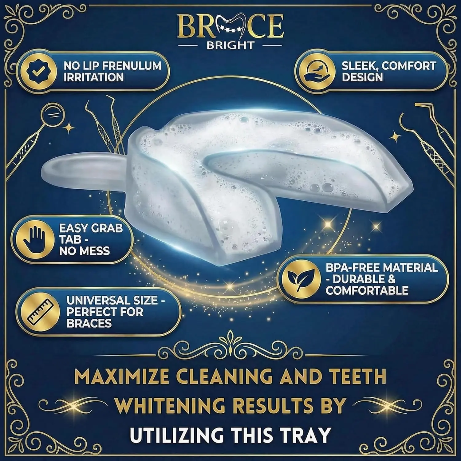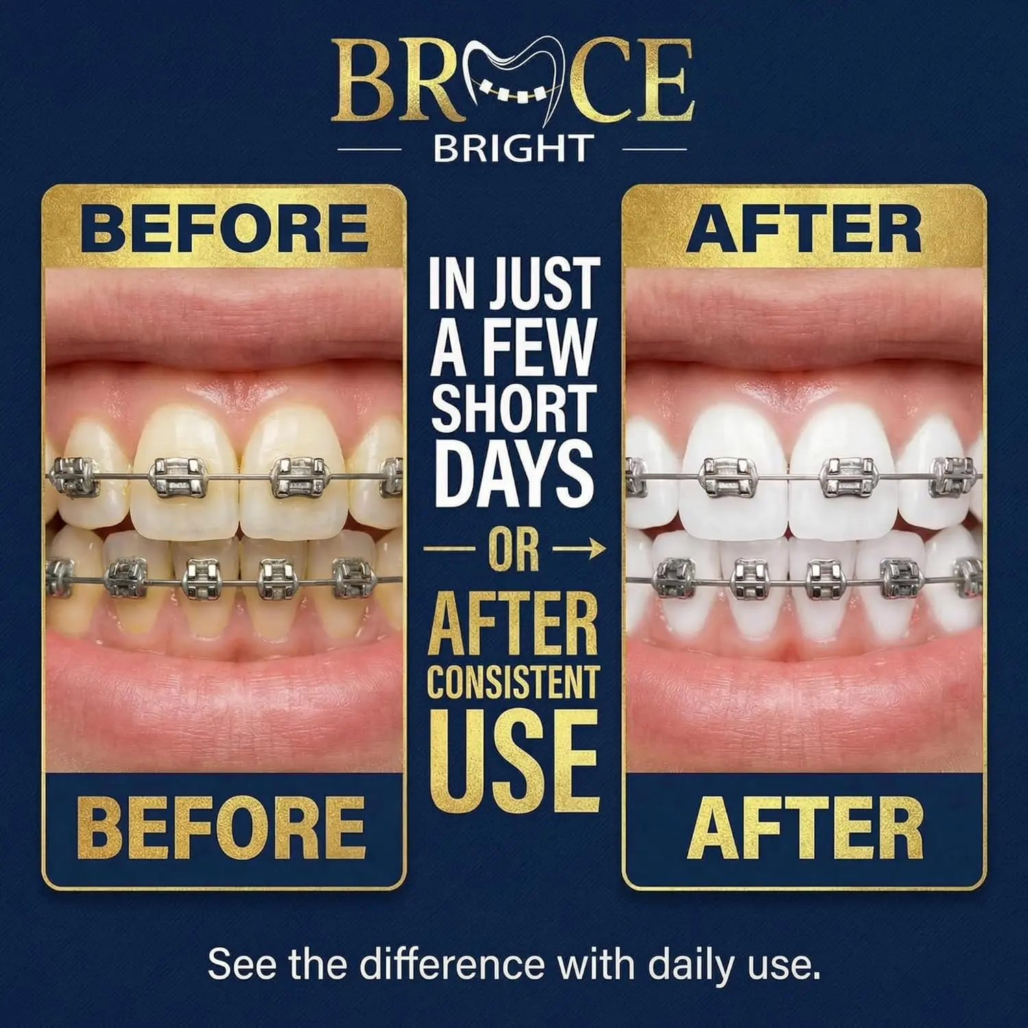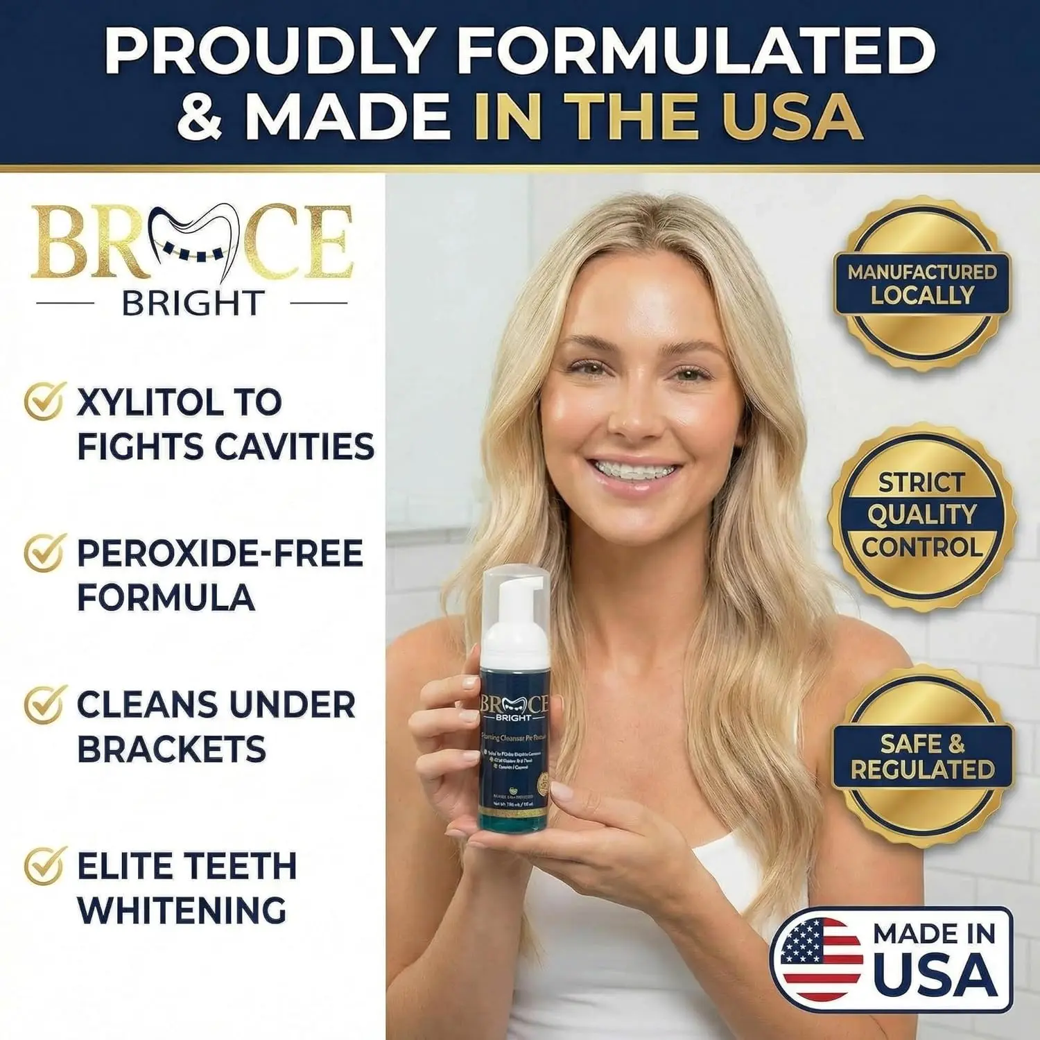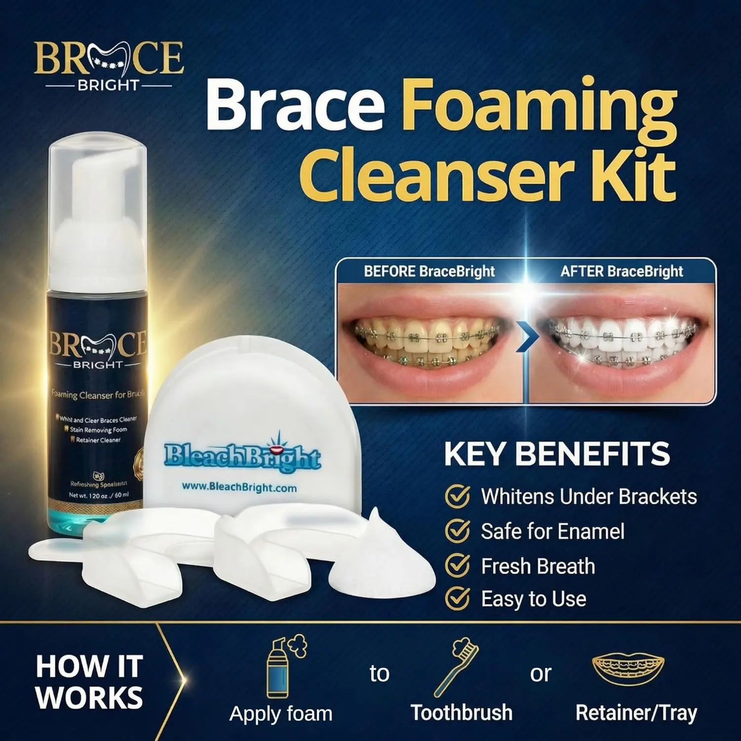 BraceBright Foam whitens teeth with braces without sensitivity. Peroxide-free formula cleans deep, fights cavities, & freshens breath. Safe for all braces & aligners!